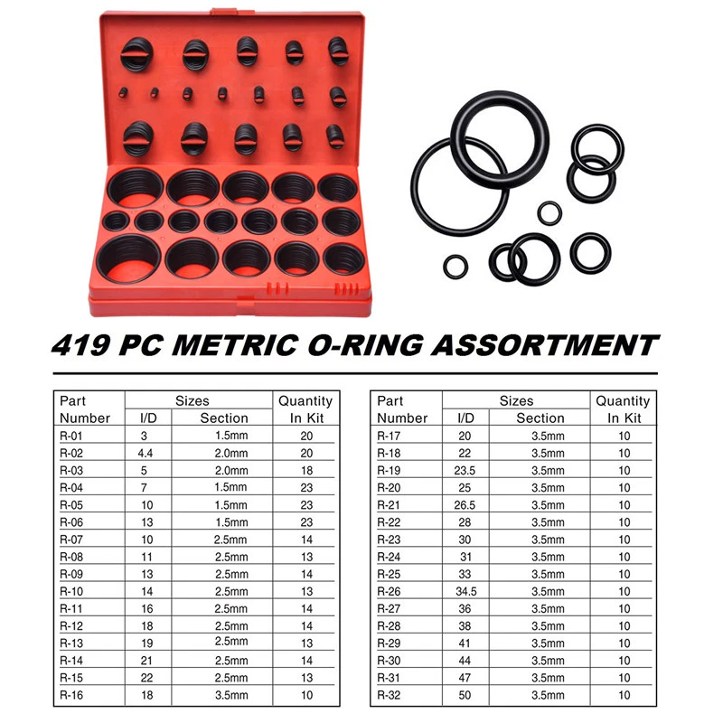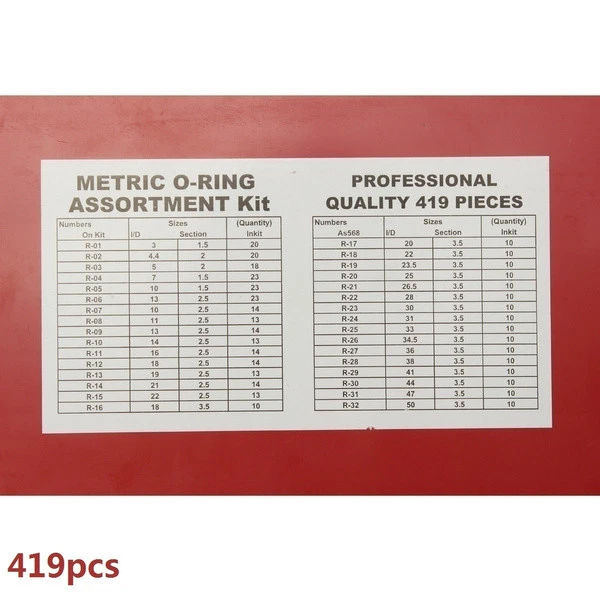 Features: Contains every o-ring size you will ever need Ideal for garages, general plumbers, mechanics, workshop Complete with storage case Case Size: Approx. 24.7x15.3x4.2cm/ 9.72x6.02x1.65"" Includes 32 Popular Metric Sizes: R-01 20pcs-3mmx1.5mm R-02 20pcs-4.4mmx2mm R-03 18pcs-5mmx2mm R-04 23pcs-7mmx1.5mm R-05 23pcs-10mmx1.5mm R-06 23pcs-13mmx1.5mm R-07 14pcs-10mmx2.5mm R-08 13pcs-11mmx2.5mm R-09 14pcs-13mmx2.5mm R-10 13pcs-14mmx2.5mm R-11 14pcs-16mmx2.5mm R-12 14pcs-18mmx2.5mm R-13 13pcs-19mmx2.5mm R-14 14pcs-21mmx2.5mm R-15 13pcs-22mmx2.5mm R-16 10pcs-18mmx3.5mm R-17 10pcs-20mmx3.5mm R-18 10pcs-22mmx3.5mm R-19 10pcs-23.5mmx3.5mm R-20 10pcs-25mmx3.5mm R-21 10pcs-26.5mmx3.5mm R-22 10pcs-28mmx3.5mm R-23 10pcs-30mmx3.5mm R-24 10pcs-31mmx3.5mm R-25 10pcs-33mmx3.5mm R-26 10pcs-34.5mmx3.5mm R-27 10pcs-36mmx3.5mm R-28 10pcs-38mmx3.5mm R-29 10pcs-41mmx3.5mm R-30 10pcs-44mmx3.5mm R-31 10pcs-47mmx3.5mm R-32 10pcs-50mmx3.5mm Package Included: 1 x 419Pcs Assorted O Ring Rubber Seal Set