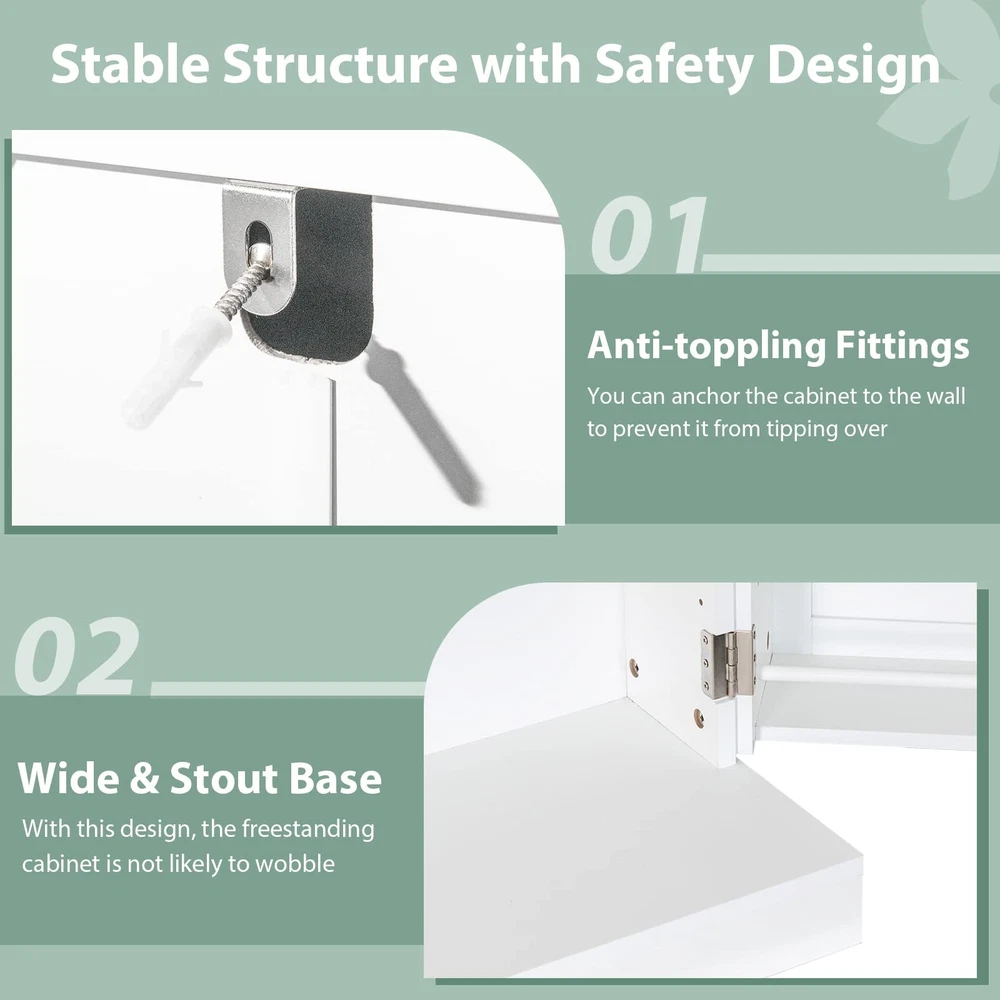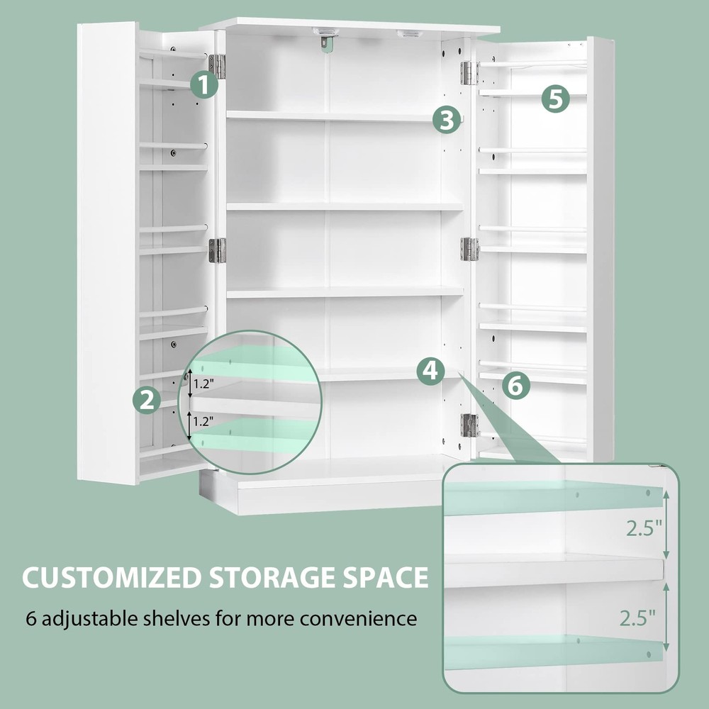 [Unlock Storage Potential]: Enjoy a well-organized culinary space with this kitchen pantry, featuring 5 roomy shelves and 12 spice racks on double doors, each safeguarded by a guardrail. This cabinet is your go-to for quick, clutter-free access to spices and more! [Your Space, Your Way]: Revel in the flexibility of 6 adjustable shelves, designed to accommodate a spectrum of sizes from tall bottles to bulk storage. Each shelf offers a choice of 3 distinct height settings, with two clearance options—1.2" or 2.5"—to suit your specific storage desires [Anti-tipping Kit]: Bolster your peace of mind with an anti-tipping kit that firmly grounds your cabinet. Coupled with a robust base, it’s designed for unwavering stability. This ensures safety for you and your home, giving you confidence in every use. [Contemporary & Stylish Design]: Featuring a sleek, modern design, this kitchen pantry will add a touch of elegance to your kitchen while seamlessly integrating with your existing furnishing style. It is supposed to be suitable for different home decoration. [Multi-Room Use]: Beyond the kitchen, this freestanding cabinet is a stylish storage superstar. It is ready to bring order and charm to living rooms, offices, or any space that craves a touch of class and utility.