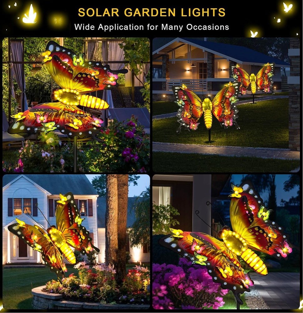 41" Solar Butterfly Garden Lights - Enchanting Outdoor Decor for All Seasons ‹ › ‹ › ‹ › ‹ › ‹ › ‹ › ‹ › ‹ › ‹ › 41" Solar Butterfly Garden Lights Enchanting Outdoor Decor for All Seasons Features: Crafted from durable iron material featuring a double butterfly wing three-dimensional design. Showcases 10 colorful small butterflies flanking a beautifully designed large butterfly. Body length of 20 inches, with a 41-inch ground insert for optimal placement. Colorful butterfly wings enhance realism during the day, while warm lights create a charming ambiance at night. Built-in high-efficiency solar panel ensures 6-8 hours of sunlight charging for 8-10 hours of automatic lighting at night. Waterproof and durable, designed with IP65 materials, resistant to rain, snow, frost, and high temperatures. Simple installation—just insert into the soil, no external power source necessary. Benefits: Brings a whimsical touch to your garden, patio, lawn, or backyard. Perfect for fairy gardens, pathways, and as unique decorative lights. Ideal as a thoughtful gift for birthdays, Mother's Day, or as horticultural art gives that brings joy and beauty. Provides 8-10 hours of magical illumination to enhance your outdoor space at night. Guaranteed satisfaction, with a promise of a free replacement if needed. Why choose our Solar Butterfly Garden Lights? Transform your outdoor space into a captivating landscape with our enchanting Solar Butterfly Garden Lights. Made from high-quality iron and designed to reflect nature's beauty, these lights not only add charm to your garden during the day but also illuminate your nights with a warm glow. Designed for simplicity and durability, these solar lights withstand the elements while offering you the convenience of easy installation. Don't miss the opportunity to brighten your garden and elevate the ambiance—bring home our Solar Butterfly Garden Lights and light up a happy life! Shipping Free & Fast Shipping - We offer free shipping to most of the USA with a normal delivery time of 3-7 days. However, due to the current situation, additional delivery time (up to 3 weeks) may be required for some items. Alternative Carriers - We may use alternative carriers (e.g. USPS, FedEx, UPS, etc.) to ensure your package arrives safely and on time. Due to the use of multiple carriers, we are unable to provide a tracking number automatically. Handling Time - Orders are processed and shipped within 1-2 business days of receiving cleared payment. Shipping Restrictions - Shipping to Alaska, Hawaii, Puerto Rico, Guam, and other US territories may incur shipping charges or delivery restrictions. Please contact us before ordering, or your order can be refunded/cancelled. State Restrictions - There may be restrictions based on your state of purchase. For example, certain items may not be shipped to California due to state regulations. Contact for Tracking Updates - If you require tracking updates or have any concerns about the delivery of your order, please feel free to contact us, and we will be happy to assist you. Return Please see our eBay Return Policy. Thank you. Payment We accept all major credit cards, PayPal, and Apple Pay for your convenience. Your payment information is secure and encrypted to ensure a safe and seamless transaction. Please complete your payment within 3 days of purchase to avoid any delays in shipping. Feedback Your feedback is extremely important to us. We strive to provide the best products and customer service possible. If you are satisfied with your purchase, please take a moment to leave us a positive review. If you have any concerns or issues with your order, please contact us before leaving negative feedback. We are committed to resolving any problems and ensuring your satisfaction. Contact Us If you have any questions or concerns, please feel free to reach out to our customer support team. You can contact us through the eBay messaging system. We are available Monday to Friday, 9:00 am to 5:00 pm EST, and we will do our best to respond to your inquiry within 24 hours. Thank you for supporting our small family business! UPC: Not Set Unit Quantity: 3 lb Features: Waterproof,Solar,Colorful,Durable,Easy Installation Theme: Butterflies Light Color: Warm White Mounting: Stake Control Style: Switch Material: Metal,Iron Smart Home Compatibility: Not Set Labels & Certifications: Not Set Type: Garden Decor Brand: Unbranded Power Source: Solar Installation Area: Outdoor Sensor Type: Light Lighting Technology: Not Set Number of Lights: 5 Color: Solar Butterfly Lights Number of Settings: Not Set Style: Not Set Energy Star: Not Set MPN: Not Set EC Range: Not Set Finish: Not Set Size: Large Power Consumption: Not Set Bulb Shape Code: Not Set Voltage: Not Set IP Rating: IP65 Item Diameter: Not Set Country/Region of Manufacture: Not Set Color Temperature: Not Set Lumens: Not Set Bulb Life Hours: Not Set Model: Not Set Item Height: 41 in Item Length: Not Set Item Weight: 3 lb Item Width: Not Set Unit Type: lb
