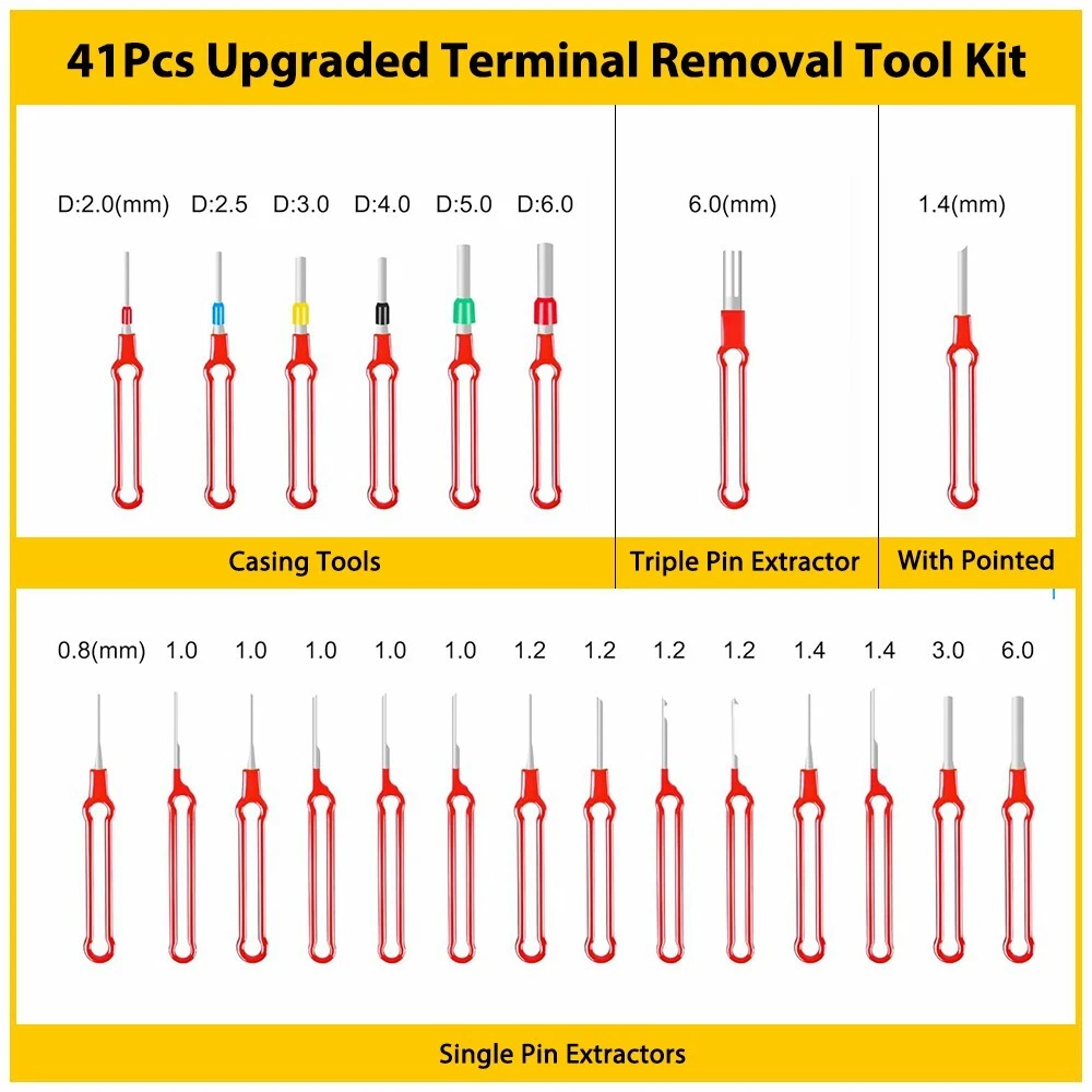 Fit for: Compatible with most connector terminals, our kit suits various applications—cars, home appliances, motorcycles, and more. Specifications: Product Material: Stainless steel 301+plastic Color: Blue ? Features: *High-quality Terminal Tool Made of high-quality stainless steel and durable plastic to ensure our long-term use without deformation. *Easy to Use The electric needle removal tool is easy to use, push and pull the terminal pin with the connector needle removal tool, you can effortlessly remove from the wire harness connector without causing any damage. *Portable 41Pcs Terminal Removal Tool Kit Connector Electrical Wire Pin Ejector Extractor Fit for: Compatible with most connector terminals, our kit suits various applications—cars, home appliances, motorcycles, and more. Specifications: Product Material: Stainless steel 301+plastic Color: Blue ? Features: *High-quality Terminal Tool Made of high-quality stainless steel and durable plastic to ensure our long-term use without deformation. *Easy to Use The electric needle removal tool is easy to use, push and pull the terminal pin with the connector needle removal tool, you can effortlessly remove from the wire harness connector without causing any damage. *Portable The pin removal tool set includes a protective bag for easy storage and portability. Small and lightweight, it is suitable for use anytime,anywhere. *Wide Application Suitable for various connector terminals in automobiles, motorcycles and electronic vehicles, the terminal ejection kit is widely used and reliable. *Quality Test All products were tested for performance and to ensure the accurate parameter for your vehicle. Packaging Include: 41 x Terminal Removal Tools 1 x Protective Bag Item Specifics Brand : Unbranded Universal Fitment : Yes Product Material : Stainless steel 301 plastic Color : Red Type : Terminal Removal Tool Design : Long-handle design Manufacturer Warranty : 1 Year Packaging Include 1 : 41 x Terminal Removal Tools Packaging Include 2 : 1 x Protective Bag Features 1 : High-quality Terminal Tool Features 2 : Easy to Use Features 3 : Portable Features 4 : Wide Application Features 5 : Quality Test Fit for 1 : Compatible with most connector terminals, Fit for 2 : cars, home appliances, motorcycles, and more. Payment (1) Instant PayPal payment is the preferred method of payment. (2) We also accept payment via PayPal, DebitCard, Visa, MasterCard, Discover. (3) We will only ship to the confirmed PayPal shipping address given with the payment. (4) If you want to ship to other address, please change your PayPal shipping address before you make payment. (5) To avoid initiating an unpaid item claim, please pay within 7 days. Shipping (1) We will ship your item(s) within 24 hours. (2) We ship this item to US usually via USPS first class mail. It usually takes 3-6 working days to deliver. Returns (1) We offer free return & money back guarantee. If you are not satisfied with your purchase for any reasons, you can return the item for refund or replacement/exchange. All returns must include the original packaging. (Please refer to our return policy for details.) (2) If you don't return goods within 60 days from date of purchase, your right to cancel will be revoked. Any items damaged because of incorrect installation will not be refunded. Please contact us for return or troubleshooting help prior to returning any products. (3) Unauthorized reselling of AUXITO products is strictly prohibited and we can't honor the warranty if purchasing from the unauthorized reseller. Contact Us [Our office hours are MONDAY - Saturday 9:00PM - 6:00PM PST, but we will response you once we get your message .There will be some delay on respons if you send message or E-Mail on Sundy.] (1).Negative feedback will not help resolve any problems you have, please contact us via eBay messages before leaving negative feedback, our customer service will make best effort to help you with the issues. (2).We maintain high standards of excellenceand strive for 100% customer satisfaction! Feedback is very important to us. We request that you contact us immediately BEFORE you give us neutral or negative feedback, so that we can satisfactorily address your concerns. FAQ Why swith to LED? LEDs not only give your vehicle a clean, modern look but, with proper use, will outlast any halogen bulb and HID bulb! Low energy draw, high lumen output, and instant on/off LED technology out shines stock bulbs in every way. Which bulbs are used in my vehicle? Check Sylvania automotive lamp replacemnt guide, you can select the year, make, and model of your vehicle, then select the application you want to replace or upgrade from stock. What does CAN Bus mean? CAN Bus means Controller Area Network Bus. This system monitors your vehicle and reports operating conditions. CAN Bus systems are commonly found in European vehicles such as BMW, Audi, Mercedes, Volkswagen, Porsche, and in many American vehicles. While most late model American vehicles have CAN Bus systems, it is always good to check with your vehicle dealer to see which system your vehicle has before purchasing electrical products. When do you need Warning Canceller? Some vehicles with cmplex internal computers(such as Audi,BMW,Jaguar,Mercedes,etc.) might report on-dash errors or flickering on the headlights. The warning canceller fixes the dashboard warning and flickering effect. Bulb Out Dashboard Error: On some vehicles, the dashboard will report as if you have a headlight bulb missing or burnt. It does not affect the headlights functioning, but the light on-dash will be on. The warning canceller fixes the issue. Flickering Issue: This happens when your vehicle does not recognize the new headlights installed. When turning the headlights on, the vehicle's computer does not understand the signal back from the headlights hence thinking they are still off. This triggers the headlight flickering effect. The warning canceller solves this issue. LED Advanta