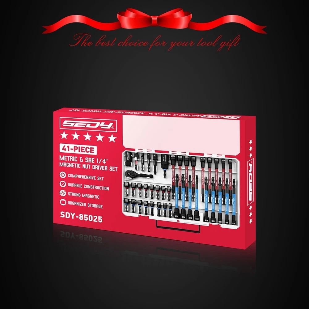 41-Piece Premium 1/4" Drive Magnetic Impact Nut Driver Set Black, Red, Blue Product Details Brand: SEDY Material: Chrome Vanadium Steel Finish Type: Powder Coated Number of Pieces: 41 Drive Bit Shank Style: 1/4" Drive Manufacturer: SEDY Item Weight: 5.72 pounds Package Dimensions: 14.17 x 9.76 x 1.34 inches Item model number: 85025 Color: Black, Red, Blue Style: New Version Finish: Powder Coated Power Source: hand_powered Item Package Quantity: 1 Compatible Fastener Range: Nuts Included Components: 41-Piece Magnetic Impact Nut Driver Set Batteries Included?: No Batteries Required?: No Brand: SEDY Material: Chrome Vanadium Steel Finish Type: Powder Coated Number of Pieces: 41 Drive Bit Shank Style: 1/4" Drive COMPLETE SET - All-in-one magnetic impact nut driver set includes 41 pieces: Metric & SAE long and standard nut drivers, socket adapters, universal socket, quick-change bit holder, ratchet wrench and wing nut driver for tackling any task with ease DURABLE STRENGTH - Built to last with Cr-V for maximum shock resistance and hardness, this set features deep nut drivers, reinforced wall thickness, and manganese phosphate coating for superior durability DUAL-DRIVE RATCHET EFFICIENCY - Combines socket and bit driver heads with a precision ratchet mechanism, enabling seamless switching for nuts, bolts, and screws while boosting work efficiency by 50% in auto repair, home installation, and machinery maintenance POWERFUL MAGNETISM - Industrial-grade magnetic impact nut drivers with embedded magnets ensure a secure grip on screws and bolts, providing reliable retention and reducing the risk of losing hardware during use VERSATILE PERFORMANCE - Effortlessly handle multiple projects with this set, from home DIY repairs to professional mechanics, perfect for garages, workshops, and construction work, ensuring exceptional performance in every job