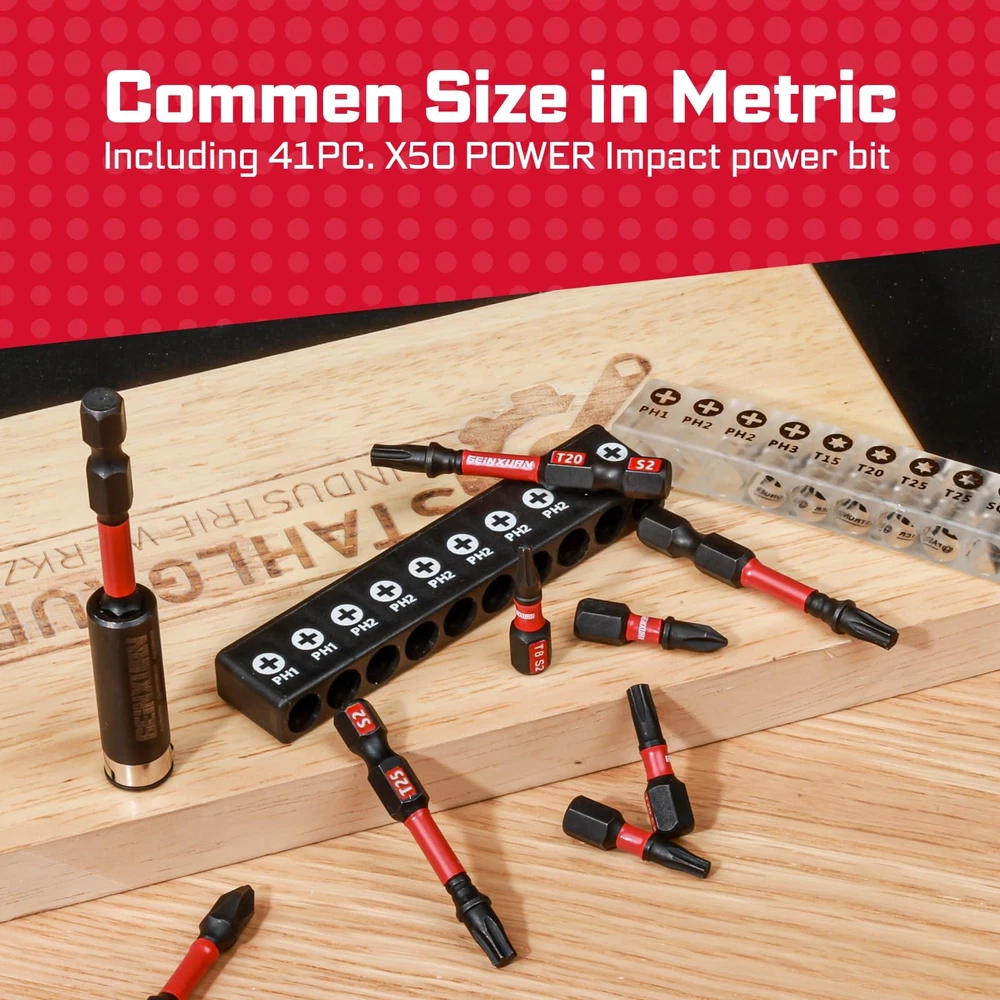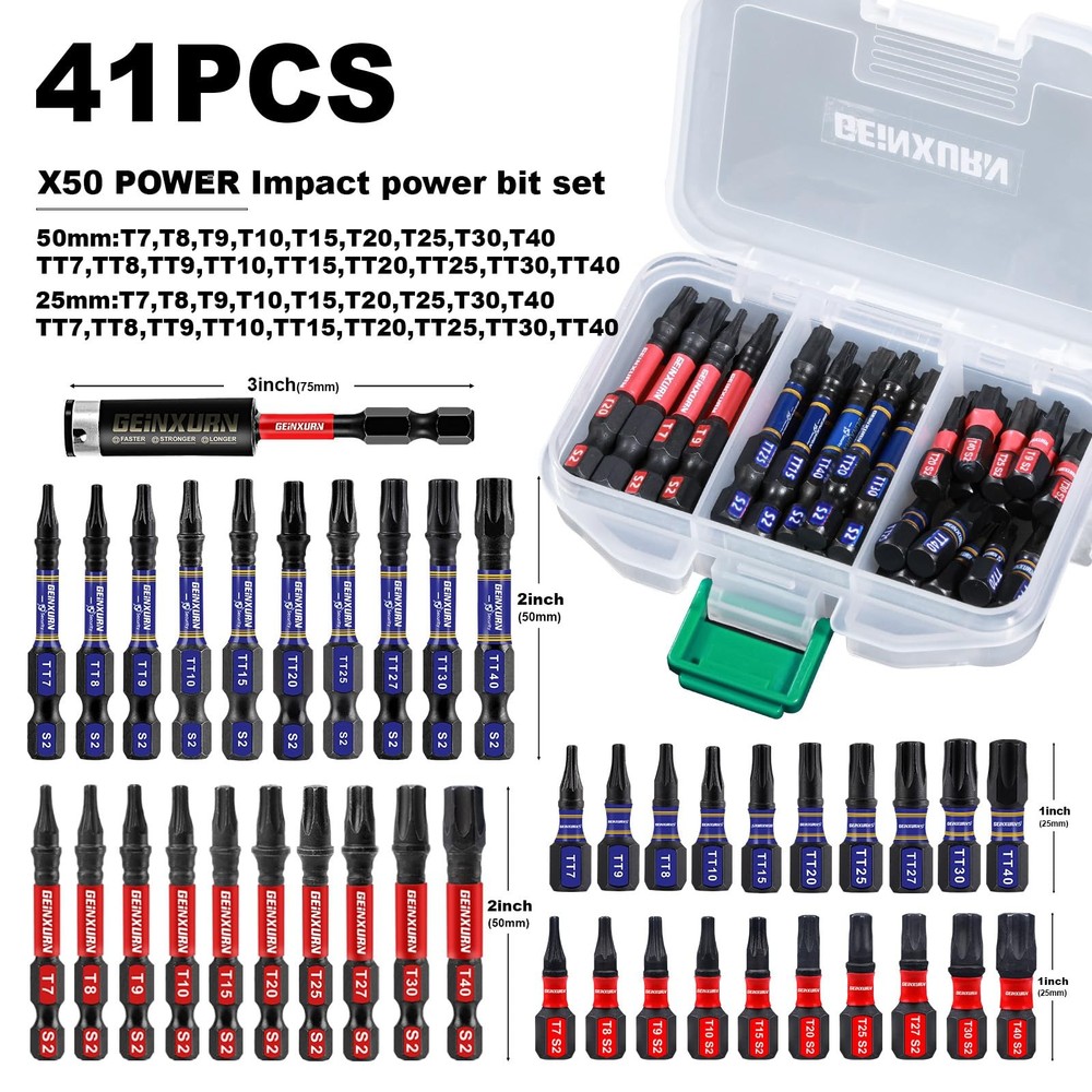 41Pieces Screwdriver Bit Set 1Inches Torx Bits (T7,T8,T9,T10,T15,T20,T25,T27,T30,T40); 1Inches Security Torx Bits (TT7,TT8,TT9,TT10,TT15,TT20,TT25,TT27,TT30,TT40); 2Inches Torx Bits (T7,T8,T9,T10,T15,T20,T25,T27,T30,T40); 2Inches Security Torx Bits (TT7,TT8,TT9,TT10,TT15,TT20,TT25,TT27,TT30,TT40); 1Pieces- 3Inches Impact Magnetic Screwdriver Bit Holder. Material: Advanced metallurgy hardened S2 alloy steel Shank: 1/4 in. hex Strong Magnetic Anti-impact and tough, great wear resistant. These impact tough bits are an impact rated line of screw driving bits and bit holders that have been enhanced to handled a new generation of higher torque impact drivers. Provide 10X longer bit life than standard impact bits. Impact Rated Screwdriver Bit Impact Shock Absorbent Zone stands up to punishment from high-torque impact drivers. Long-lasting engineered tips provide enhanced strength that can handled high-torque impact drivers, so it can tightening or loosening screws easier. TORX SCREWDRIVER BITS: 40 pieces T7-T40 multi star driver bits and 1Pc Bit holder with storage box, the box is customized for bits, you can take it easy to anywhere or hang it up when you don't use it IMPACT RATED BITS: Impact Shock Absorbent Zone stands up to impact drivers. It can be handled a new generation of higher torque impact drivers Quality Assurance: This batch of head made of S2 high quality steel material, it owns the features of high hardness and good toughness and resistance through strictly heat treatment, durable and suitable for any industrial use Precision Tips Head: Precision-engineered bit tips, deliver a better fit and less cam-out, each edge can accurately lock the screw, stabilizes without slipping and improves work efficiency. Avoid damaging the screw and screwdriver head Wide Range of Uses: Made to fit 1/4 In. hex impact drivers drill screw bit set is not only work with impact driver, but also magnetic screwdriver bit perfect for any regular drill, electric and hand screwdrivers, power drills, corded drills, cordless drills, cordless driver and more