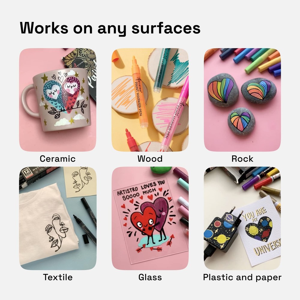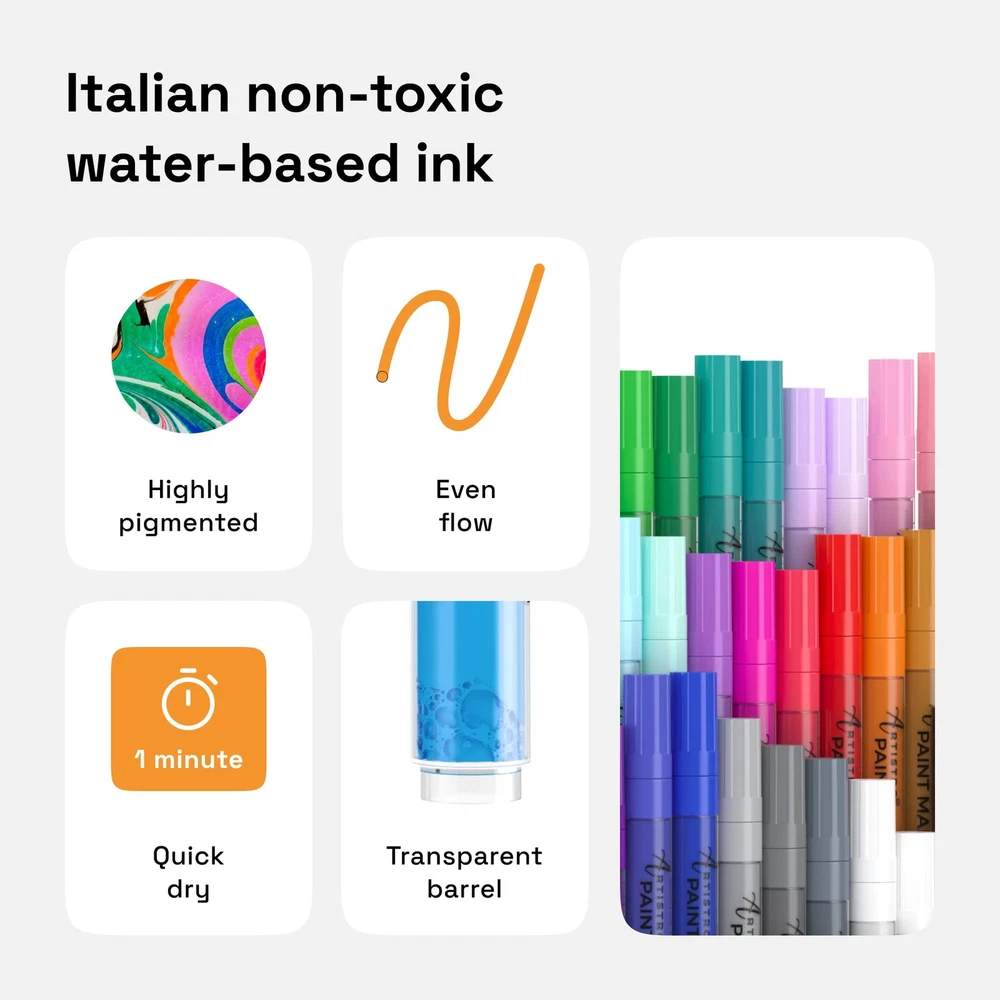 w The Paint Pens for acrylic painting are made with the highest quality water-based Italian imported inks for a smooth, consistent flow and glossy, opaque finish. Our 0.7mm extra fine tipped nibs are made in Japan with love. High quality ink means bright colors and perfect artwork on nearly any surface. This acrylic markers set includes an amazing range of 40 assorted colors + extra black & white acrylic pens for painting. Safe, Non-Toxic & Odor-Free, Acrylic markers paint pens pass all USA and EU safety requirements. Create art projects on almost any surface with acrylic paint pens for rock painting, stone, ceramic, glass, wood, fabric, canvas, mug, plastic, textiles, metal and more. You will get a step-by-step tutorial e-book with crafts rock designs you & your kids will love. acrylic paint pens for canvas & Paint markers for rocks are a unique gift for your creativity inspiration. The Perfect Gift: Create stunning custom with ceramic markers for mugs and other personalized gifts for your loved ones. Paint pens for acrylic painting are an ideal gift for crafters and artists.