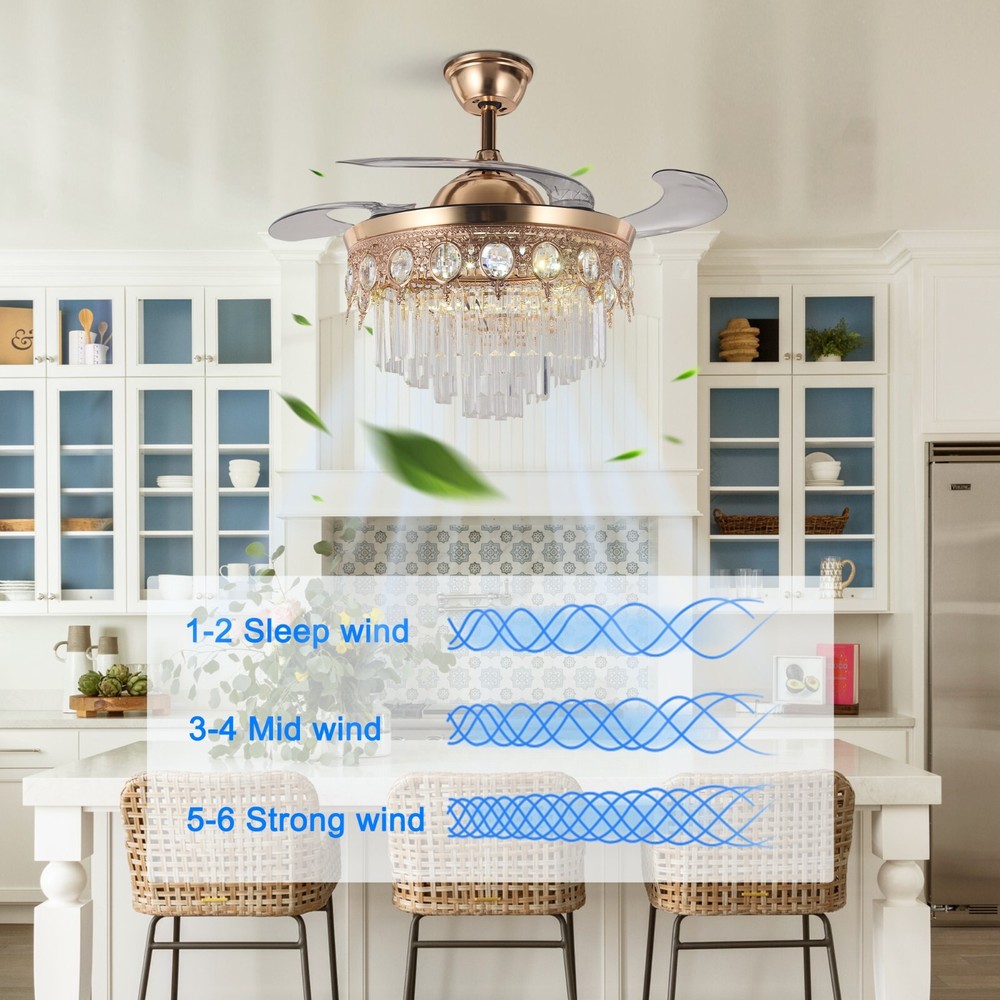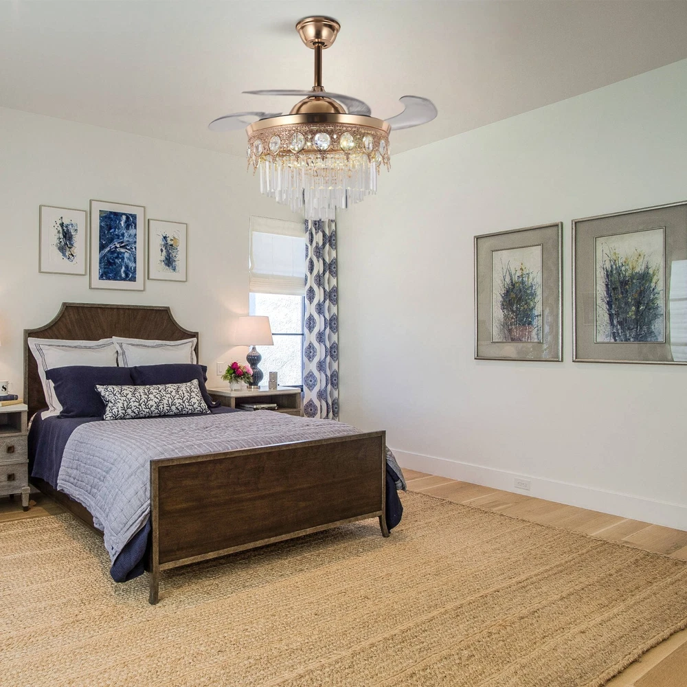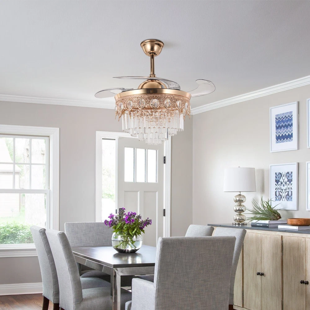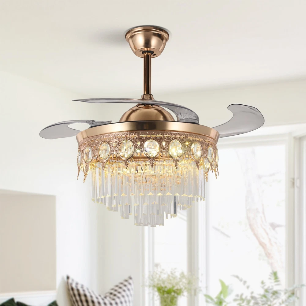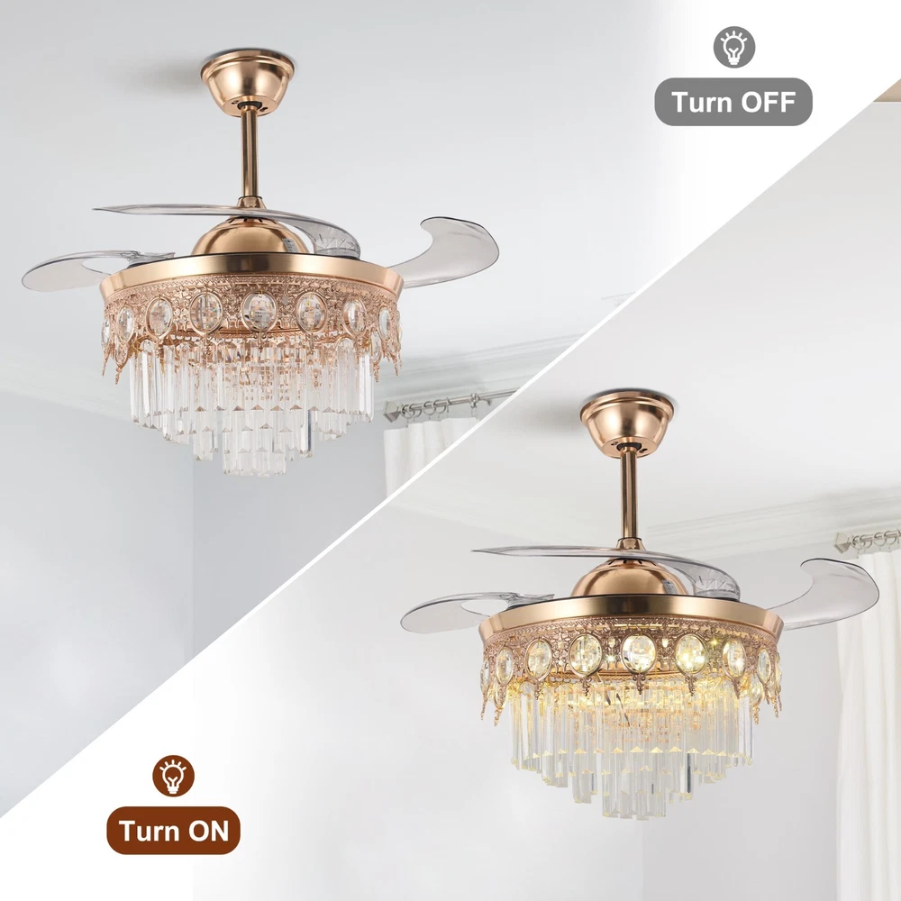 42" Gold LED Crystal Chandelier Remote 3-Colors 6-Speeds Ceiling Fan Reversible 42 Inches Crystal Ceiling Fan Chandelier This chandelier ceiling fan is definitely become a practical decoration in your house. It’s perfect for decorating in dinning room, living room, bedroom. Giving you a sweet lighting and natural atmosphere Specifications: Style: Modern Color: Gold Material: Metal + ABS retractable blade + K9 crystal lampshade The main material of the lampshade: crystal lampshade Control type: remote control Lighting: 3 lights (yellow/warm white/white) Wind speed: 6 wind speed (high/medium/low) Timing setting: 1h, 2h, 4h, 8h Light source: LED (included) Wattage: 36W-40W Reverse:Reversible Size: Blades open diameter 42inch Lower pole: 4 inches and 7.8 inches downrod for your choice. Applicable area: 10-25 square meter Tips: ●This chandelier ceiling fan needs to be assembled. Please follow the user manual and we recommend to have it professionally to install. ●Floor to ceiling height needs more than 2.5 meters, ceiling can hold greater than 65lb. ●We recommend to wear the hand gloves when you install the crystal prevent to Leave fingerprints. ●If you receive a damaged or defective package, please contact us and we would process it immediately. Payment Delivery details Terms of sales About us Contact us Payment You could make payment via: Delivery details Packages will ship via by UPS or USPS within our handling time,once the package is shipped out ,normally shipping takes about 3-10 working days,but due to different cities and states,shipping time will be different. Terms of sales If you any problem about shipping information, or the item you got : Arrived damaged; Wrong item sent; Missing parts or pieces; Doesn't work or defective; Doesn't match description or photos. Pls click "Contact Seller" and send us message firstly. Then we could have a check and will take responsibility to resolve the problem with you in good communication. About us Our company specializing in selling all kinds of light fixtures,such as ceiling fans,chandeliers,crystal lights,retro lamps,pendant light,etc. If there's any light fixture you are interested,pls feel free to contact us for more details. Contact us Normally your message will be replied in 1 business day,If after 24 hours you do not receive our reply,please kindly re-send us the message,because sometimes ebay message system will have technical problem,so your message can't send to us successfully.