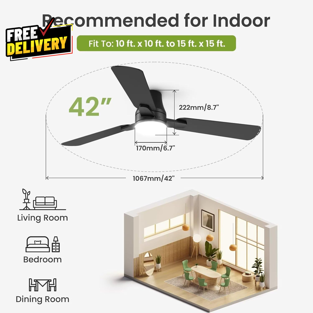 ultimatesavvyshop New Arrivals Add to Favorite View Feedback Contact 42 Inch Ceiling Fan with Light and Remote Low Profile Black Quiet Reversible ? PLEASE CONTACT US FIRST BEFORE TAKING ANY ACTION ? If you face any kind of issue , please reach out to us directly . Especially before leaving Negative Feedback, opening an “Item Not Received” case, or starting a Return . ? We are always happy to assist and resolve any problem quickly and professionally! If you have any questions or require assistance, please don’t hesitate to reach out. Description Item model number FL42302 Style Modern Material Plastic Number of Speeds 6 Control Method Remote Motor Type Brushless DC Room Type Bedroom, Kitchen, Living Room, Porch, Study Room Number of Power Levels 6 Power Source Electric Efficiency A Product Dimensions 42"D x 42"W x 8.74"H Installation Type Flush Mount Model Name FL42302 Finish Type Powder Coated Mounting Type Ceiling Mount Controller Type Remote Control Item Package Quantity 1 Batteries Required? No Item Weight 7.09 pounds Color Black Is Cordless? No Shape Round Recommended Uses For Product Air Circulation Finish types Powder Coated Electric fan design Ceiling Fan Speed 6 RPM Size 42 inch Fast & Easy Installation: Tired of complicated setups? Our ceiling fan with light comes with a pre-installed light fixture, reducing assembly time by 90%. The snap-in blades install easily and are secured with locking clips for stability. Plus, our detailed manual ensures a smooth, hassle-free installation experience. To make installation even easier, we also provide a clear instructional video available directly on the product page, guiding you step-by-step. Perfect Size for Optimal Comfort: With dimensions of 42 x 42 x 8.7 inches, this ceiling fan is ideal for medium-sized rooms ranging from 10ft x 10ft to 15ft x 15ft. Weighing just 7.2 lbs, it’s easy to handle and install, providing excellent airflow and comfort without being too bulky for your space. Low Profile Flush Mount: Designed for low ceilings, this ceiling fan with lights is ideal for bedrooms, living rooms, kitchens, offices, and covered outdoor spaces like patios, porches, and pergolas. Its elegant, modern design complements various décor styles. Additionally, the fan blades are reversible with black on one side and walnut wood on the other, allowing you to customize the look to match your home' s aesthetic. Ultra-Quiet Reversible DC Motor: Stay comfortable all year with a reversible DC motor that cools in summer and circulates warm air in winter. Choose from 6 adjustable speeds – including gentle breeze, natural wind, and strong cooling – for personalized comfort. Operating under 30dB, it’ s perfect for bedrooms and quiet spaces. A-rated efficiency saves 80% energy, making it both powerful and eco-friendly. Multi-functional Smart Remote Control: Equipped with a smart remote, all functions are at your fingertips – 6 fan speeds, 3 color temperatures (3000K warm, 4500K natural, 6500K white), stepless dimming (10% - 100%, up to 2000 lumens), and 1/2/4-hour timers. Memory function brings you back to your favorite fan and light settings when powered off via remote. When turned off using the main wall switch, only the light setting is preserved. ABOUT US Prior to making any purchase from our store, we’d like to introduce ourselves. My name is Shahzad Yaqub , and I am the proud owner of Epic Emporium Deals , located in the great state of Illinois, USA. I have been an active and trusted eBay seller since Jan 14, 2025 . At Epic Emporium Deals , we are committed to offering competitive prices and top-quality products . Our extensive collection features a wide variety of items, including media such as books, movies, music, and games , as well as electronics, toys, sporting apparel, clothing, tools , and general home and garden essentials —and much more! Your satisfaction is our priority, and we look forward to providing you with an exceptional shopping experience. SHIPPING We are always working hard to ensure your package arrives as soon as possible. Please understand that some factors like weather, high postal traffic, and the performance of shipping companies are outside of our control. We offer free shipping to the lower 48 states and ship within 2 business days of payment, usually sooner. We do not accept P.O. Boxes. Please provide a physical address. For shipping outside of the continental USA, we only use eBay's Global Shipping Program. The item is shipped to IL and then sent to the rest of the world. International customers are responsible for all duties and taxes. Continue to 'check out' to calculate costs for shipping the item to your country. Messages regarding eBay's Global Shipping Program MUST be directed at eBay EXCLUSIVELY. RETURNS We do not accept returns under normal circumstances. However, we will gladly consider a return if the item is received broken or if the wrong size is sent to you. In all other cases, returns will not be accepted. CUSTOMER SATISFACTION We try our very best to make sure every customer is completely satisfied. If there's a problem, message us! We're happy to help.