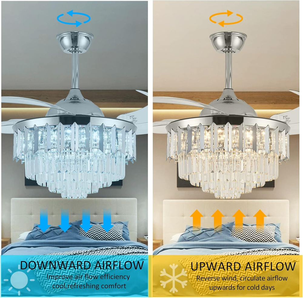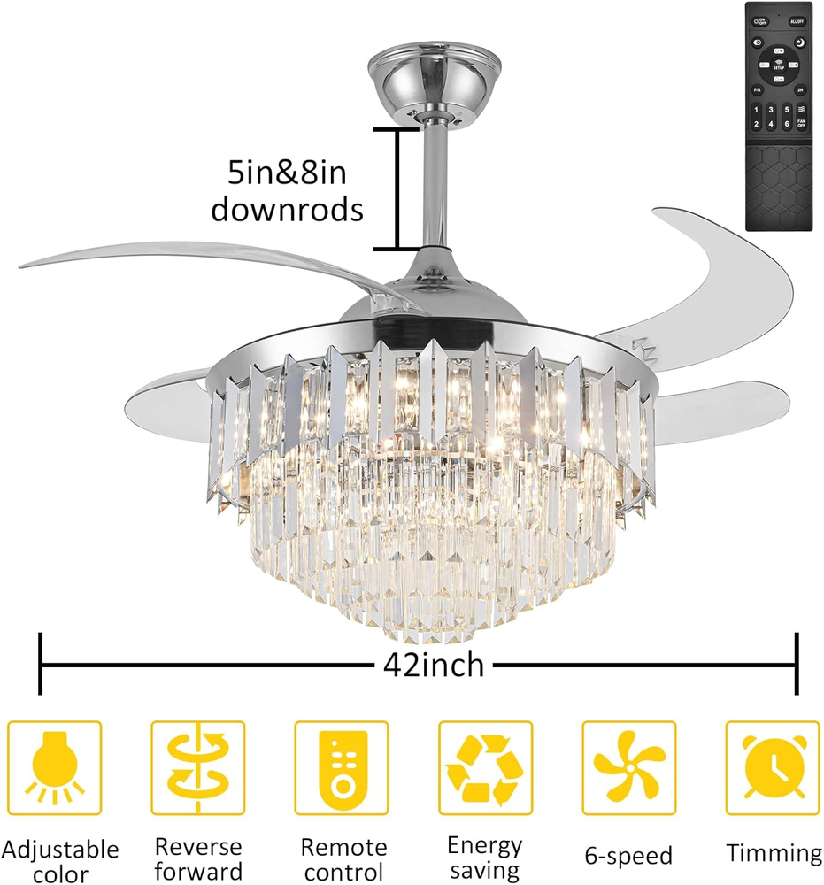 This ceiling fan is a game-changer! The modern design with crystal accents adds elegance to any room, and the dimmable LED lights create the perfect ambiance. The remote control makes it super convenient to adjust speed and brightness, while the retractable blades are a genius space-saving feature. It's both stylish and functional—definitely worth the investment!