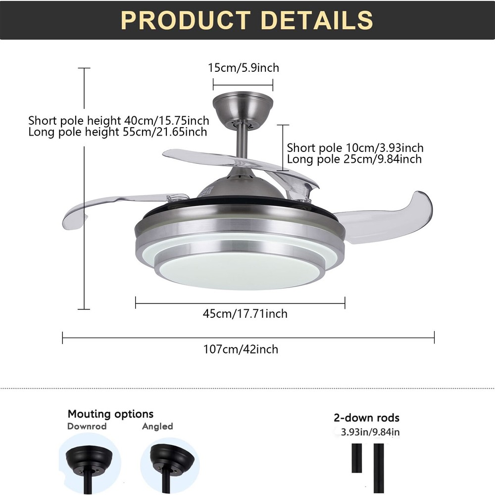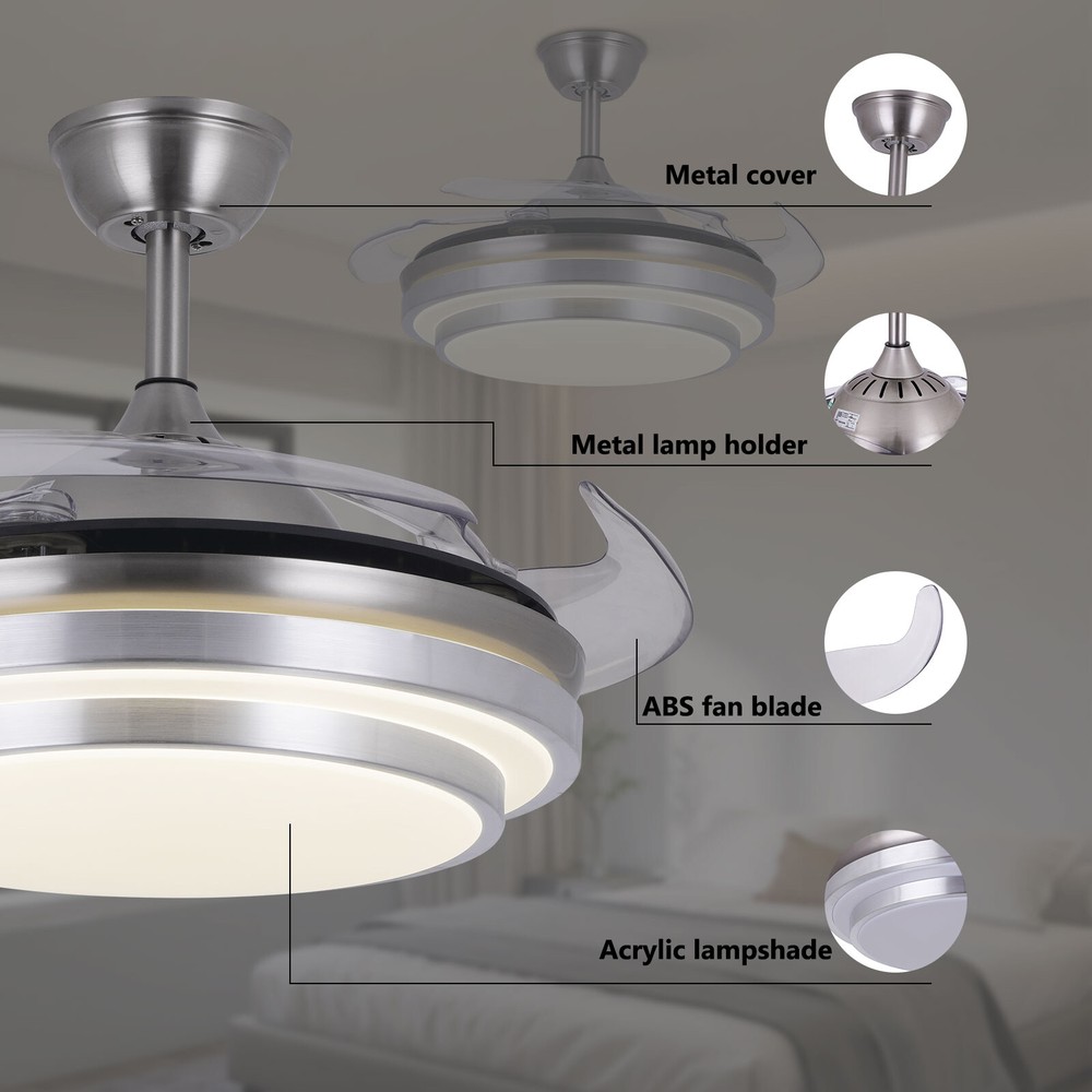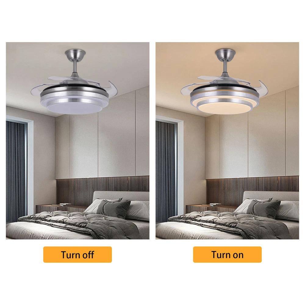 This ceiling fan lamp is a game-changer! The retractable blades are sleek when not in use, and the dimmable LED lighting creates the perfect ambiance. The remote makes it super convenient to adjust both fan speed and light brightness. It's quiet, stylish, and works beautifully in any room—highly recommend!
