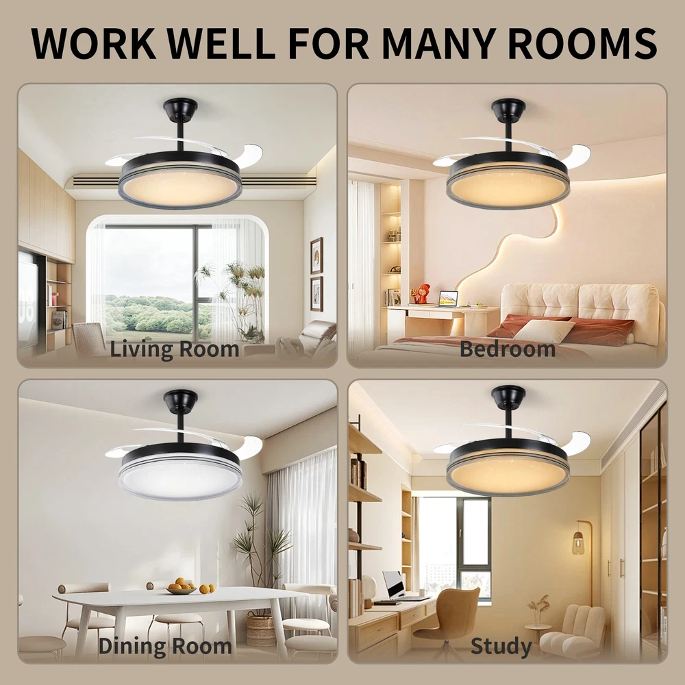 【 Modern Simple Style 】 This retractable ceiling fan comes with matte white body and 4 transparent blades which looks modern and simple. Clear blades is automatically retracted or invisible when fan off. It just looks like a big round light. The motor for this invisible ceiling fan with lights is made of silicon steel and copper which makes the quality indurable and stable. 【 Dimmable Light 】 This retractable ceiling fan with Dimmable LED integrated light and luminous area diameter is up to 20 inches, the flicker-free LED light source not only makes the light softer, but also more energy efficient than 2 round light. High light transparency PC cover makes light more evenly distributed and more bright. Three color changeable (Warm 3000K/Daylight 4000K/Cool 6000K) creates different atmosphere. 【6 Wind Speed & Quiet DC Motor 】 The ceiling fan offers six different speed options, allowing you to choose the ideal airflow intensity for your comfort needs. DC motor with clear blades delivers powerful airflow with durable and quiet performance. The volume is under 30dB when the fan is running. The retractable ceiling fan has a good airflow to keep you cool and get rid of the summer heat. 【 Remote Control 】 This ceiling fans with lights, allows you to adjust the brightness of the light and customize the color temperature by the remote , which is very convenient. Timer : 1/2/4 hours for options. Lighting has a memory function. For example, if you use warm light for more than 30 seconds, and then turn off , after 30s then you turn on again, it will still be warm light. 【Buy with Confidence】 The ceiling fans are perfect for various rooms, indoor ceiling fans, farmhouse ceiling fan, garage ceiling fans, patio ceiling fan, bedroom ceiling fan. We provide a 12-month worry-free quality guarantee and lifetime professional customer service for urbanest ceiling fans with lights and remotes. You can contact us at any time if you have any issues during using or installing the fan.