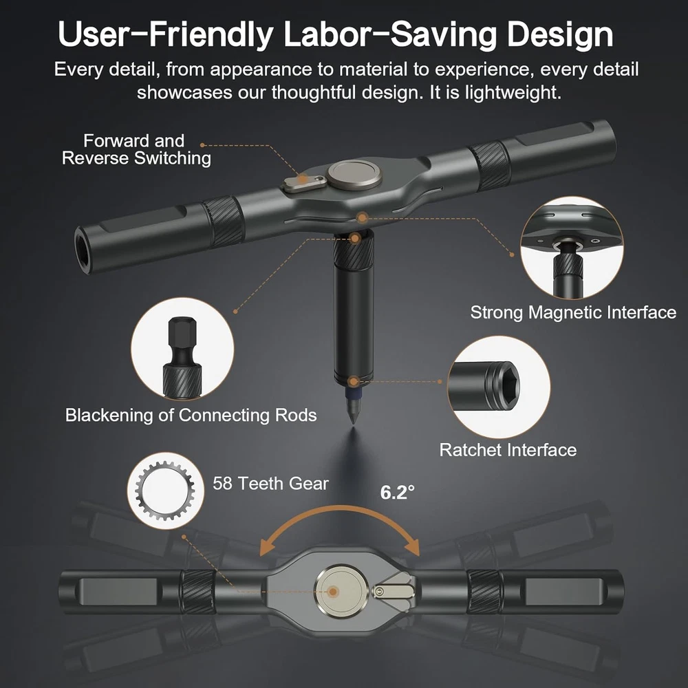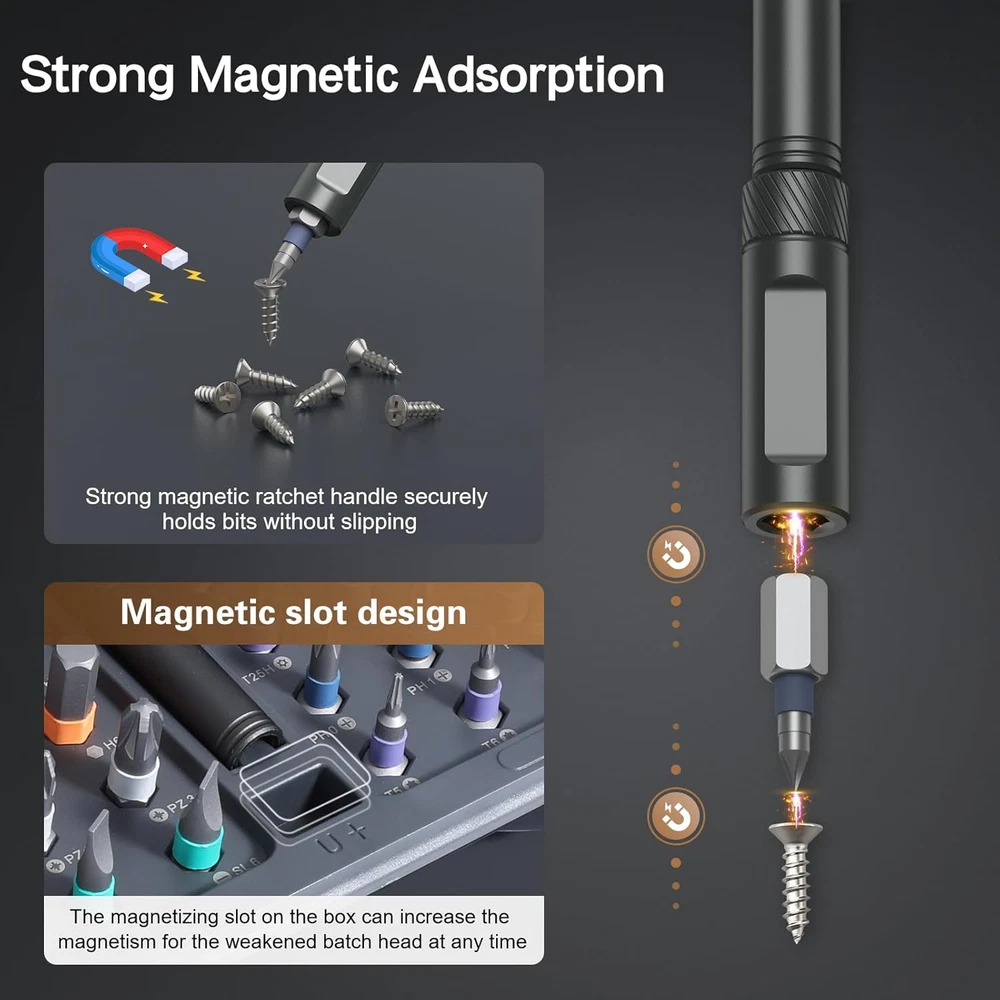 Flexible Ratchet Handle Design - The handle features a detachable structure, allowing for various combinations and multifunctional adjustments to fit different situations, like using in narrow spaces. The ergonomic aluminum handle design is lightweight yet rugged, crafted from hot-forged aluminum alloy with high-precision CNC molding for durability and oxidation resistance. Its lightweight construction ensures ease of handling, making it perfect for extended use without fatigue. Effortless Ratcheting Mechanism - Equipped with a 6.2-degree ratchet and 58-tooth forward-reverse ratchet mechanism, offering 80% effort savings. With a 50N.m torque, Bomivoi ratcheting screwdriver set tool makes it simple to tighten or loosen screws without wrist adjustments, saving time and effort in every repair job. 42-in-1 Screwdriver Set - Bomivoi handy screwdriver set includes 40PCS S2 magnetic chromium-molybdenum alloy steel bits, featuring a 6.35mm (1/4") diameter, one handle, and a magnetic slot. the bit driver set comprises 32 short bits (25mm) and 8 long bits (45mm), including various types like PH, SL, Torx, Hex, PZ, and U-shape. Ideal for home, work, DIY projects, professional task, and repairs, providing the right tool for any task. Strong Magnetic & Easy Identification - Features a magnetic handle for secure bit placement and a convenient magnetic slot within the case to recharge the bits’ magnetism as needed. Color-coded bit rings ensure quick and easy identification, improving work efficiency and simplifying organization. This magnetic screwdriver set effectively tackles various tasks, including home appliance repairs, home furniture repairs, and automotive maintenance. Compact Case, Perfect Gift Choice - Housed in a sturdy, compact storage case (6.6 x 3.7 x 1.6 inches, 15.6 oz), this mini screwdriver set is an excellent gift for professionals and DIY enthusiasts alike. Whether for furniture, electronics, appliance, computers, motorcycle or bike repairs, it's a practical present for Christmas, holidays, birthdays, Father's Day or any special occasion. Product Description Bomivoi compact 42-piece ratchet screwdriver set designed for versatility, durability, and efficiency, ideal for a wide range of repair and DIY tasks. Crafted from super-hard hot-forged aluminum alloy and precision CNC molded for durability and oxidation resistance, the handle offers a comfortable grip, ensuring you won't tire during extended use. This magnetic screwdriver set includes 40PCS S2 steel bits, featuring a 6.35mm (1/4") diameter, designed to meet professional needs as well as everyday tasks at home, work, DIY projects, and maintenance, allowing for effortless use in any situation. This tool effectively handles a variety of tasks, including home appliance repairs, furniture assembly, computer, motorcycle, bicycle, and automotive repairs. The compact storage case is designed for easy transport, making it a practical choice for on-the-go use.