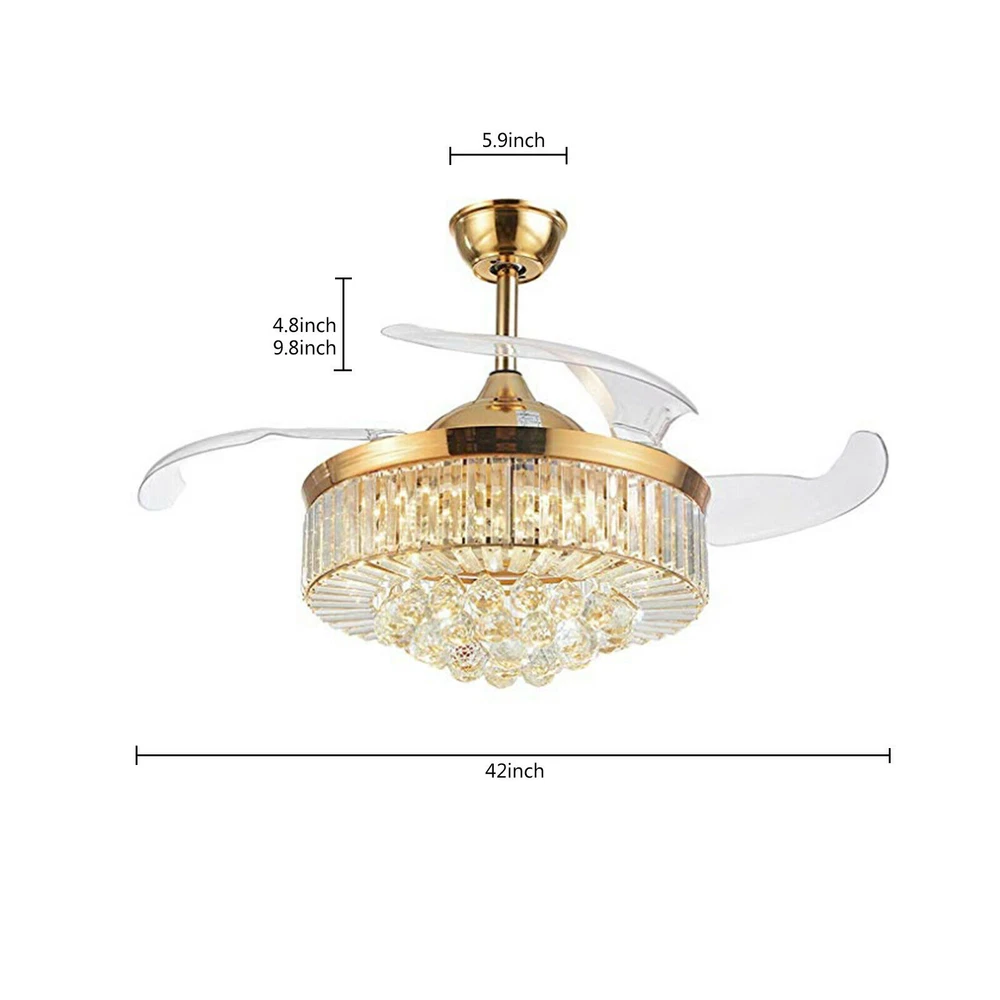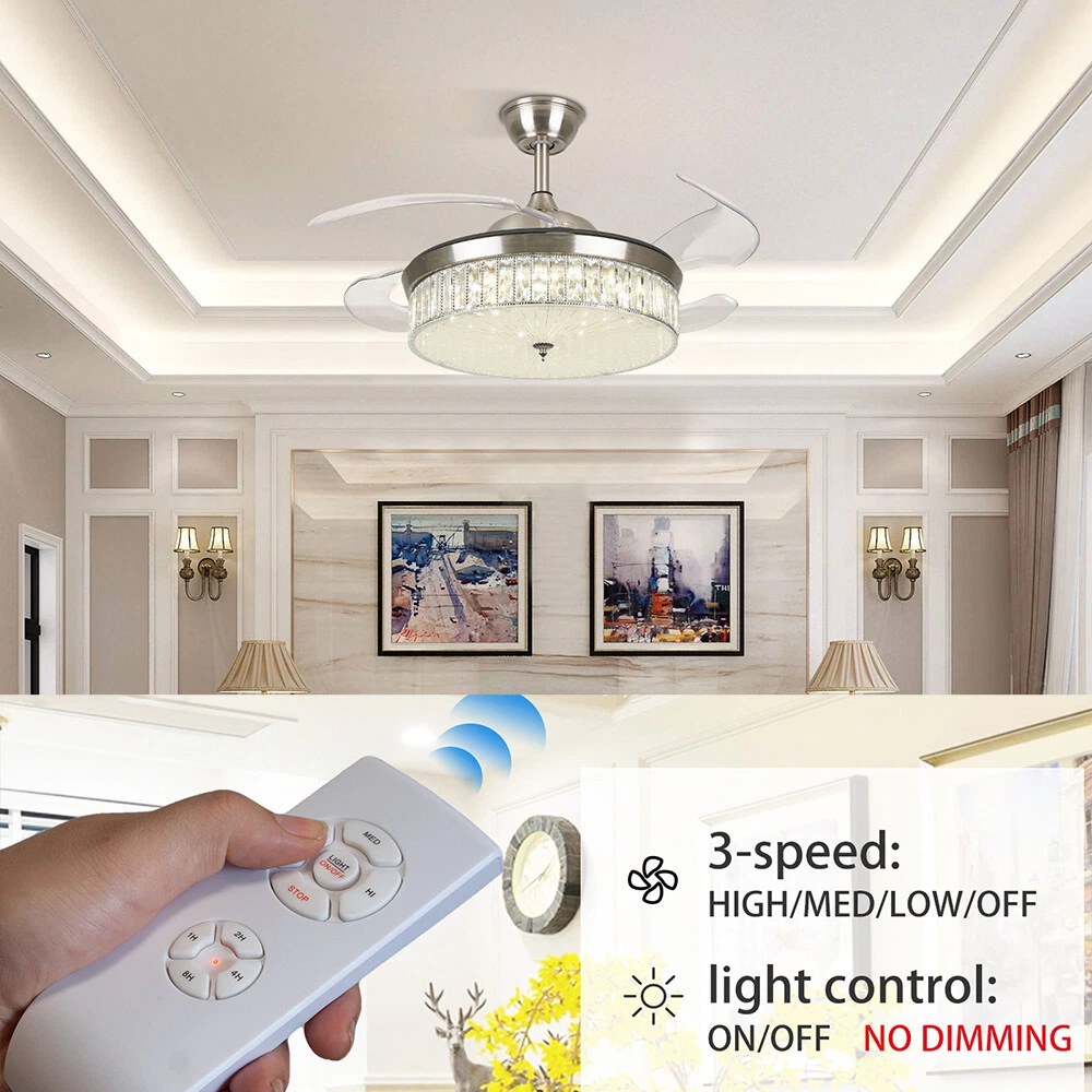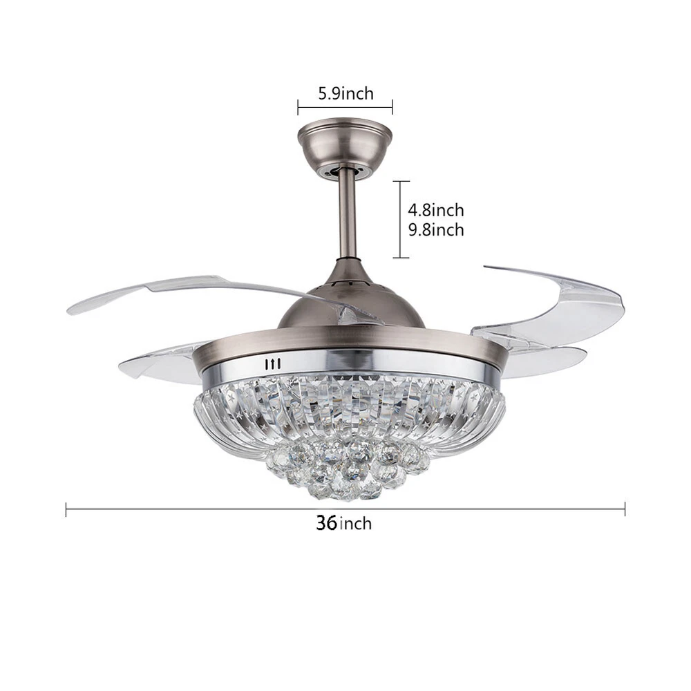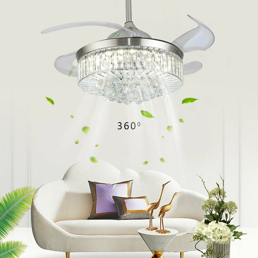 42"/36" Crystal Chandelier Invisible Ceiling Fan Light With 3-Color LED +Remote ❤Welcome❤ Model One:42" Silver #1 Product Description: Color:Silver This modern ceiling fan with lights is a combination of ceiling fan and crystal chandelier: ★As for a ceiling fan, it has 4 retractable blades that can stretch out and put inside automatically when turned on and off. ★That means, when turned off, the blades will put inside and become 'invisible', totally a chandelier with crystal; ★When turned on, the blades will stretch out, and transfer to a traditional ceiling fan with lights. ★This chandelier fan is controlled by remote control, ceiling fan speed and LED light can be controlled separately by a single remote control. Fan Chandelier Features: ♥Pendant Lights Type: Crystal Pendant Lights ♥Material: Stainless Steel+k9 crystal+ABS fan ♥Size: 42 inches ♥Color:Silver ♥Style: modern ♥Number of Blades: 4 ♥Lighting Features: dimmable, fan light ♥Application Type: Indoor ♥Light Bulb Type: LED ♥Number of lamps: 10 ♥Power: 41W (inclusive) -50W (including) ♥Applicable Places: living room/bedroom/kitchen/office and restaurant ♥Voltage: 110V Please Note: ▲The actual color of the chandelier may be deviated due to the color of the display and the angle of the picture. ▲Please receive the actual color of the goods as standard, thank you for your understanding and support. Model Two:42" Gold Color:Rose Gold This modern ceiling fan with lights is a combination of ceiling fan and crystal chandelier: ★As for a ceiling fan, it has 4 retractable blades that can stretch out and put inside automatically when turned on and off. ★That means, when turned off, the blades will put inside and become 'invisible', totally a chandelier with crystal; ★When turned on, the blades will stretch out, and transfer to a traditional ceiling fan with lights. ★This chandelier fan is controlled by remote control, ceiling fan speed and LED light can be controlled separately by a single remote control. Fan Chandelier Features: ♥Pendant Lights Type: Crystal Pendant Lights ♥Material: Stainless Steel+k9 crystal+ABS fan ♥Size: 42 inches ♥Color: Gold ♥Style: modern ♥Number of Blades: 4 ♥Lighting Features: dimmable, fan light ♥Application Type: Indoor ♥Light Bulb Type: LED ♥Number of lamps: 10 ♥Power: 41W (inclusive) -50W (including) ♥Applicable Places: living room/bedroom/kitchen/office and restaurant ♥Voltage: 110V Please Note: ▲The actual color of the chandelier may be deviated due to the color of the display and the angle of the picture. ▲Please receive the actual color of the goods as standard, thank you for your understanding and support. Model Three:36" Silver #1 36" ceiling fan with lights is a combination of ceiling fan and crystal chandelier: ★As for a ceiling fan, it has 4 retractable blades that can stretch out and put inside automatically when turned on and off. ★That means, when turned off, the blades will put inside and become 'invisible', totally a chandelier with crystal; ★When turned on, the blades will stretch out, and transfer to a traditional ceiling fan with lights. ★This chandelier fan is controlled by remote control, ceiling fan speed and LED light can be controlled separately by a single remote control. Fan Chandelier Features: ♥Pendant Lights Type: Crystal Pendant Lights ♥Material: Stainless Steel+k9 crystal+ABS fan ♥Size: Modern Fan Light Chandelier:36 inches when the fan is extended, Includes two lower bars, one for 4 inches and the other for 8 inches, you can choose one to install ♥Color: Silver ♥Style: modern ♥Number of Blades: 4 ♥Lighting Features: dimmable, fan light ♥Application Type: Indoor ♥Light Bulb Type: LED ♥Number of lamps: 10 ♥Power: 41W (inclusive) -50W (including) ♥Applicable Places: living room/bedroom/kitchen/office and restaurant ♥Voltage: 110V Model Four:36" Silver #2 36" Modern LED Ceiling Fan Light Crystal Chandelier Retractable w/ Remote US ❤ Modern invisible fan chandelier: Fan and chandelier combined into one with remote control, automatic telescopic fan blade, LED lamp beads ❤ Ceiling fan with remote: . Dimmable LED lights have 3 color changes (White-Warm-Yellow), Fan has 3 speed settings (Low-Mid-High). All these functions can be easily controlled by remote ❤ Modern Fan Light Chandelier: 36 inches when the fan is extended, Includes two lower bars, one for 4 inches and the other for 9.8 inches, you can choose one to install ❤ Bedroom Ceiling Fans Material: metal body + acrylic lamp cover + ABS retractable blades + pure copper motor(providing powerful air flow, quiet and durable. With vents, it can reduce the internal temperature of the main unit and extend the life of the motor.) Ceiling Fan with LED Light: Replaceable LED light will last a longtime and save you the most on your energy bills. Ceiling Fan with Remote Control: Control the light and fan speed separately for ease and convenience. Color temperature: CCT Dimmable (3 light cycles) Light source type: LED(Light Kit Included) Control: Remote Control Included Dimensions: 36Inch, 4 Retractable Blades Light Wattage: 36W Motor Wattage: 56W Speed: 3 Voltage: AC 110 -120 Volts Average Service Life: 5~10 Years Installation Instructions: Ceiling Chandelier Suitable for Flat Roof Concrete Ceiling House, for Gypsum Board and Wood Ceiling, You Need to Buy a Remodeling Bracket; Identify and Connect Electrical Wires; Ceiling height is greater than 110", Lift 110 Pounds. What you get: Retractable ceiling fan x 1 Screws sets x 1 Down rods x 2 (1 2 CM & 2 5 CM) Remote control x 1 Instruction Manual x 1 Model Five:42" Silver #2 42inch Ceiling Fan Lights LED Chandelier Retractable 4 Blades w/ Remote USA Product Description: Color temperature: CCT (3 light cycles) Light source type: LED(Light Kit Included) Control: Remote Control Included Dimensions: 42Inch, 4 Retractable Blades Light Wattage: 36W Motor Wattage: 56W Wind Speed: 3 Vol