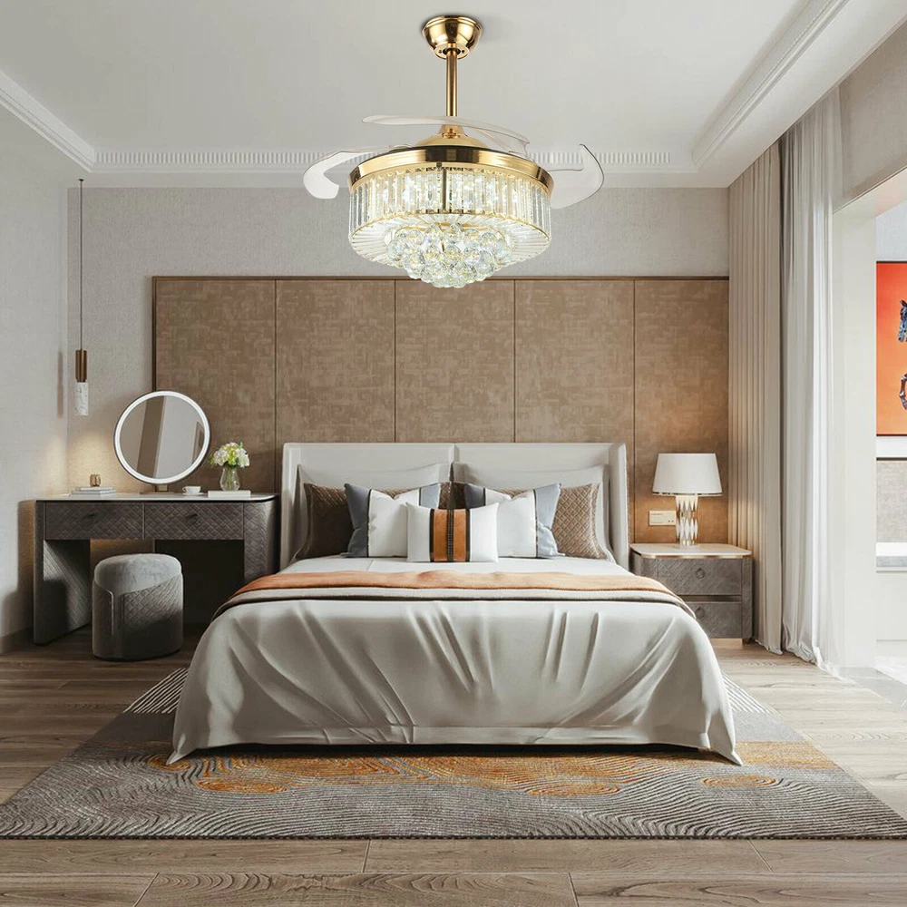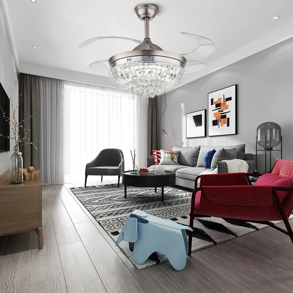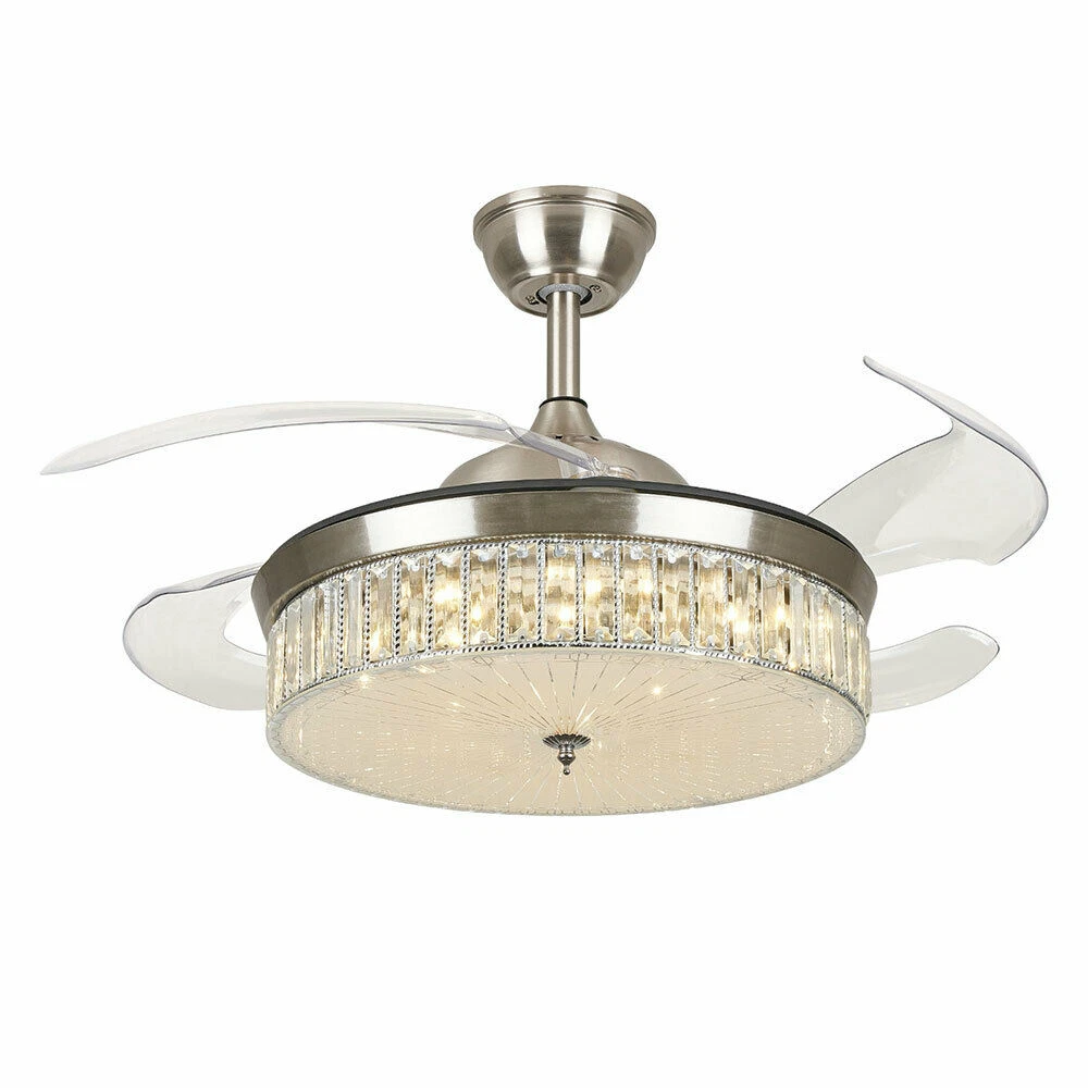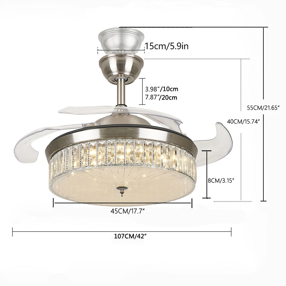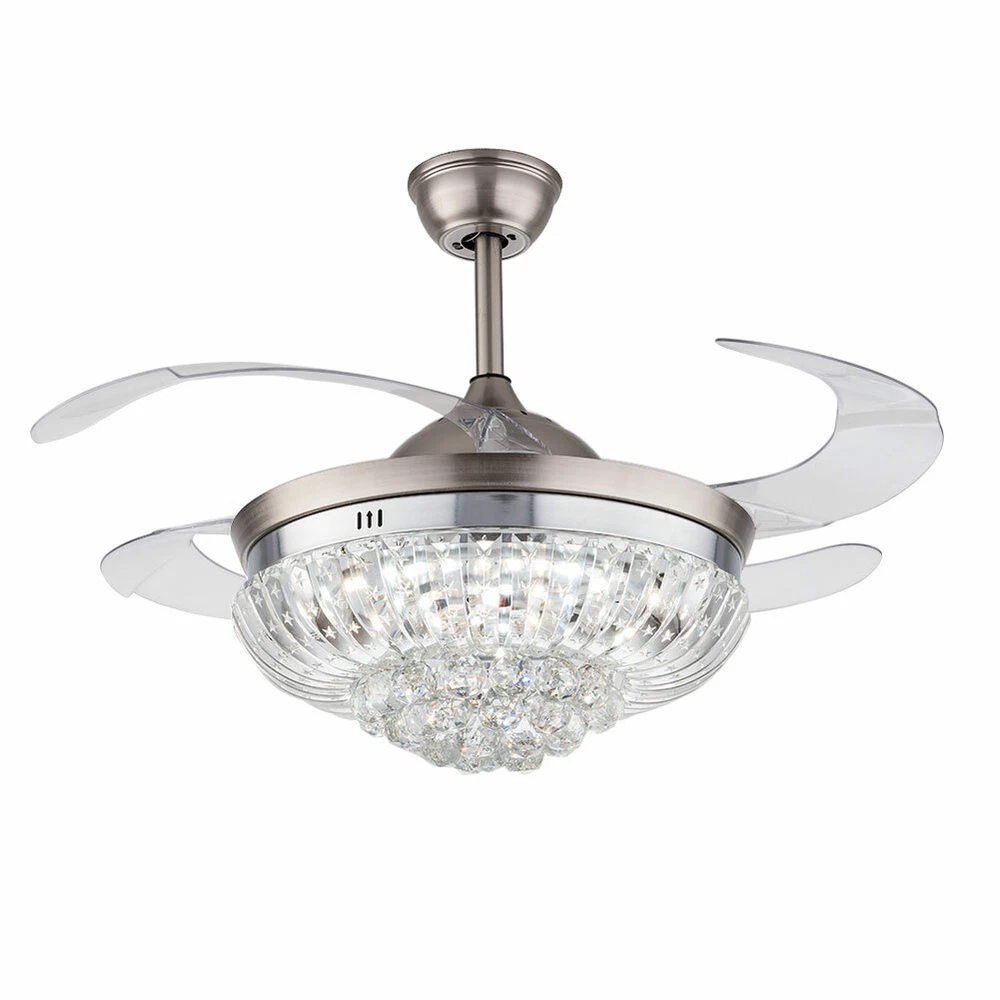42"/36" Crystal Chandelier Invisible Ceiling Fan Light With 3-Color LED +Remote ❤Welcome❤ Model One:42" Silver #1 Product Description: Color:Silver This modern ceiling fan with lights is a combination of ceiling fan and crystal chandelier: ★As for a ceiling fan, it has 4 retractable blades that can stretch out and put inside automatically when turned on and off. ★That means, when turned off, the blades will put inside and become 'invisible', totally a chandelier with crystal; ★When turned on, the blades will stretch out, and transfer to a traditional ceiling fan with lights. ★This chandelier fan is controlled by remote control, ceiling fan speed and LED light can be controlled separately by a single remote control. Fan Chandelier Features: ♥Pendant Lights Type: Crystal Pendant Lights ♥Material: Stainless Steel+k9 crystal+ABS fan ♥Size: 42 inches ♥Color:Silver ♥Style: modern ♥Number of Blades: 4 ♥Lighting Features: dimmable, fan light ♥Application Type: Indoor ♥Light Bulb Type: LED ♥Number of lamps: 10 ♥Power: 41W (inclusive) -50W (including) ♥Applicable Places: living room/bedroom/kitchen/office and restaurant ♥Voltage: 110V Please Note: ▲The actual color of the chandelier may be deviated due to the color of the display and the angle of the picture. ▲Please receive the actual color of the goods as standard, thank you for your understanding and support. Model Two:42" Gold Color:Rose Gold This modern ceiling fan with lights is a combination of ceiling fan and crystal chandelier: ★As for a ceiling fan, it has 4 retractable blades that can stretch out and put inside automatically when turned on and off. ★That means, when turned off, the blades will put inside and become 'invisible', totally a chandelier with crystal; ★When turned on, the blades will stretch out, and transfer to a traditional ceiling fan with lights. ★This chandelier fan is controlled by remote control, ceiling fan speed and LED light can be controlled separately by a single remote control. Fan Chandelier Features: ♥Pendant Lights Type: Crystal Pendant Lights ♥Material: Stainless Steel+k9 crystal+ABS fan ♥Size: 42 inches ♥Color: Gold ♥Style: modern ♥Number of Blades: 4 ♥Lighting Features: dimmable, fan light ♥Application Type: Indoor ♥Light Bulb Type: LED ♥Number of lamps: 10 ♥Power: 41W (inclusive) -50W (including) ♥Applicable Places: living room/bedroom/kitchen/office and restaurant ♥Voltage: 110V Please Note: ▲The actual color of the chandelier may be deviated due to the color of the display and the angle of the picture. ▲Please receive the actual color of the goods as standard, thank you for your understanding and support. Model Three:36" Silver #1 36" ceiling fan with lights is a combination of ceiling fan and crystal chandelier: ★As for a ceiling fan, it has 4 retractable blades that can stretch out and put inside automatically when turned on and off. ★That means, when turned off, the blades will put inside and become 'invisible', totally a chandelier with crystal; ★When turned on, the blades will stretch out, and transfer to a traditional ceiling fan with lights. ★This chandelier fan is controlled by remote control, ceiling fan speed and LED light can be controlled separately by a single remote control. Fan Chandelier Features: ♥Pendant Lights Type: Crystal Pendant Lights ♥Material: Stainless Steel+k9 crystal+ABS fan ♥Size: Modern Fan Light Chandelier:36 inches when the fan is extended, Includes two lower bars, one for 4 inches and the other for 8 inches, you can choose one to install ♥Color: Silver ♥Style: modern ♥Number of Blades: 4 ♥Lighting Features: dimmable, fan light ♥Application Type: Indoor ♥Light Bulb Type: LED ♥Number of lamps: 10 ♥Power: 41W (inclusive) -50W (including) ♥Applicable Places: living room/bedroom/kitchen/office and restaurant ♥Voltage: 110V Model Four:36" Silver #2 36" Modern LED Ceiling Fan Light Crystal Chandelier Retractable w/ Remote US ❤ Modern invisible fan chandelier: Fan and chandelier combined into one with remote control, automatic telescopic fan blade, LED lamp beads ❤ Ceiling fan with remote: . Dimmable LED lights have 3 color changes (White-Warm-Yellow), Fan has 3 speed settings (Low-Mid-High). All these functions can be easily controlled by remote ❤ Modern Fan Light Chandelier: 36 inches when the fan is extended, Includes two lower bars, one for 4 inches and the other for 9.8 inches, you can choose one to install ❤ Bedroom Ceiling Fans Material: metal body + acrylic lamp cover + ABS retractable blades + pure copper motor(providing powerful air flow, quiet and durable. With vents, it can reduce the internal temperature of the main unit and extend the life of the motor.) Ceiling Fan with LED Light: Replaceable LED light will last a longtime and save you the most on your energy bills. Ceiling Fan with Remote Control: Control the light and fan speed separately for ease and convenience. Color temperature: CCT Dimmable (3 light cycles) Light source type: LED(Light Kit Included) Control: Remote Control Included Dimensions: 36Inch, 4 Retractable Blades Light Wattage: 36W Motor Wattage: 56W Speed: 3 Voltage: AC 110 -120 Volts Average Service Life: 5~10 Years Installation Instructions: Ceiling Chandelier Suitable for Flat Roof Concrete Ceiling House, for Gypsum Board and Wood Ceiling, You Need to Buy a Remodeling Bracket; Identify and Connect Electrical Wires; Ceiling height is greater than 110", Lift 110 Pounds. What you get: Retractable ceiling fan x 1 Screws sets x 1 Down rods x 2 (1 2 CM & 2 5 CM) Remote control x 1 Instruction Manual x 1 Model Five:42" Silver #2 42inch Ceiling Fan Lights LED Chandelier Retractable 4 Blades w/ Remote USA Product Description: Color temperature: CCT (3 light cycles) Light source type: LED(Light Kit Included) Control: Remote Control Included Dimensions: 42Inch, 4 Retractable Blades Light Wattage: 36W Motor Wattage: 56W Wind Speed: 3 Vol