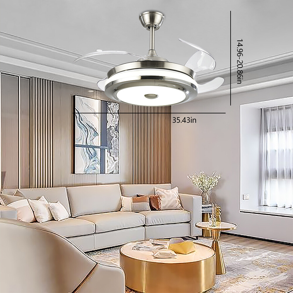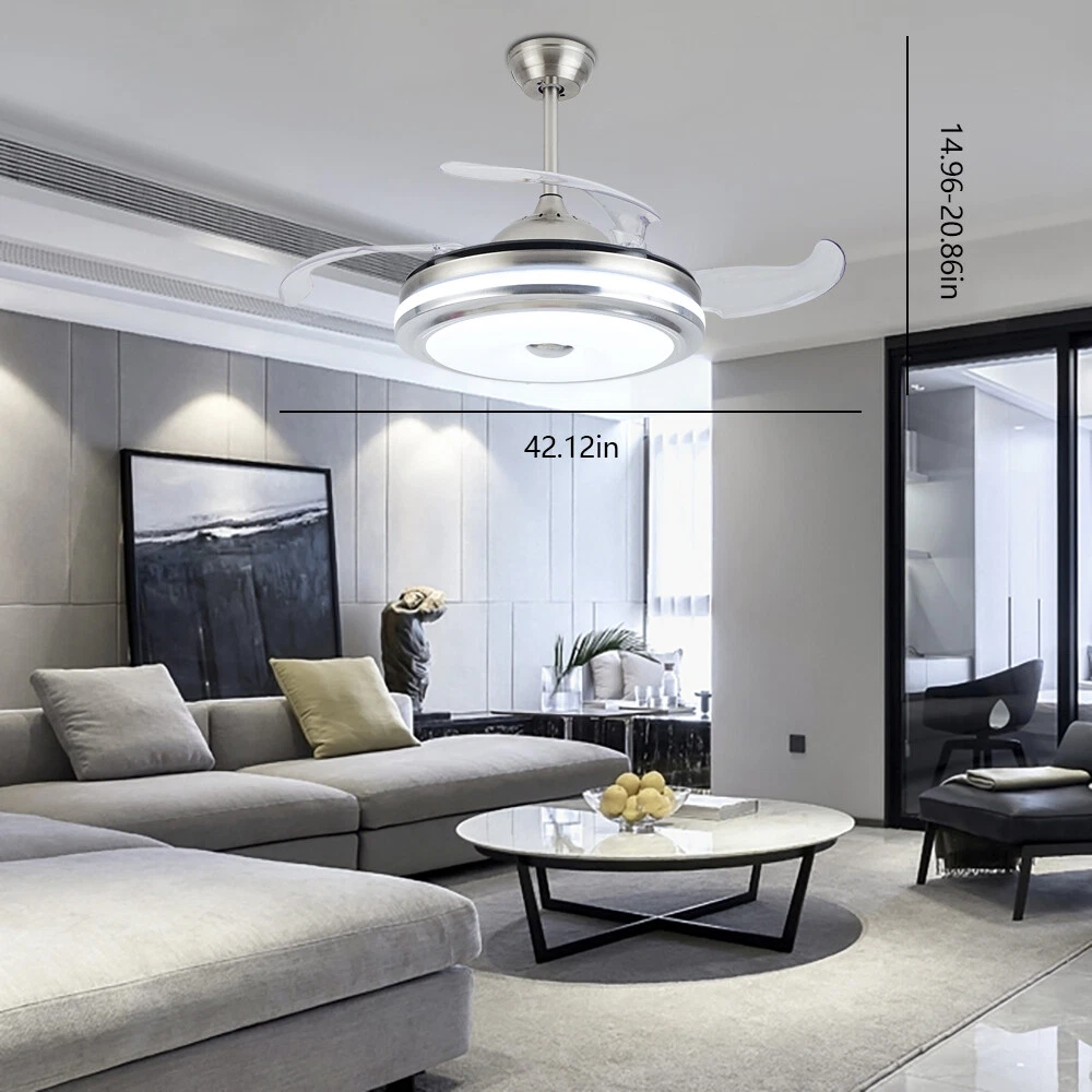36"/42" Invisible Ceiling Fan Lamp Remote Control Dimmable LED Chandelier Light Specifications: LED color: 3 color(white,warm white,neutral white ) Material: Metal+ABS fan Motor: high-quiet motor Fan blade; 4 leaf plastic fan blade Dimensions: Diameter 36" , height 10cm(20cm spare parts) Diameter 42" , height 10cm(20cm spare parts) Color: chrome Lamp: 36 watt Bulb: led Voltage: 110V Use For:Living Room / Bed Room/ Study Room /Restaurant Package: 1 light+RC control Modern invisible fan chandelier: Fan and chandelier combined into one with remote control, automatic telescopic fan blade, LED lamp beads Ceiling fan with remote: . Dimmable LED lights have 3 color changes (White-Warm-Yellow), Fan has 3 speed settings (Low-Mid-High). All these functions can be easily contr 42inch/36inch Chandelier LED Ceiling Fan Light 3-Speed Pendant Lamp & Remote 36W 36"/42" Invisible Ceiling Fan Lamp Remote Control Dimmable LED Chandelier Light Specifications: LED color: 3 color(white,warm white,neutral white ) Material: Metal+ABS fan Motor: high-quiet motor Fan blade; 4 leaf plastic fan blade Dimensions: Diameter 36" , height 10cm(20cm spare parts) Diameter 42" , height 10cm(20cm spare parts) Color: chrome Lamp: 36 watt Bulb: led Voltage: 110V Use For:Living Room / Bed Room/ Study Room /Restaurant Package: 1 light+RC control Modern invisible fan chandelier: Fan and chandelier combined into one with remote control, automatic telescopic fan blade, LED lamp beads Ceiling fan with remote: . Dimmable LED lights have 3 color changes (White-Warm-Yellow), Fan has 3 speed settings (Low-Mid-High). All these functions can be easily controlled by remote Modern Fan Light Chandelier: 42 inches when the fan is extended, and 19 inches when the fan blade is retracted. Bedroom Ceiling Fans Material: metal body + acrylic lamp cover + ABS retractable blades + pure copper motor(providing powerful air flow, quiet and durable. With vents, it can reduce the internal temperature of the main unit and extend the life of the motor.) Payment Delivery details Terms of sales About us Contact us Payment We accept ebay payment 。 Fees such as import duties, taxes are not included in the item price or shipping costs. These charges are the buyer's responsibility. Delivery details Shipping: 2-9 working days to: USA Terms of sales We maintain high standards of excellence and strive for hundred percent customer satisfaction. Feedback is very important to us. We hope that you contact us immediately before you give neutral or negative feedback, so that we can address your concerns. It is impossible to address issues if we do not know about them! About us Your satis faction is our ultimate goal. We work hard to earn your trust and future business. Our certified technicians have tested each item before shipping. The unit comes with 1 year limited warranty on all manufacturing defects. a) If you receive a defective item, you may return it or ask for a discount. Please contact us within 14 days after you receive the package. b) What you returned must be intact and in its original packaging as re? u. Customer is responsible for shipping costs of the returned item. c) We will cover the cost of shipping back t with the shipping rate indicated in the registration page. We will send you a new unit or refund the full payment you paid. Thank you. Contact us Business Hour Business Hour: Monday To Friday: 8:30 AM to 5:00 PM (Beijing China time) Due to time zones, our reply to your questions may not be immediately. But within above working time, we will reply your email within 24 hours. If it's non-workdays, please kindly be patient and wait till Monday. Please contact us with ebay message. Please feel free to contact us if you have any questions. Monday To Friday: 8:30 AM to 5:00 PM (Beijing China time) Due to time zones, our reply to your questions may not be immediately. But within above working time, we will reply your email within 24 hours. If it's non-workdays, please kindly be patient and wait till Monday. Please contact us with ebay message. Please feel free to contact us if you have any questions.