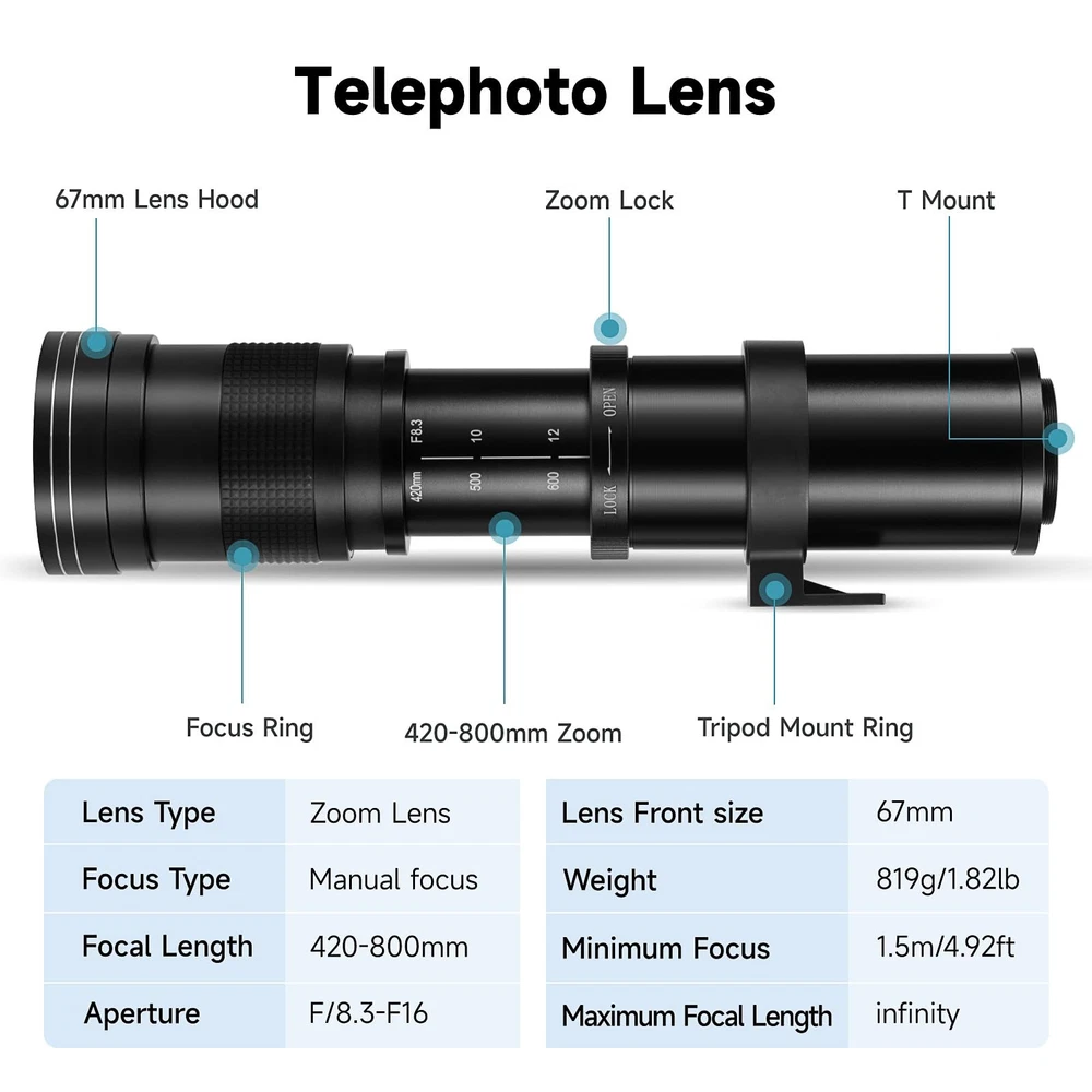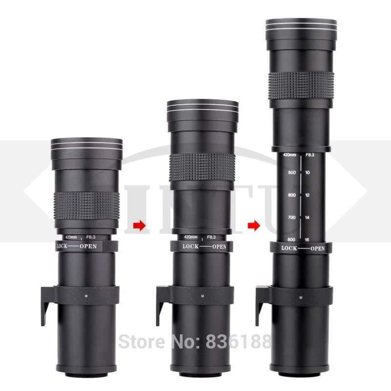 If the camera can't press shutter or "Lens not attached", please find a custom setting to set "Release SHUTTER W/O LENS" to ENABLE make it work. ★ About image are too dark or white, Pls set camera shutter speed or ISO resolve.(If mage white: Set more fast shutter speed,1/100s to 1/250s to 1/500s....,Until the picture is normal If image dark:Set lower shutter speed,1/500s to 1/250s to 1/100s...Until the picture is normal) and use with a tripod and remote to keep image stable. ★ [Premium Quality] 420-800mm MF Super HD Telephoto lens, Solid Construction with Brass and Aluminum, Small size 10.6 x 3.5 x 3.5 inch, lightweight 500g=1.1LB, easy to carry to anywhere. ★ Compatible with Canon EOS R, R R3 R5 RP R6 R7 R10 RP Digital Mirrorless Cameras, Perfect for landscape, portraits, still life, traveling, wedding and wildlife photography. ★ Great for the wildlife or nature photographer who wants to be hidden while taking photos of the subject. Advances in ultra high-index / low-dispersion optical glasses, new barrel materials, and exotic anti-reflection coatings.