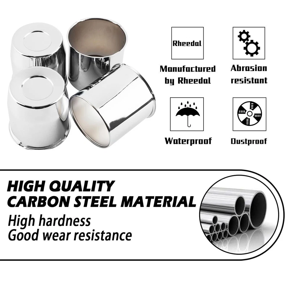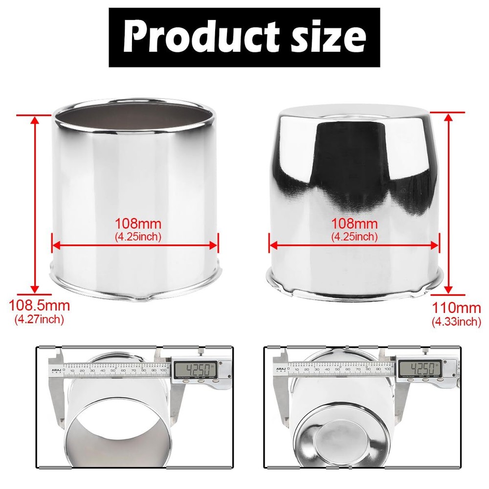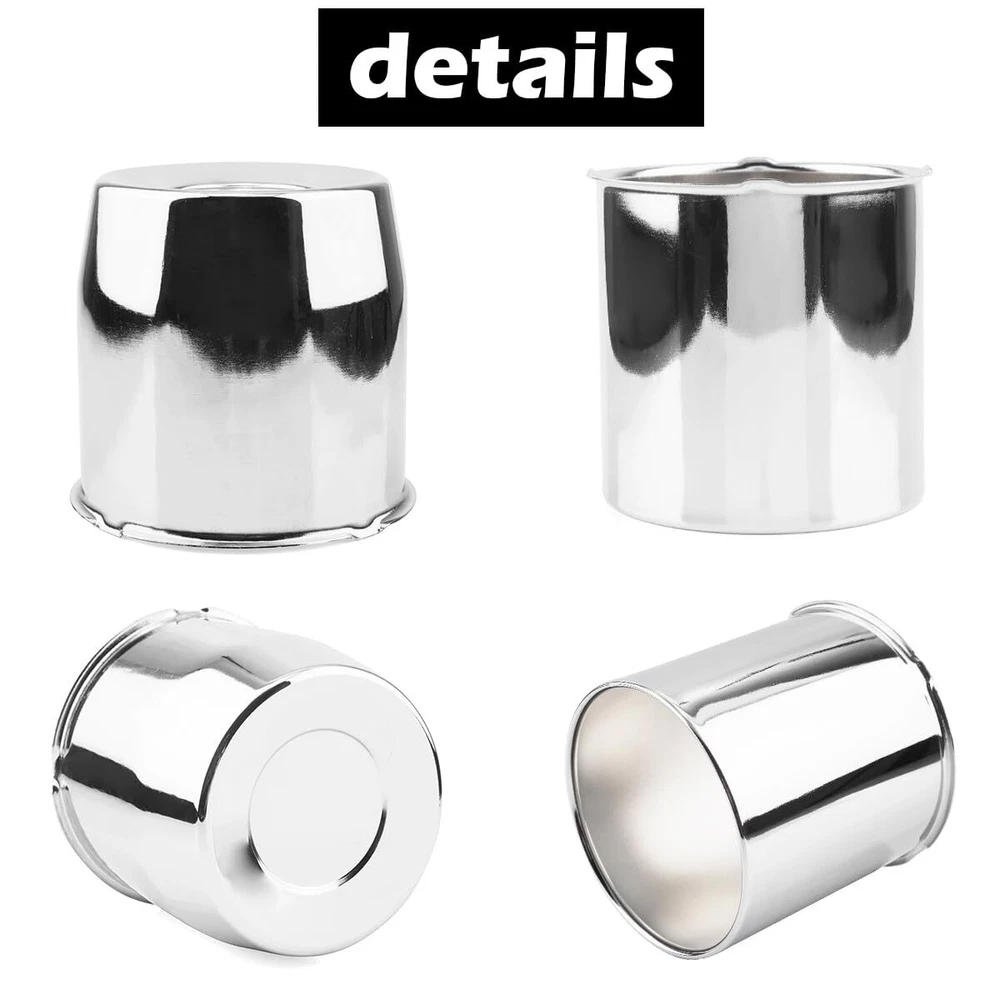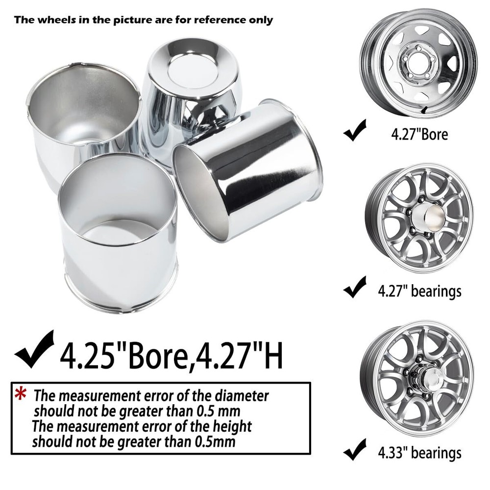 4Pcs 4.25inch Trailer Wheel Center Caps Push Through Center Hub Cap for Truck SUV RV Wheel Rim, Combination of Concave and Open End Chrome Wheel Hub Covers Size: A set of 2 concave wheel center caps and 2 open wheel center caps, each with a mounting diameter of 4.25 inches, a height of 4.33 inches for concave hub caps, and 4.27 inches for open hub caps. If you are unsure of the size of the center hole, please use a digital caliper to check. For the diameter model of the wheel center hub cover, the parameter error is less than 0.5 mm, and the fitting is successful. Wide car compatibility: Fits 4.25" centre holes only. This is a replacement wheel centre cap for trailer, truck, SUV or caravan wheels. Please make sure the wheel cover fits your wheels. Make your vehicle stand out and be instantly recognisable on hiking and camping trips! Premium quality: The trailer wheel centre cap is made from carbon steel and chrome plated. Scratch resistant, durable and smooth to the touch. The centre hub cap creates a special focal point on the wheel and the elegant design enhances the style and appearance of your car. Easy to install: Push through the centre cap and the cap is installed from the back of the wheel, quick and easy to install. Replace your old damaged or peeling wheel centre caps and give your car a new look. Use these wheel covers to quickly and effectively improve the appearance of your car. Wheel upgrade: Push-on hubcaps effectively block mud, sand, dust and other debris from entering the wheels, reducing dirt build-up in the wheel area. Keeps wheel hubs free from wear and damage, making the vehicle smoother and more stable for off-roading, wading and other wilderness adventures. 4 Custom Wheel hub Caps made by SKU: 20274310CHx1-RH Rim Cap Diameter: 4.25" Height: Concave 4.33", Open 4.27" Material: Carbon Steel Finish: Chrome Installation: Cap installs from back of wheel (Push through) Condition: New Fits: These Wheel Caps Fit 4.25" Center Bore Only Please Use Digital Caliper Check the Center Bore Size if you are not sure Shipping We offer FREE shipping on all orders! We ship within Three business days of payment, usually sooner. We use a selection of shipping services such as UPS, FedEx, USPS etc. We only ship to the lower 48 states, no APO/FPO addresses or PO Boxes allowed. Local pickups and combined shipping options are not provided at this time. Return You can return a product for up to 30 days from the date you purchased it. Any product you return must be in the same condition you received it and in the original packaging. Please keep the receipt. Payment We accept payment by any of the following methods: PayPal Please pay as soon as possible after winning an auction, as that will allow us to post your item to you sooner! Feedback Customer satisfaction is very important to us. If you have any problem with your order, please contact us and we will do our best to make you satisfied. Contact Us If you have any queries, please contact us via ebay. We usually respond within 24 hours on weekdays. Please visit our eBay store to check out other items for sale! Thank you for shopping at our store.