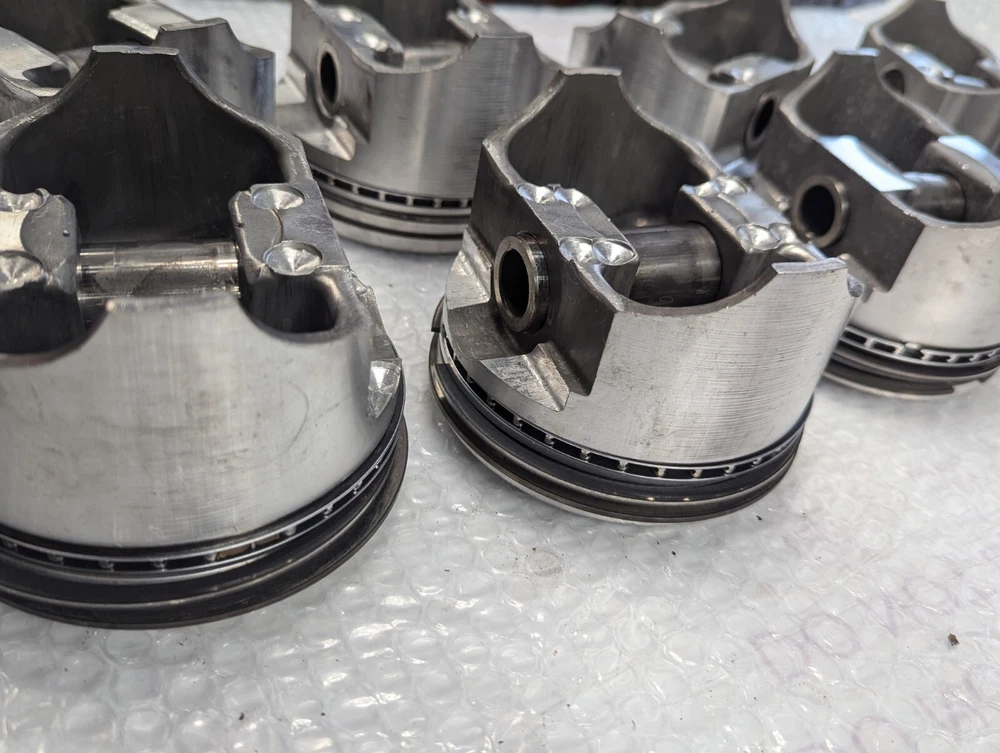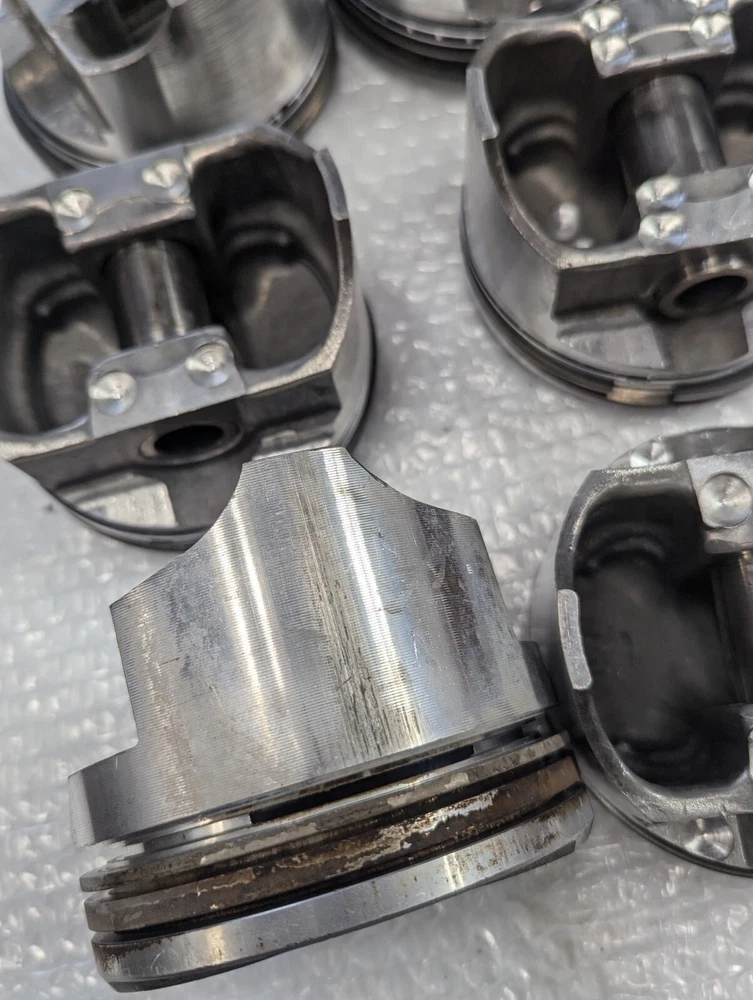 Used set of old TRW forged pistons for 427 Chevy. One piston has a small scuff on the skirt as shown in pictures. They are for 5.280" Sold as is.
