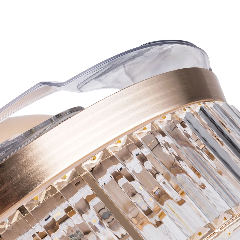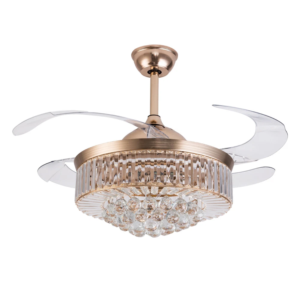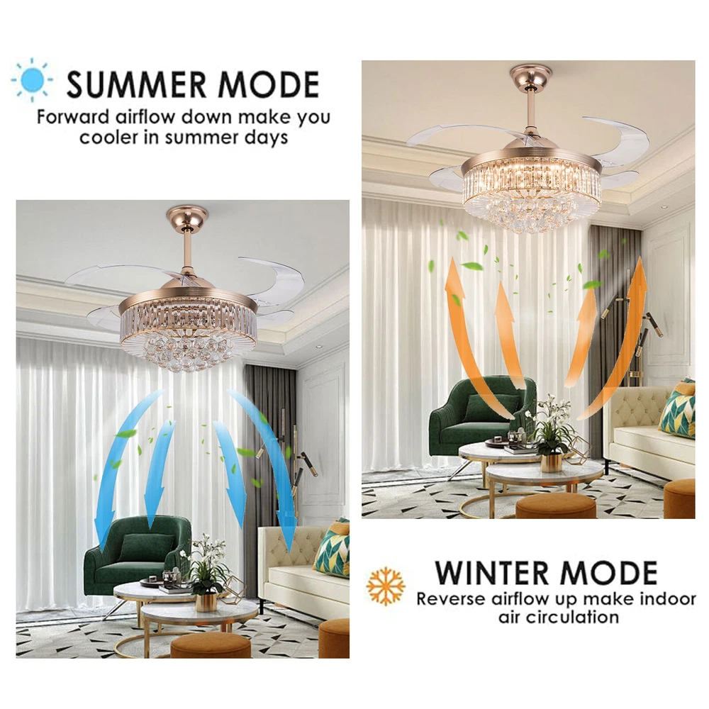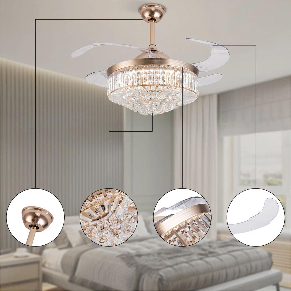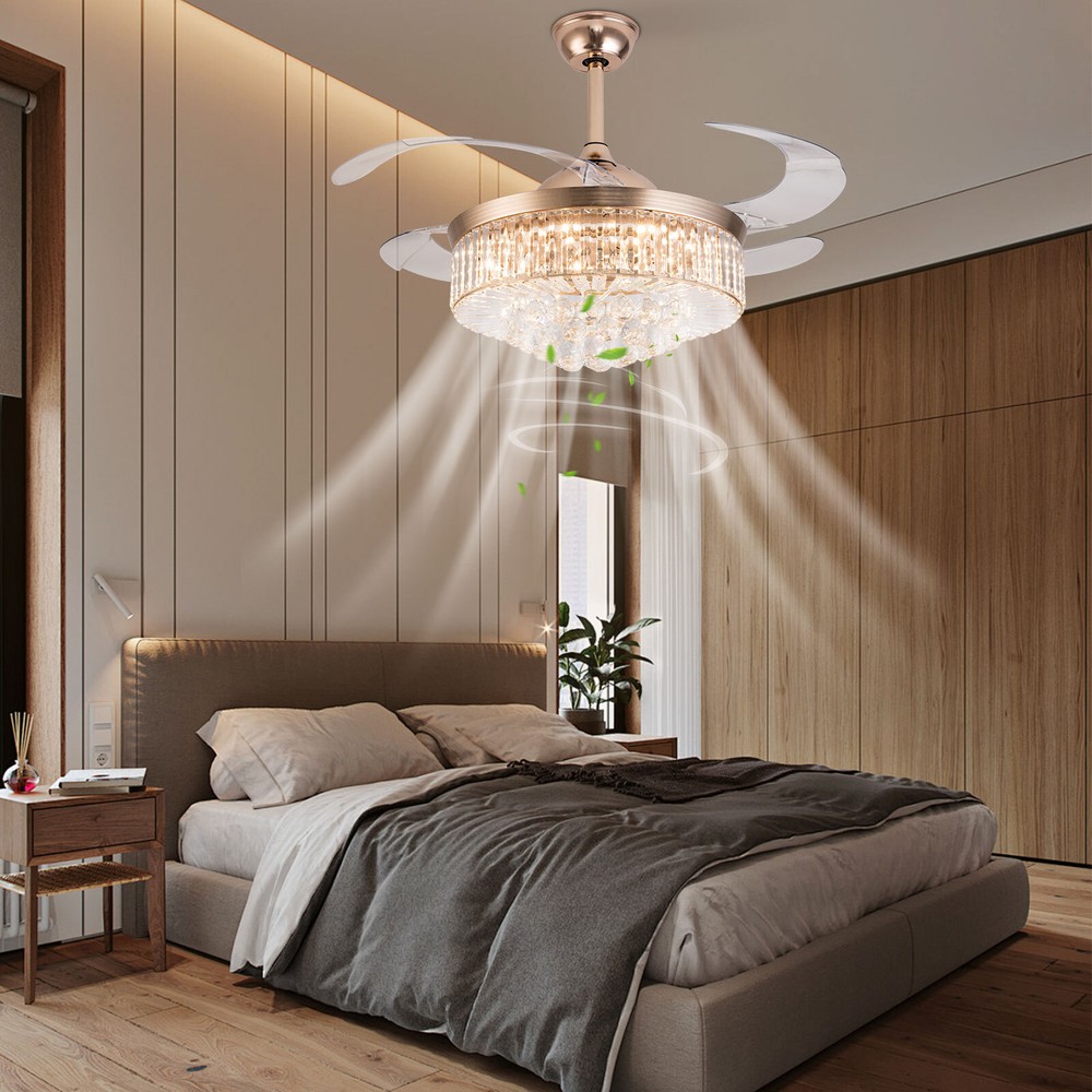 This stunning 42" chandelier-fan combo is a game-changer! The elegant crystal design adds instant luxury while the LED lighting offers adjustable warmth. I love controlling both fan speed and light color from the remote - perfect for setting any mood. The sturdy construction feels premium, and it installs easily in most ceilings. The invisible blades are genius, keeping the elegant look when off while moving great air on low noise. Three color temperatures let me go from bright task lighting to cozy ambiance. Beautiful and functional - what more could you want?