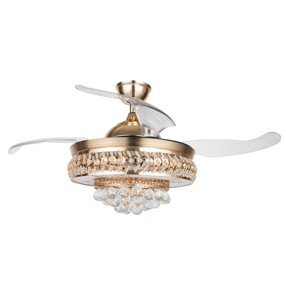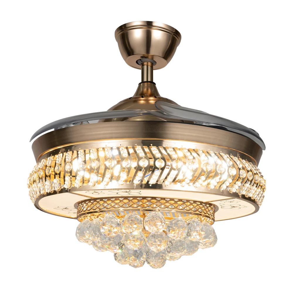 【Remote Control】Integrating turn on light with 3 color changes (white, warm white, neutral white)you can use the remote control to choose the color you like. 【Crystal desige】 the 3-layer body is all decorated with K9 crystal and absolutely stunning when the light is on. Light effect makes your room full of luxury. 【Ceiling Fan】With ABS blades, It can be used as an electric fan, and it can also be used for lighting 【Applications】Ideal for living room, dining room, foyer, villa, bedroom, restaurant, study room, and other places to decorate lighting fixtures. 【Customer Service】If you have any issues, inquiries or need assistance, please feel free to contact us, we will try our best to help you. Style: Modern Type: Ceiling Fan Chandelier Light Source: Led Lighting Board(Include) Switch: remot 42" Luxury Ceiling Fan Light w/ Remote Control LED Fan Lamp Chandelier Fixture ❤Welcome❤ Description The shining lights on the ceiling of your home are also one of the expressions of your aesthetics and taste, and this crystal ceiling fan with lights is your good choice! The unique gold frame, K9 crystals, and ABS material fan blades look elegant and poised, making this product a highlight of your home. The bright and energy-efficient LED strip provides a large enough lighting area to meet your daily lighting needs. With the simple operation of the remote control, you can easily create a cool and bright space. Key Features Durable and Sturdy: An iron frame with an electroplating process, high-quality ABS material fan blades, bright K9 crystal balls, a white acrylic lampshade with printed flower patterns, and a built-in pure copper motor with silicon steel sheet make it more anti-corrosive , wear-resisting , durable and sturdy. Dual Control: You can use the wall switch(not included) to control the lights, or use the equipped remote control to turn on/off the lights and fan within a range of 32ft. Adjustable Wind Speed&Time: Three different fan speeds(low/middle/high) can be set through the remote control, giving a customized experience. Also, the intelligent timing function allows automatically turning off the fan after 1h, 2h, or 4h. Excellent Lighting Effect: The white acryl ic lampshade with flower patterns has a stronger transparency, plus a 107.63-258.33ft ² large illuminated area and three different light colors of 3000-6000K(cold/warm/neutral light), stunning when only turning on the lights and making your room full of luxury and modern sense! Optional Height: Our package contains two down rods (3.93 inches, and 9.84 inches in length), which are suitable for rooms with ceiling heights ranging from 8.2 to 10.5 feet. You can choose the more suitable one to use based on the height of the ceiling in your room. Retractable Design: The ABS material fan blades can automatically stretch/shrink when turned on/off. This design saves space when turned off and makes it stunning for your guests because of the retractable techiness. Low Noise: The noise emitted by the pure copper motor during operation is only about 30 decibels, which does not easily affect you or others. User-friendly Design: Compared with traditional incandescent bulbs, it adopts the LED strip, which can maintain soft, strobe-free lighting effects and bring you higher brightness with lower energy consumption, saving your electricity bills and protecting your eyes. Details Ceiling Plate: It measures 5.7*2.55 inches, increasing the contact area with the ceiling, so that the lamp body is firmly fixed on the ceiling and not easy to fall. Small Indicator: It can help you to have a better grasp of its current operation status and avoid operational errors. Mute Button: During operation, it can help you turn off the sound at key presses and enjoy the quiet environment. Cooling Holes: The cooling holes on the connection plate help timely heat dissipation and reduce noise to a certain extent. Application This crystal ceiling fan with lights is suitable for home and commercial spaces with a ceiling height of 8.2 to 10.5 feet, such as living rooms, restaurants, bedrooms, foyers, farmhouses, bars, galleries, exhibition rooms, hotels, coffee shops, terraces, study rooms, attics, etc, providing 107.63-258.33ft ² of lighting space. Specifications Material: Iron, ABS, Copper, K9 Crystal, Acrylic, Silicon Steel Sheet Color: Gold Remote Control: Yes Assembly Required: Yes Surface Treatment: Electroplating Process; Printed Installation Type: Ceiling Mount Indoor/Outdoor Usage: Indoor Power Source: Corded Electric Control Method: Remote, Wall Switch(Not Included) Battery Type: AAA (Included) Lighting Source: LED Strip Light Color: Cold Light (6000K), Warm Light (3000K), and Neutral Light Timing Function: 1/2/4h Wind Speed: Low, Medium, High Noise: About 30dB Voltage: 110V Max Lighting Power: 36W*2 Fan Power: 65W Remote Control Distance: Within 10m/32ft Illumination Area: 10-24㎡/107.63-258.33ft ² Suggested Installation Height: 2.5-3.2m/8.2-10.5ft Long Down Rod Length: 25cm/9.84inch Short Down Rod Length: 10cm/ 3.93inch Ceiling Plate Size(D*H): 14.5*6.5cm/5.7*2.55inch Gross Weight: 14kg/30.86lbs Net Weight: 12.4kg/27.33lbs Product Size After Unfolding Fan Blades (D*H): 106*69cm/41.73*27.16inch Product Size After Unfolding Fan Blades (D*H): 106*47.5cm/41.73*18.7inch Product Size After Folding Fan Blades (D*H): 48.5*69cm/19.09*27.16inch Product Size After Folding Fan Blades (D*H): 48.5*47.5cm/19.09*18.7inch Package Size: 54.5*53.5*30cm/21.45*21.06*11.81inch Package Included 1*Crystal Ceiling Fan with Lights 1*Remote Control 2*AAA Batteries 1*English Manual All Accessories for Assembly Notes Please carefully read the manual and strictly follow the precautions to have a better experience. It can be installed on a horizontal or inclined ceiling(<25°). Professional installation is recommended. Please do not power on until your fixture is fully assembled. Please allow the slight color difference caused by the shooting light and 1-3cm error du