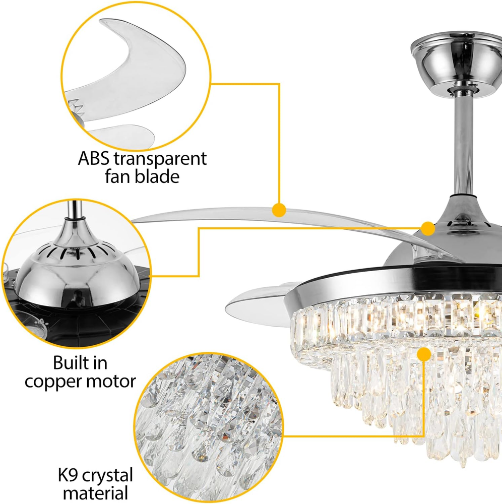 Store New Arrivals Add to Favorite View Feedback Contact Crystal Ceiling Fan with Light,42Inch Luxury Chandelier, Modern Stepless Dimmable Chandelier Ceiling Fan 6 Speed Indoor Fandelier Retractable Blade for Bedroom Living Room Dining Room Description Light Source Type LED Item model number 23 Style Modern Number of Items 1 Power Source Corded Electric Number of Light Sources 1 Control Method Remote Embellishment Crystal Batteries Included? No Lighting Method Remote Controller Type Remote Control Unit Count 1.0 Count Room Type Bedroom, Living Room, Dining Room Finish Chrome Finish Assembly Required Yes Installation Type Semi Flush Mount Material Metal Efficiency energy efficient Switch Type Remote Model Name Ceiling Fans Finish Type Chrome Finish Specific Uses For Product Home Included Components Remote Item Package Quantity 1 Indoor/Outdoor Usage Indoor Brightness Adjustable (10% to 100%) Country of Origin China Light Color Cool White, Nature White, Warm White Water Resistance Level Not Water Resistant Batteries Required? No Item Weight 24.6 pounds Light fixture form Ceiling Special Features Remote Controlled Special Feature Remote Controlled Bulb Base E26 Medium Shade Color silver Mounting Type Ceiling Mount Color Silver4 Wattage 36 watts Voltage 110 Volts Plug Format A- US style Recommended Uses For Product Remote control, Retractable fan blades,Color temperature changes & adjustable,Brightness dimmable,6 fan speed, Reversable blades,Timer, Silent motor Shade Material Metal Fixture Type Non Removable Size 42Inch Product Dimensions 42"L x 42"W x 23.9"H Number Of Pieces 1 【Unique Crystal Ceiling Fan with Light】It's the perfect combination with a crystal ceiling fan and chandelier light.42-inch silver chandelier fan with top k9 round crystal, acrylic clear retractable blades*4, metal lamp body. A variety of decoration styles can be a perfect match. Crystal ceiling fan with natural soft wind provides a healthy and super quiet living environment for family 【Two Rotation Modes and 6 Speed】chandelier fan provides 6-Gear fan speed. Reversible fan blades keep your room cooler in summer and improve indoor air circulation in winter 【Dimmable Brightness and Adjustable Color Temperature】Dimmable light brightness from 10% to 100%, and color temperature can be gradually adjusted from 3000K to 6000K(warm white, nature white, cool white). The chandelier ceiling fan also has a timer function (2h automatically turns off). All functions can be controlled by remote control 【Retractable and Reversible Fan Blades】The acrylic invisible blades will automatically extend/retract when the crystal fandelier is turned on/off. Diameter 42" when extended and 20" when closed 【Customer Service】The appearance of the fandelier is exquisite, Suitable for Indoor living rooms, bedrooms, dining rooms, corridors, etc. The fan needs basic assembly skills, a professional would be highly recommended. Any questions, please leave us a message, and we will handle it immediately Notice: Only ceiling fans with light controlled by a remote have memory function( It means, you set up natural lights by remote control before you turn off the light. and when you open it again, you will get the same natural lights) Product Description Color Temperature Dimmable (3000K-6000k) Light Wattage 36W Voltage 110V Dimensions 42 Inch, 4 Retractable Blades Brightness Adjustable(10%-100%) Applicable area 100-300 sq.ft. Timing Function 2hours automatically close Light Source Type LED(Light Kit Included) ABOUT US We offer the best prices around on high quality products. Our E-store includes media such as books, movies, music and games while offering electronics, toys, sporting apparel, clothing, tools, general home, garden items and more. SHIPPING We are always working hard to ensure your package arrives as soon as possible. Please understand that some factors like weather, high postal traffic, and the performance of shipping companies are outside of our control. We offer free shipping to the lower 48 states and ship within 2 business days of payment, usually sooner. We do not accept P.O. Boxes. Please provide a physical address. For shipping outside of the continental USA, we only use eBay's Global Shipping Program.The item is shipped to KY and then sent to the rest of the world. International customers are responsible for all duties and taxes. Continue to check out in order to calculate costs for shipping the item to your country. Messages regarding eBay's Global Shipping Program MUST be directed at eBay EXCLUSIVELY. RETURNS We offer a 30-Day Return Policy on items which you are not completely satisfied with. You have the option for a full-refund or an exchange of the item. No returns are available on items shipped outside of the USA. PAYMENT We accept PayPal. CONTACT US This page content is yet to come Please ad us to your favorite seller and visit again later Thank You CUSTOMER SATISFACTION We try our very best to make sure every customer is completely satisfied. If there's a problem, message us! We're happy to help. WE ACCEPT Copyright © 2021 AutoDS. | All Rights Reserved