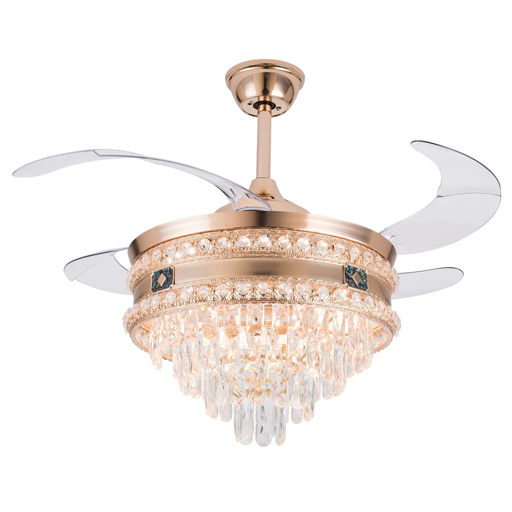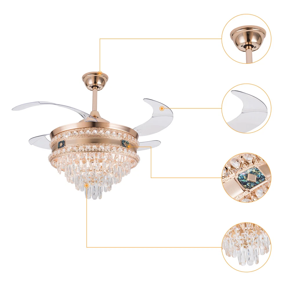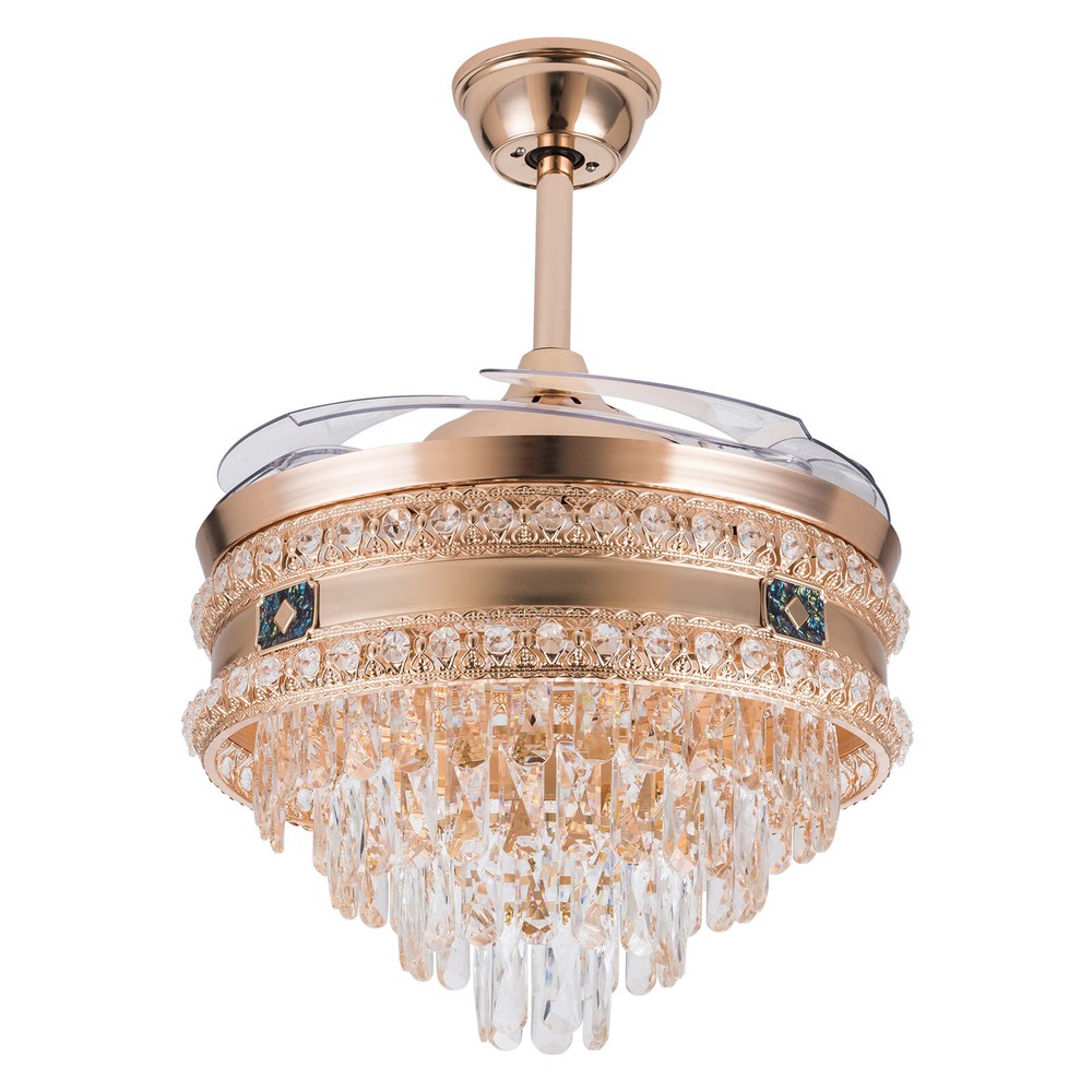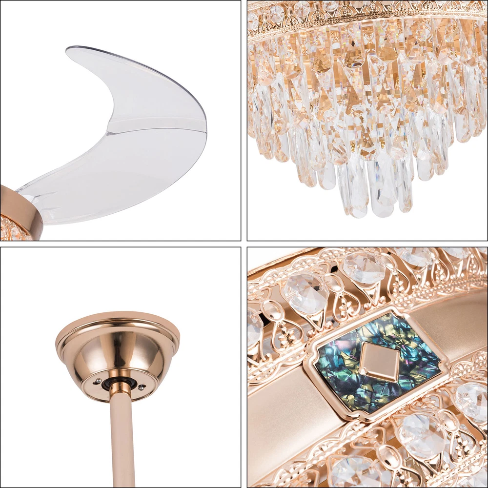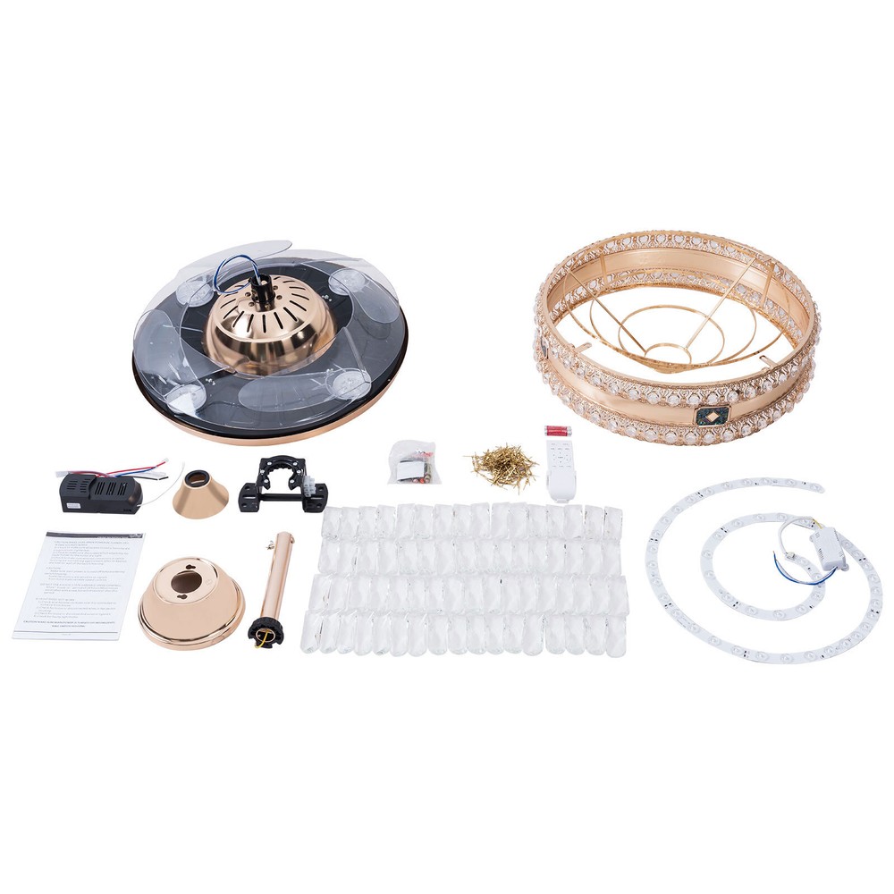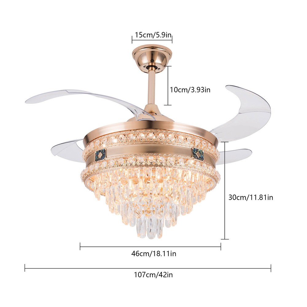 Specification Material: Aluminum, Acrylic, Glass Process: Polishing Color: Gold Style: Modern Shape: Circular Assembly Required: Yes Indoor/Outdoor Use: Indoor Light Fixture Form: Chandelier Installation Type: Ceiling Mount Light Source Type: LED (Included) Light Color: Cold, Neutral, Warm Motor Type: Pure Copper Motor Timing: 1/2/4 Hours Wind Speed: 6 Voltage: 85-265V Power: 45W Noise: 35 dB Lumen: 180lm Battery Type: 2 * AAA Batteries (Included) Color Temperature: 3000-4500-6000K Applicable Room Height: 2.8m/9.19ft Lighting Area: 15-20m²/ 161.46-215.28ft² Remote Control Distance: 3-5m/9.84-16.4ft Pole Length: 10cm/3.93in, 20cm/7.87in Overall Height: 50cm/19.68in, 60cm/23.62in Lampshade Size (D*H): 46*30cm/18.11*18.81in Base Diameter: 15cm/5.91in 42in Dimmable LED Ceiling Fan Light Foldable Fan Blades Fan Lamp w/Remote Gold Description Let's add a fresh breeze to the dull room! Our ceiling fan light uses a pure copper motor, and the adjustable wind speed can quietly help air circulation. You can control the fan speed and time-setting through the remote control, which is smart and convenient. Generous crystal pendants and an exquisite lampshade can also add luxury to your room. Key Features High-quality Material: It is made of aluminum, glass, and acrylic, which is durable and safe, and has strong resistance to corrosion, high temperature, and shock. Magnificent Appearance: The luxurious and elegant golden bracket and sparkling crystal decorations make the light cast a fascinating effect of light and shadow, adding a luxurious atmosphere to your home. Excellent Light Source: The LED light source provides more stable and even lighting. The three light colors (warm, neutral, and cold) with a color temperature range of 3000K, 4500K and 6000K , which can fully meet your usage needs in different scenarios, making it more convenient. Smart Control: The timing function(1/2/4H), 6-speed wind speeds, and reverse function can be adjusted through the remote control, which can simplify your daily routine and enhance your overall living experience. High Safety: The semi-open lampshade and the heat dissipation holes on the top of the fan ensure quick heat dissipation during use, protecting the circuit from short circuits or open circuits caused by overheating, making your use safer. Reversible Function: In addition to enjoying a cool environment in summer, you can also reverse the direction of the fan in winter, blowing hot air into the room from the top and increasing the room temperature. Adjustable Height: You can choose between 3.93-inch and 7.87-inch lamp poles to accommodate rooms of different heights. Exquisite Gift: With good performance and a modern appearance, it can be used as a housewarming gift for parents, friends, and lovers so that they can also enjoy a more exquisite life. Details Foldable Fan Blades: When the fan function is not in use, the fan blades will automatically fold up to prevent dust accumulation while ensuring a beautiful decoration effect. Stable Base: The 5.91" thickened and enlarged base ensures stronger load-bearing capacity and stability. Application With a lighting area of 161.46-215.28ft ², this product is suitable for rooms with a height of 9.19 feet, such as the living room, bedroom, study room, office, cafe, restaurant, hotel, foyer, and other places. Specification Material: Aluminum, Acrylic, Glass Process: Polishing Color: Gold Style: Modern Shape: Circular Assembly Required: Yes Indoor/Outdoor Use: Indoor Light Fixture Form: Chandelier Installation Type: Ceiling Mount Light Source Type: LED (Included) Light Color: Cold, Neutral, Warm Motor Type: Pure Copper Motor Timing: 1/2/4 Hours Wind Speed: 6 Voltage: 85-265V Power: 45W Noise: 35 dB Lumen: 180lm Battery Type: 2 * AAA Batteries (Included) Color Temperature: 3000-4500-6000K Applicable Room Height: 2.8m/9.19ft Lighting Area: 15-20m²/ 161.46-215.28ft² Remote Control Distance: 3-5m/9.84-16.4ft Pole Length: 10cm/3.93in, 20cm/7.87in Overall Height: 50cm/19.68in, 60cm/23.62in Lampshade Size (D*H): 46*30cm/18.11*18.81in Base Diameter: 15cm/5.91in Fan Diameter: 107cm/42in Package Included 1*Ceiling Fan Light 1*Remote Controller 1*English Manual Other Accessories for Assembly Notes Please make sure that the size of the ceiling fan matches your room and carefully make a choice. Normally, the expansion screw will blow up after the force is applied. Please make sure the power is cut off before installation and when you clean the light. It cannot be installed on a sloped ceiling. The surface of the product and the electric wire should avoid scratching when mounting, and electric insulation gloves (not included) must be worn when installing. To ensure your safety, professional ones with an electric license are recommended to carry out the installation if possible. The wall control (not included) can only control lights, not ceiling fans. Please allow the slight color difference caused by the shooting light and 1-3cm error due to manual measurement, and make sure you do not mind before ordering. Payment Delivery details Terms of sales About us Contact us Payment We accept ebay payment 。 Fees such as import duties, taxes are not included in the item price or shipping costs. These charges are the buyer's responsibility. Delivery details Shipping: 2-9 working days to: USA Terms of sales We maintain high standards of excellence and strive for hundred percent customer satisfaction. Feedback is very important to us. We hope that you contact us immediately before you give neutral or negative feedback, so that we can address your concerns. It is impossible to address issues if we do not know about them! About us Your satis faction is our ultimate goal. We work hard to earn your trust and future business. Our certified technicians have tested each item before shipping. The unit comes with 1 year limited warranty on all manufacturing defects. a) If you receive a defective item, you may return it or ask for a discount. Please 