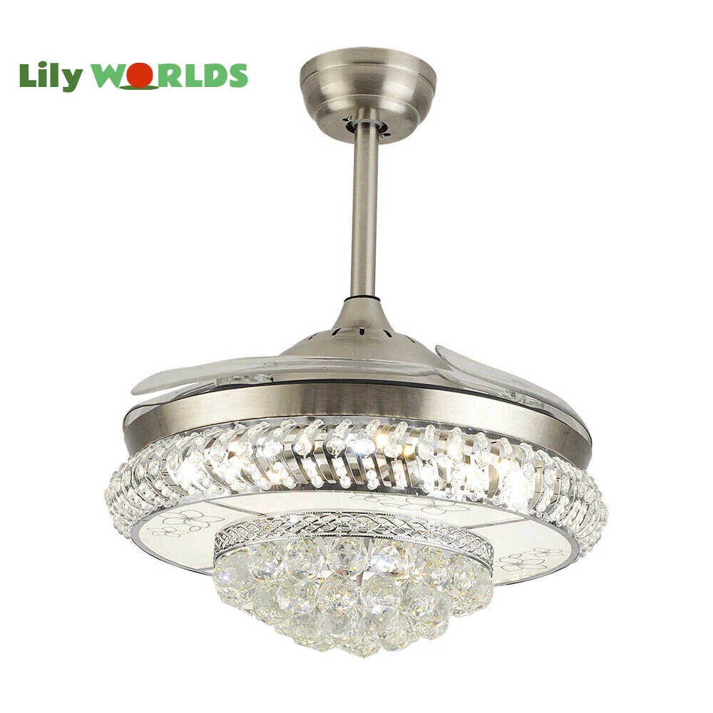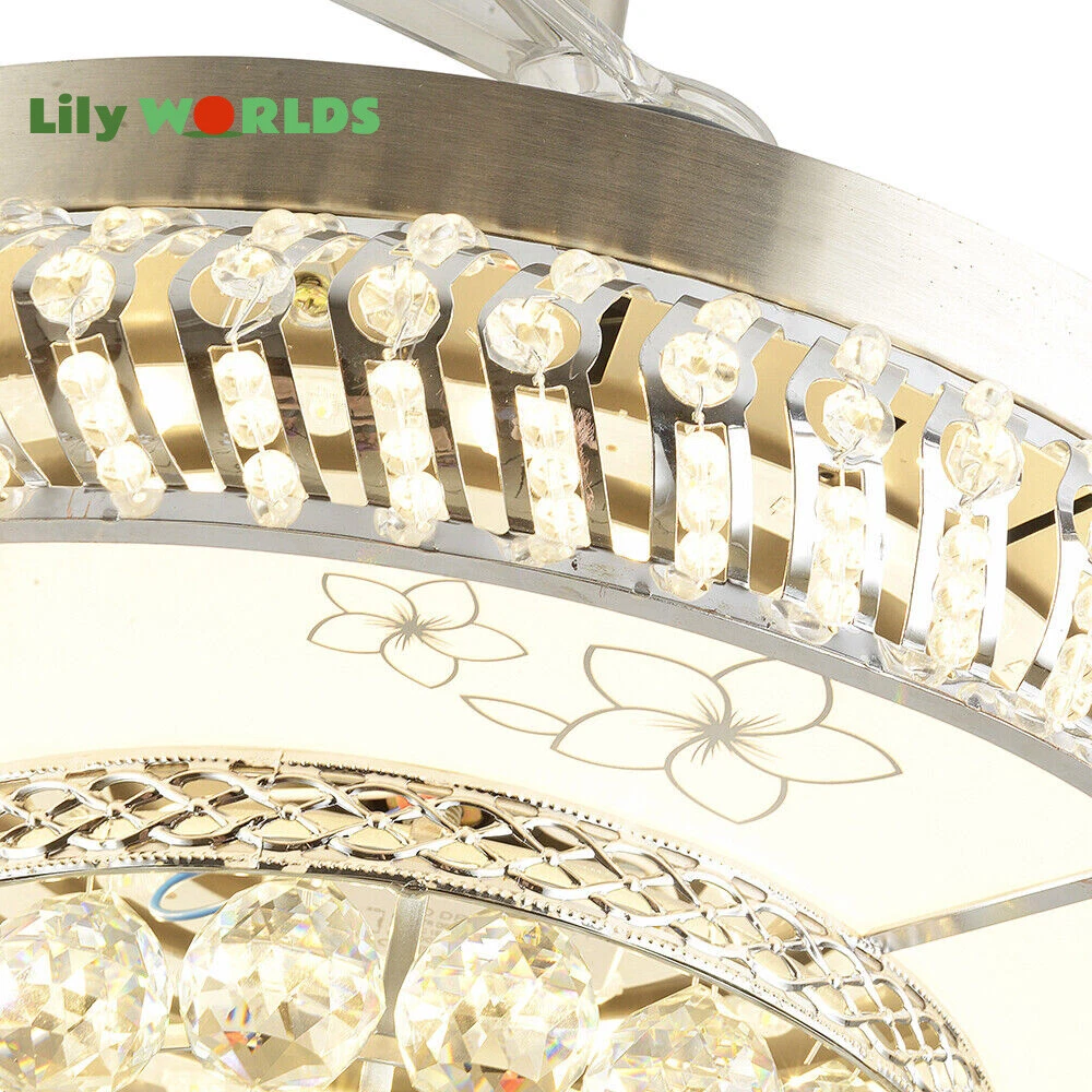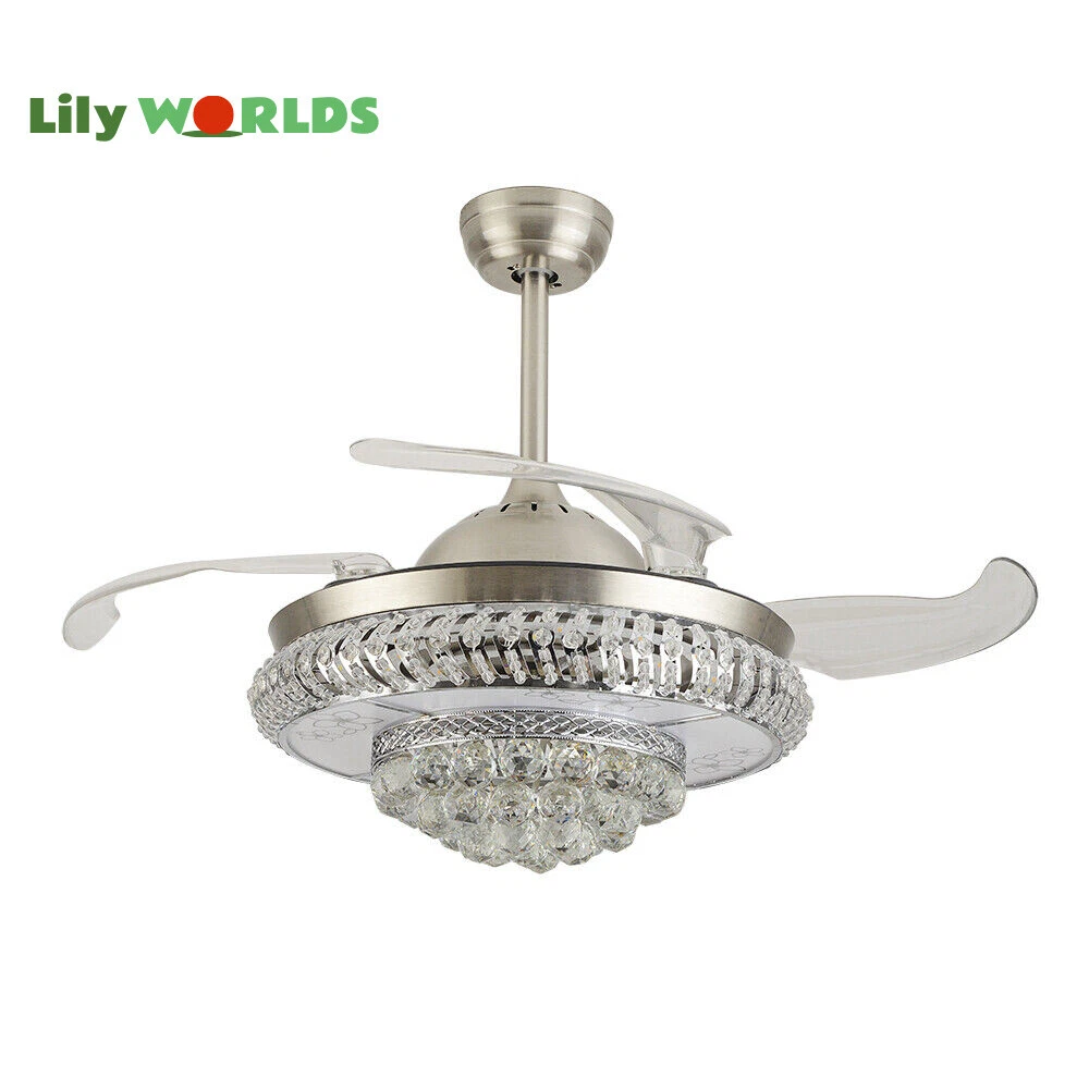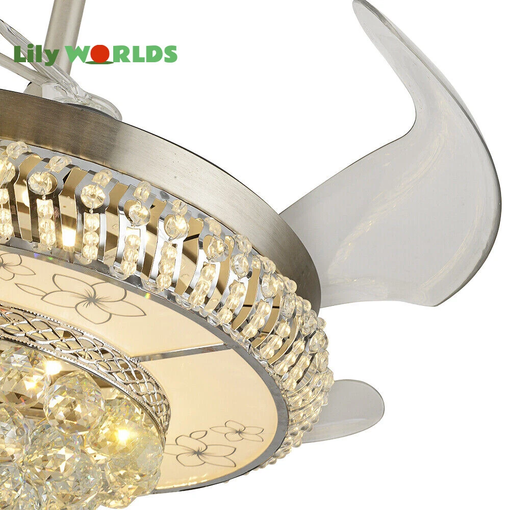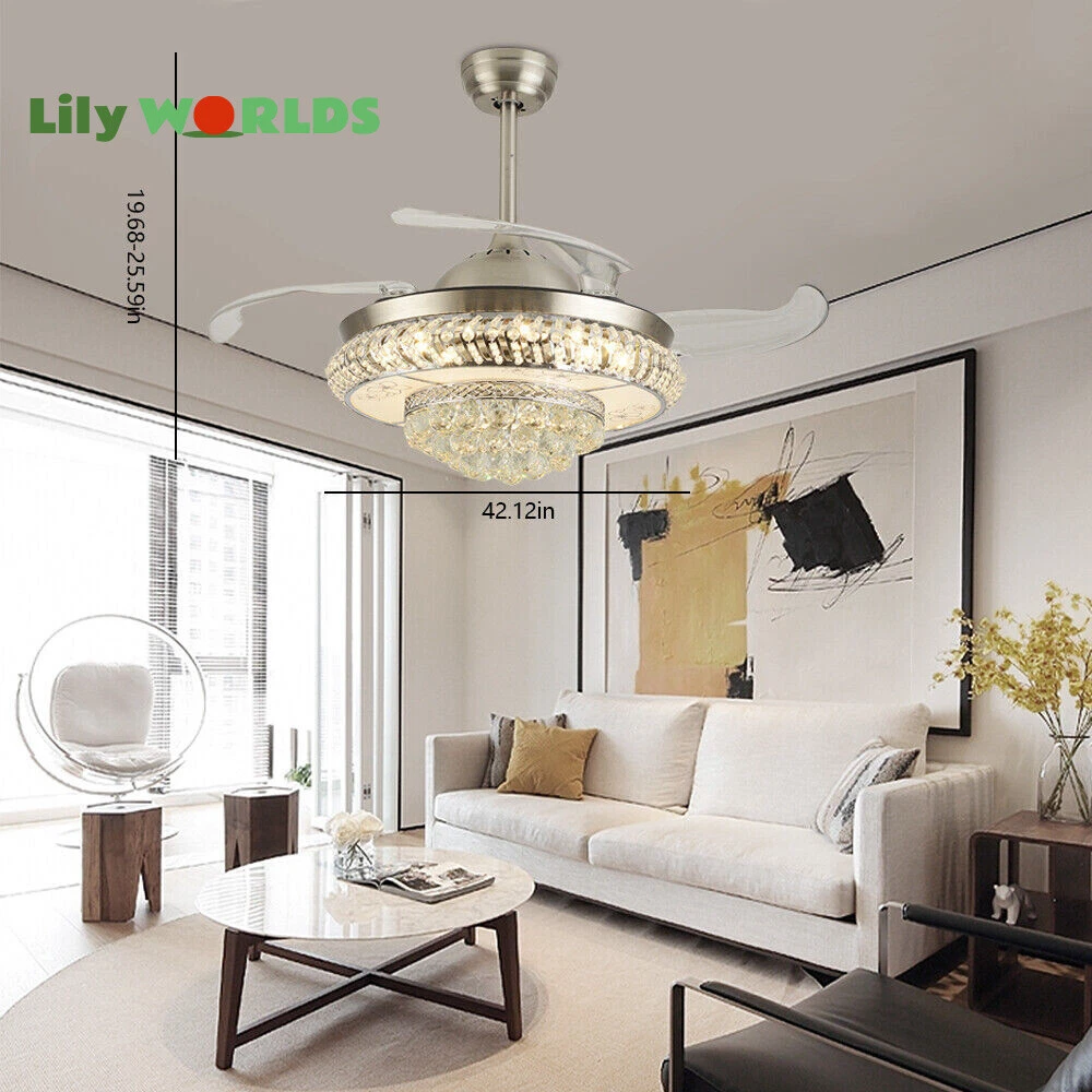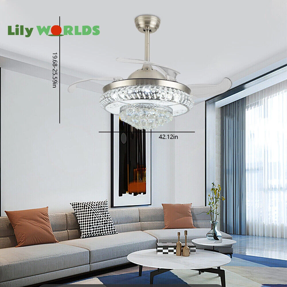 42in LED Crystal Chandelier Invisible Ceiling Fan Light Retractable Blade&Remote Welcome to our store! 42'' Invisible Ceiling Fan Light LED Crystal Chandelier Retractable Blades With RC Description A beautiful house needs a lamp that is very suitable for it. A family needs warm lighting to create an atmosphere at dinner. Light up a lamp, warm the family, you deserve the best. This crystal ceiling fan with light is designed to be elegant and light, and the style is versatile. It has a quiet fan, which allows you to enjoy deep sleep. At the same time comfortable eye protection. Soft light and bright. It is your best choice. Key Highlightss Remote Control: This item is equipped with remote control, so you don't have to stand up to change the three lights, three wind speeds or timer settings at will. This will bring a lot of convenience to your life. Timing Device: This crystal ceiling fan with light can be timed for 1 hour, 3 hours, or 6 hours with a single button. If you often forget to turn off the power, you don't have to worry about wasting electricity with this product. Great Durability: The entire light is made of copper, ABS Blade, and K9 Crystal. Under normal use, the product has a lifespan of 5-10 years or longer. Compared with ordinary lights, this crystal ceiling fan with light is more durable and you can buy it without comprehension. Wide Range: The item's lights and fans can serve an area of ten to twenty square meters. So even if your room is as big as 20 square meters, you don't have to worry about the lights being too dim or not blowing the wind. Crystal Design: You will be stunning when the lights are on, which will give your room a sense of luxury. Adjustable Total Height: The length of this crystal ceiling fan with light is 15 inches (38 cm) / 21 inches (53 cm). You can choose the right length of the pole according to your needs. Diverse Functions : With ABS blades, this crystal ceiling fan with light can be used as an electric fan and also for lighting. It can be multi-purpose and has superb cost performance. High-quality Service : We also provide you with high-quality pre-sales and after-sales services for free. If you have any problem with using it, please feel free to contact us and we will try our best to help you. Specfications 4 Retractable Acrylic Ceiling Fan Blades: This item contains 4 retractable acrylic ceiling fan blades, a material with crystal-like transparency, high surface hardness, and surface gloss. In addition, it will automatically retract and fit into the room when closed, which is a great home decoration. Fans and lights in One : This design is a great space saver while Highlightsing a sense of sophistication. ABS Blades: This material Highlightss high strength and the ABS fluid resistance is low, which makes it a low energy consumption. It is beautiful, thin, light, and durable to use. Applications This crystal ceiling fan with light is ideal for the living room, dining room, foyer, cottage, bedroom, dining room, study, and other places as a decorative lighting fixture. Specfication Light: 3 Colors (neutral white72W, warm white36W, pure white36W) Wind Speed: 3 Wind Speed (high / medium / low) Voltage: 110V Style: Modern/Luxury Switching Power Supply: Remote Control Material: Metal + ABS Blade + K9 Crystal Product Type: Crystal LED Invisible Fan Light Light Source: LED Color: Chrome Silver Switch: Remote Control Motor Material: Copper Number of Blades: 4 Diameter:42inch /107cm(blades unfolded) Long Downrod Length: 9.8" (25 cm) Short Downrod Length: 3.9" (10 cm) Total Height: 19.6" (50cm)/ 25.5" (65cm) Illuminated area: 10-25㎡/107.64-269.1ft² Installation 1. Fixed the bracket on the ceiling. 2. Install the lamp holder, and follow the correct wiring steps. (Tips: Make Sure to Cut Off the Power Supply). 3. Fixed the lamp plate on the bracket. 4. Hang the hollow metal lampshade on the lamp plate. Package Included 1* Ceiling Fan with Light 1* Remote 1* English Manual All Accessories for Assembly Notes 1. Always turn off the power before installing, servicing, repairing. 2. Be sure to securely tighten the wiring studs to prevent loosening or leakage. 3. To avoid the danger of heights, choosing a solid installation surface will be better. 4. The boom has two lengths for choosing, depending on your actual situation. 5. Floor height is greater than 102 inches, ceiling load is greater than 30kg. 6. This chandelier requires a basic simple installation (highly recommended by professional electricians). If you have any questions, please contact us. We are happy to serve you. 7. Please allow slight color difference due to shooting light, and 1-3mm error due to manual measurement, please make sure you don't mind before ordering. Dear Customer, Thank you very much for your orders. I'mpleased that you entrusted us as your supplier foryour project and am grateful that you continue toput your faith in our services. I hope our productsmet your expectations. As always, we are happy to support you with anyfuture projects you may undertake. I wish you thebest with your current project and look forward toseeing the outcome. Thank you again, and I lookforward to working with you in the future . Best regards. Payment Delivery details Terms of sales About us Contact us Payment We accept ebay payment 。 Fees such as import duties, taxes are not included in the item price or shipping costs. These charges are the buyer's responsibility. Delivery details Shipping: 2-9 working days to: USA Terms of sales We maintain high standards of excellence and strive for hundred percent customer satisfaction. Feedback is very important to us. We hope that you contact us immediately before you give neutral or negative feedback, so that we can address your concerns. It is impossible to address issues if we do not know about them! About us Your satis faction is our ultimate goal. We work hard to earn your trust and future business. Our certified technicians have tested each item before shipp