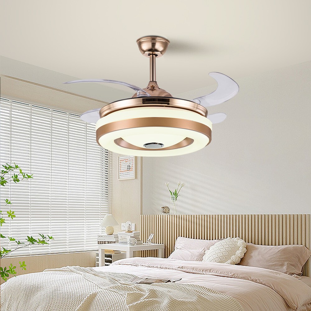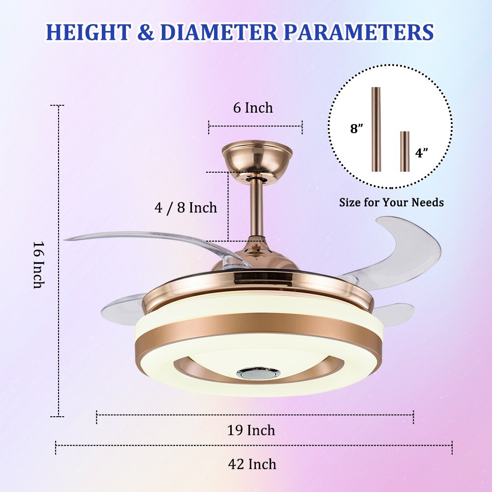 42"Retractable Ceiling Fan Light Bluetooth Speaker RGB Color Changing Chandelier Singing Ceiling's Fan Lights: New Design Multi-Functional Ceiling Fan Lights, With Bluetooth audio function, Mobile Smart Remote Control (Need to Download Smart APP). Function: Bluetooth: Connect Bluetooth to play any music you want. Smart App : Download Smart APP, the you could use the mobile device to change the atmosphere light color.(7-colors change) Remote control: To control normal light color(White light,neutral light and warm white light).Change fan speed(L-M-H). Color:Gold Material: Metal+ABS+Acrylic Blade expansion diameter is: 108CM/42inch Source: LED Light(Included) Voltage: 110V-120V Superior features: no radiation, no flicker, no glare, no dark areas, green, low emissions, 50000h life, low power consumption. Control Mode: Wall Control / Remote Control / Wireless Bluetooth(Don't come with wall control) Applicable: living room, bedroom, restaurant, etc. Suggest: Ceiling weighing ≥50KG Floor height ≥3m Packaging details 1 * Multifunctional color fan light Introduction: ▲ High-Transmittance Acrylic Lampshade: The Lampshade Adopts High-Quality Acrylic, Uniform Thickness, Strong Light Transmission, No Glare Transmission Rate of more than 92% ▲ Bluetooth Stereo: Built-in Bluetooth stereo, mobile phone just need to download APP to control music, atmosphere, lanterns, etc., subtle exchange of music. ▲ Plating Hardware Suckers / Suspensions: Thick metal materials, Bright Color, Strong, Durable, Good Bearing Capacity, Anti - Corrosion Rust, Durable. Inverted mute silicon Steel motor, Fast heat dissipation, long life. ▲ High - Quality ABS Blades: The blades are made of high-quality ABS Material, which has good toughness, Light Weight, Greater Wind power and Beautiful Lines. High-Quality Metal Shell, Frequency Conversion Mute Steel Sheet Copper Motor, Fast Heat Dissipation, Long Life. Built-In Bluetooth Audio, Mobile Phone Just Need to Download The APP to Control the Music, Atmosphere, Lanterns, and so on.