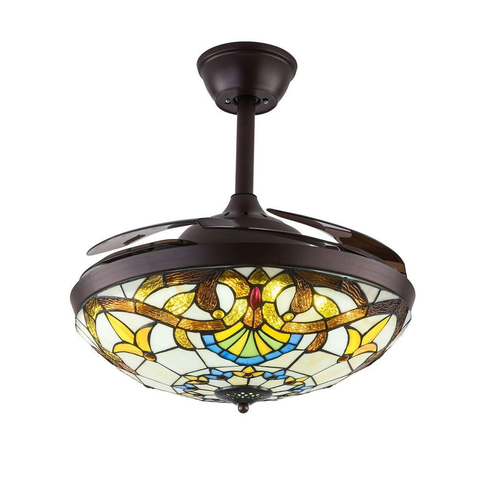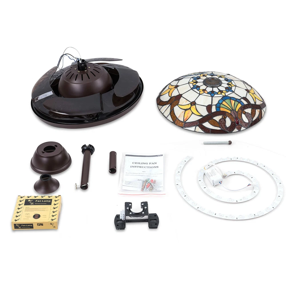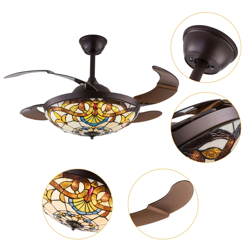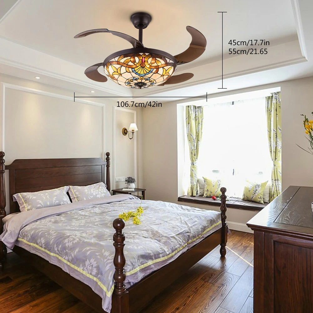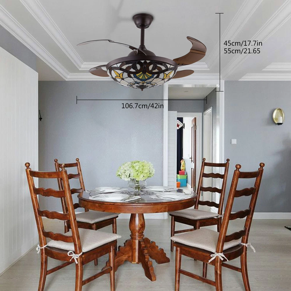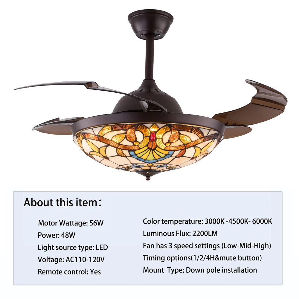 Fan Chandeliers Details Color temperature: CCT Dimmable (3 light cycles) Light source type: LED(Light Kit Included) Control: Remote Control Included, Dimensions: 42 Inch, 4 Retractable Blades Light Wattage: 36W Motor Wattage: 56W Speed: 3 Voltage: AC 110 -120 Volts 42"Tiffany Style Chandelier Retractable Ceiling Fan Remote Control Light Fixture 42'' Tiffany Silent Ceiling Fan Light LED Chandelier CCT Pendant Lamp Product description Features *Invisible fan chandelier: Fan and chandelier combined into one with remote control, automatic telescopic fan blade, LED lamp beads *Ceiling fan with remote: LED lights have 3 color changes (White-Warm-Yellow), Fan has 3 speed settings (Low-Mid-High). All these functions can be easily controlled by remote *Fan Light Chandelier: 42 inches when the fan is extended, and 19 inches when the fan blade is retracted. Includes two lower bars, one for4.87 inches and the other for 9.8 inches, you can choose one to install *Bedroom Ceiling Fans Material: metal body + acrylic lamp cover + ABS retractable blades + pure copper motor(providing powerful air flow, quiet and durable. With vents, it can reduce the internal temperature of the main unit and extend the life of the motor.) *Ceiling Fan with LED Light: Replaceable LED light will last a longtime and save you the most on your energy bills. *Ceiling Fan with Remote Control: Control the light and fan speed separately for ease and convenience. *The colored lampshade is made of pure hand-sprayed oil , it may has slight chromatic aberration and color unevenness on different fan. Fan Chandeliers Details Color temperature : CCT (3 light cycles) Light source type: LED(Light Kit Included) Control: Remote Control Included Dimensions: 42 Inch, 4 Retractable Blades Light Wattage: 36W Motor Wattage: 56W Speed: 3 Voltage: AC 110 -120 Volts Installation Instructions: Ceiling Chandelier Suitable for Flat Roof Concrete Ceiling House, for Gypsum Board and Wood Ceiling, You Need to Buy a Remodeling Bracket; Identify and Connect Electrical Wires; Ceiling height is greater than 110", Lift 110 Pounds. What you get: Retractable ceiling fan x 1 Screws sets x 1 Down rods x 2 (12CM & 25CM) Remote control x 1 Instruction Manual x 1 Payment Delivery details Terms of sales About us Contact us Payment We accept ebay payment 。 Fees such as import duties, taxes are not included in the item price or shipping costs. These charges are the buyer's responsibility. Delivery details Shipping: 2-9 working days to: USA Terms of sales We maintain high standards of excellence and strive for hundred percent customer satisfaction. Feedback is very important to us. We hope that you contact us immediately before you give neutral or negative feedback, so that we can address your concerns. It is impossible to address issues if we do not know about them! About us Your satis faction is our ultimate goal. We work hard to earn your trust and future business. Our certified technicians have tested each item before shipping. The unit comes with 1 year limited warranty on all manufacturing defects. a) If you receive a defective item, you may return it or ask for a discount. Please contact us within 14 days after you receive the package. b) What you returned must be intact and in its original packaging as re? u. Customer is responsible for shipping costs of the returned item. c) We will cover the cost of shipping back t with the shipping rate indicated in the registration page. We will send you a new unit or refund the full payment you paid. Thank you. Contact us Business Hour Business Hour: Monday To Friday: 8:30 AM to 5:00 PM (Beijing China time) Due to time zones, our reply to your questions may not be immediately. But within above working time, we will reply your email within 24 hours. If it's non-workdays, please kindly be patient and wait till Monday. Please contact us with ebay message. Please feel free to contact us if you have any questions. Monday To Friday: 8:30 AM to 5:00 PM (Beijing China time) Due to time zones, our reply to your questions may not be immediately. But within above working time, we will reply your email within 24 hours. If it's non-workdays, please kindly be patient and wait till Monday. Please contact us with ebay message. Please feel free to contact us if you have any questions.