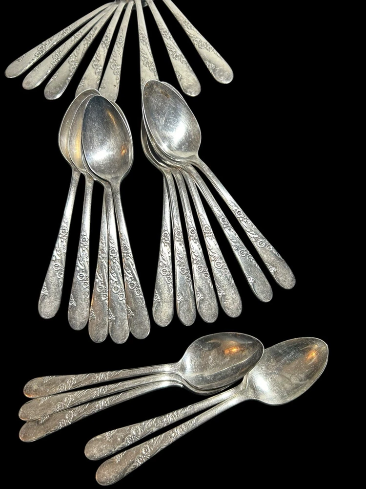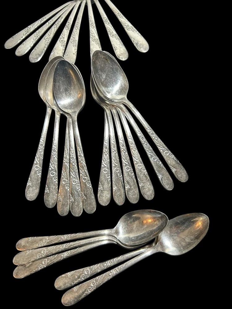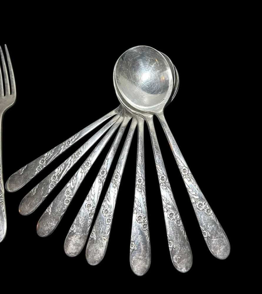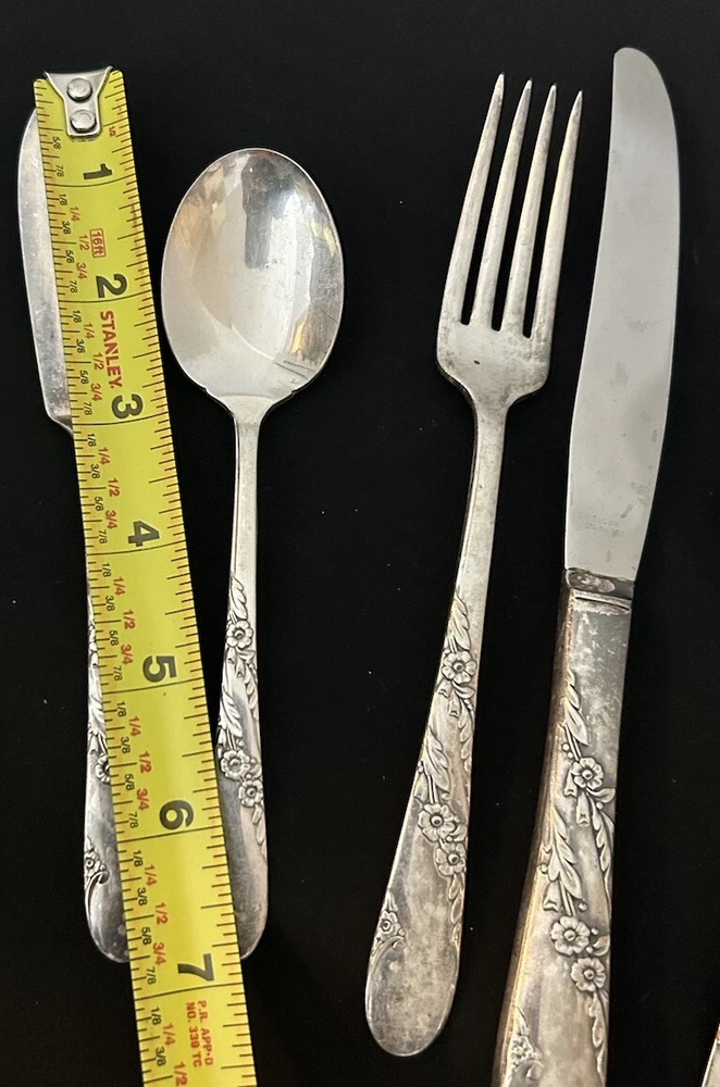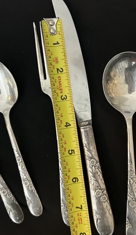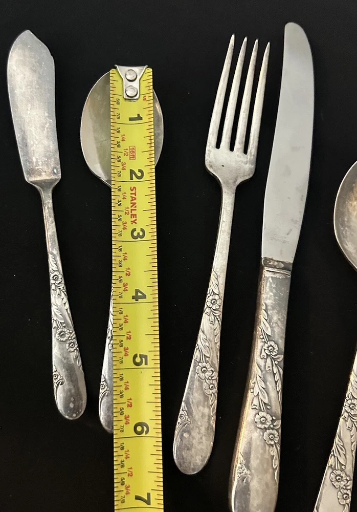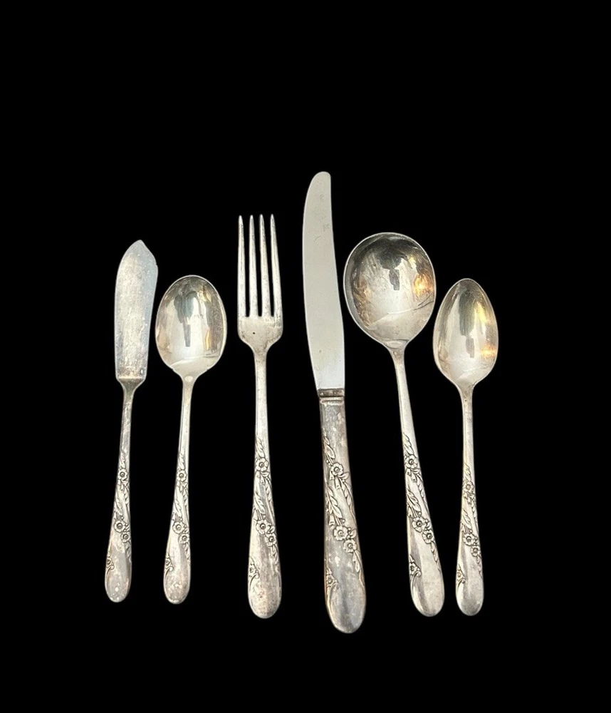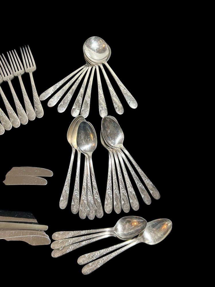 42pc Oneida Community Bridal Wreath Tudor Plate Silverplate Flatware 1950s 8 Dinner Forks 8 Dinner Knives 8 Dinner Gumbo Spoons 16 Dessert Spoons Teaspoons 1 Butter Knife 1 Sugar spoon Good vintage condition. Normal signs of wear and aging. Minor scratches, patina throughout and some minor discolorations. Please study pictures carefully before purchasing Feel free to ask us any questions. Thank you for visiting our store! Bag77A