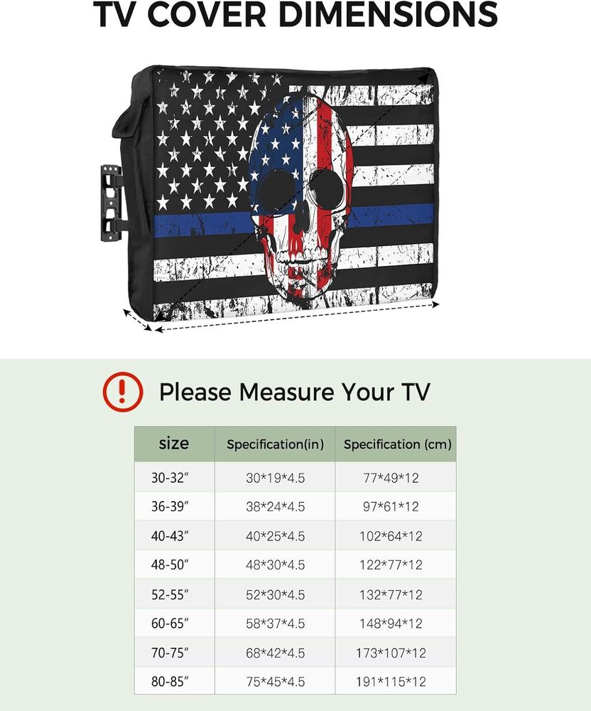 Store New Arrivals Add to Favorite View Feedback Contact 4Th of July Outdoor TV Cover 43 Inch American Flag Patriotic Skull TV Enclosure Independence Day Black White Red Stripe TV Covers for outside TV Display Screen Protector with Remote Control Pocket Description Item model number LPP-230918-SLXM07533YTRCBBS Part Number LPP-230918-SLXM07533YTRCBBS Batteries Required? No Finish Matte Item Package Quantity 1 Color American flag3364 Product Dimensions 40 x 25 x 4.5 inches Material Oxford cloth Thickness 4.5 Inches Item Weight 1.21 pounds Batteries Included? No Special Features Scratch Resistant Size 40"-43" Waterproof & Weatherproof - The outdoor TV cover is made of premium Oxford 600D fabric and coated with PVC on the inside. Protect your TV screen from dust, rain, snow, wind, damp, and even sunlight and other harsh elements. TV Cover Size - Measure 40"x25"x4.5" fit for most 40" - 43." TVs. TV protectors work with practically most TV mounts/ceiling and stand. Equip with a remote control pocket help to store your remote control. Easy to install - You won't need any special skills to install this TV screen protector around the mount on the wall or on the ceiling. The TV cover outdoor slides easily to any television and mount. Protection for Longer TV Life - Your outside TV can suffer in various ways from moisture, erosion, and dust, and an outdoor waterproof TV enclosure is the solution. A great durable weatherproof TV cover / weatherproof TV box for your TV. Easy Care - The TV display protectors are machine washable, the vibrant pattern stay the same after every wash. Tumble dry low, do not bleach. A Great Weatherproof Tv Cover / Weatherproof Tv Box for Your TV Product Description Material: Durable Oxford 600D fabric & PVC coated interior Size Dimensions: 30"x19"x4.5" fit for 30" - 32" TV Screen 38"x24"x4.5" fit for 36" - 39" TV Screen 40"x25"x4.5" fit for 40" - 43." TV Screen 48"x30"x4.5" fit for 48" - 50" TV Screen 52"x30"x4.5" fit for 52" - 55" TV Screen 58"x37"x4.5" fit for 60" - 65" TV Screen 68"x42"x4.5" fit for 70" - 75" TV Screen 75"x45"x4.5" fit for 80" - 85" TV Screen Exquisite Workmanship The outdoor tv cover with nice edges, very smooth, and the seam edges are sturdy and firm to keep its shape. This cover is designed with thick and durable material, which makes it dust-proof,water-proof, weatherproof, anti-UV and resistant to wear. Portable Pocket Storage Design This tv covers outdoor features pockets on the left and right sides, the perfect space for remote controls and storage for other items! When you're ready to turn off the TV and go indoors, remember to store the remote in the case pocket. Vibrant Pattern & Perfect Gift Our TV display protectors come in a variety of vibrant colors and patterns for each season and occasion. A thoughtful home gift for mother, wife and friends. Give your space a real personality, the perfect gift for various holidays. Special Note Both machine and hand washable with gentle cycle and lay flat to dry, no bleach, iron on low heat if required. Please measure your tv screen size prior to purchasing to ensure the best fit. ABOUT US We offer the best prices around on high quality products. Our E-store includes media such as books, movies, music and games while offering electronics, toys, sporting apparel, clothing, tools, general home, garden items and more. SHIPPING We are always working hard to ensure your package arrives as soon as possible. Please understand that some factors like weather, high postal traffic, and the performance of shipping companies are outside of our control. We offer free shipping to the lower 48 states and ship within 2 business days of payment, usually sooner. We do not accept P.O. Boxes. Please provide a physical address. For shipping outside of the continental USA, we only use eBay's Global Shipping Program.The item is shipped to KY and then sent to the rest of the world. International customers are responsible for all duties and taxes. Continue to check out in order to calculate costs for shipping the item to your country. Messages regarding eBay's Global Shipping Program MUST be directed at eBay EXCLUSIVELY. RETURNS We offer a 30-Day Return Policy on items which you are not completely satisfied with. You have the option for a full-refund or an exchange of the item. No returns are available on items shipped outside of the USA. PAYMENT We accept PayPal. CONTACT US This page content is yet to come Please ad us to your favorite seller and visit again later Thank You CUSTOMER SATISFACTION We try our very best to make sure every customer is completely satisfied. If there's a problem, message us! We're happy to help. WE ACCEPT Copyright © 2021 AutoDS. | All Rights Reserved
