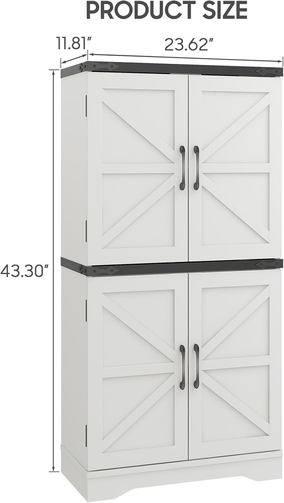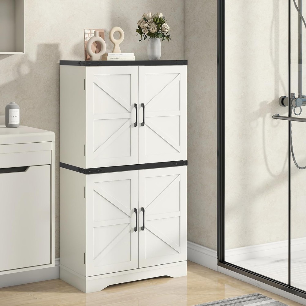 43" Tall Farmhouse Kitchen Pantry, Floor Storage Cabinet with Adjustable Shelves, Farmhouse Storage Cabinet for Bathroom, Kitchen, Living Room, Rustic Style Cabinet product Description Farmhouse Kitchen Pantry Enhance your home with our versatile farmhouse-style storage cabinet, ideal for kitchen and general storage. This charming piece features a two-tier design with classic white cabinets. The top panel, available in rich brown or sleek black, is accented by decorative corner irons. Inside, adjustable shelves offer customizable storage. Crafted from durable materials, this cabinet combines rustic elegance with practical functionality, making it a stylish and reliable addition to any room. Feature Metal Handle Adjustable Shelves Sturdy Base Thickened Top Board What materials is the cabinet made from? Yes, the wooden shelves inside both the upper and lower cabinets are adjustable, allowing you to customize the storage space to fit items of various sizes. Is the cabinet suitable for use in a bathroom? Yes, the cabinet's versatile design makes it perfect for use in bathrooms, kitchens, or any other room where you need additional storage. Its farmhouse style adds a rustic charm to any space. Is the cabinet difficult to assemble? No, the cabinet comes with detailed instructions and all necessary hardware for easy assembly. Most users can assemble it in under an hour with basic tools.
