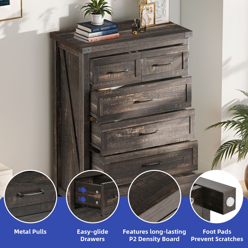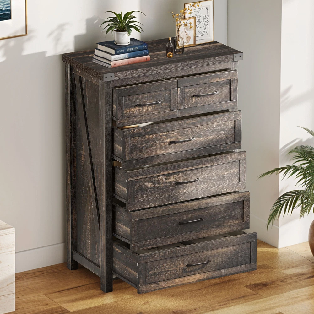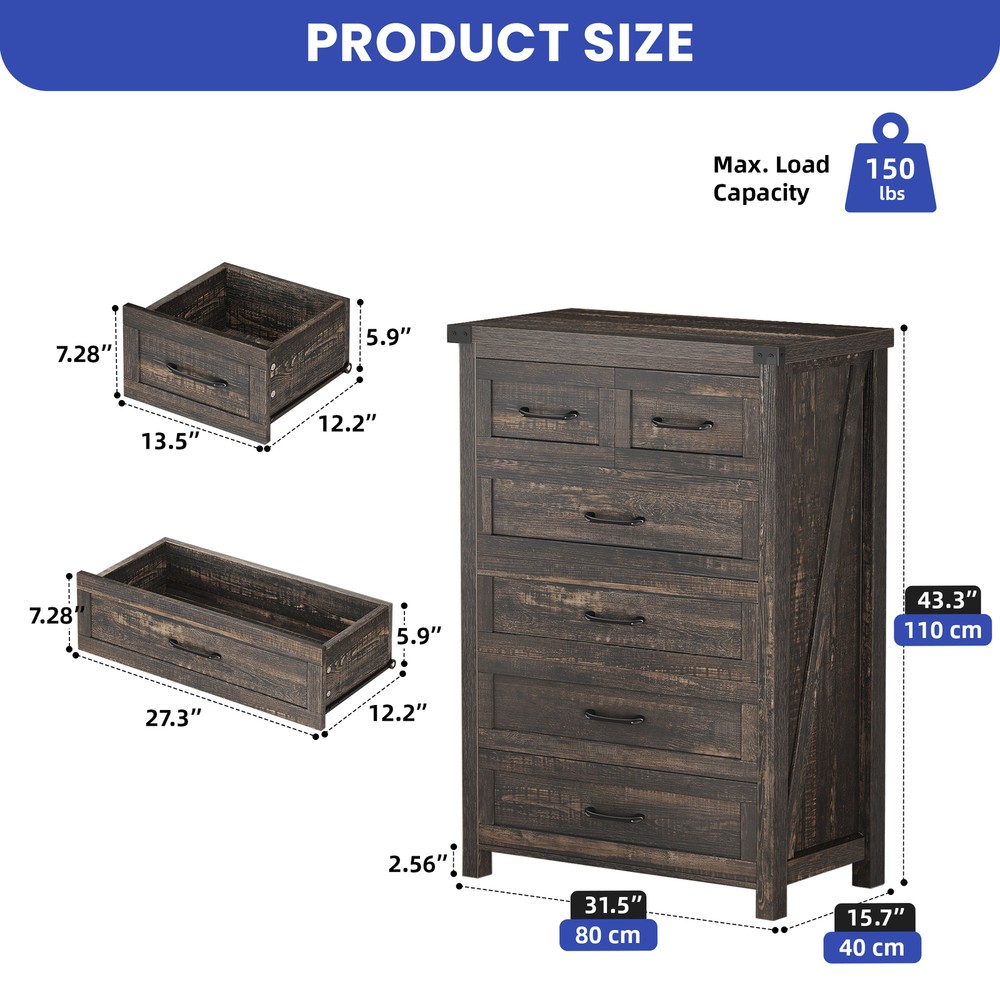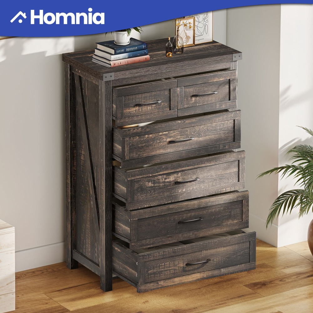 43" Tall Wood Chest of Drawer Modern Tall Dresser 6 Drawers Storage Cabinet Organizer For Bedroom, Living Room, Home Office, Rustic Oak Product Description NOTE: Professional Installation would be Highly Recommended. Description: 1. Color: Rustic Oak 2. Material: P2 grade particle board + Melamine 3. Handle Material: Iron, Metal, Steel 4. Number of Shelves: 6 (4 Large & 2 Small Compartments) 5. Room Placement Recomendation: Entryway, Kitchen, Living Room, Dining Room, Home Office Features: Versatile 6-Shelf Storage Cabinet: Living, Office, Entry Organizer Achieve clutter-free living with this elegant 6-shelf storage cabinet. Designed for versatility, it's ideal for organizing various items in your living room, office, or entryway, adding a touch of sophistication while keeping everything in its place Robust Wood Dresser: Thick Top & Floor-Safe, Smooth Drawers Invest in lasting quality with this heavy-duty wood dresser, meticulously crafted from premium materials. Its thick, scratch-resistant top and smooth metal drawer pulls ensure both durability and a touch of elegance, while floor-protecting features add to its long-term value and convenience. Seamless Drawers: Modern, Floor-Friendly Upgrade your furniture with drawers that offer truly effortless access due to their premium smooth-glide rail system. The sleek black metal handles enhance the modern design, and the included anti-scratch foot pads provide valuable floor protection Rustic Industrial Cabinet Embrace a stylish storage solution that blends rustic warmth with sleek industrial design. This cabinet offers silent-glide drawers for quiet functionality and is accented with robust black metal for a touch of refined boldness Stylish Versatile Cabinet: Media Console, Sideboard, Organizer Elevate your organization with this stylish and versatile storage cabinet. Its modern white finish with black accents seamlessly complements various home decors, while its adaptable design functions beautifully as a media console, sideboard, or general organizer, maximizing both space and style. Easy Assembly & Support Assembles in minutes with included tools and clear instructions. Our friendly customer support team is always ready to assist for a stress-free experience Dimensions: 1. Product Dimensions: 31.5"L x 15.7"W x 43.3"H 2. Large Drawer Cabinet Dimensions : 27.3"L x 12.2"W x 7.28"H 3. Small Drawer Cabinet Dimensions: 13.5"L x 12.2"W x 7.28"H 4. Floor-to-Bottom Distance : 2.56 inch 5. Main Drawer Weight Capacity: 30 lb 6. Overall Product Weight: 131 lb. 7. Maximum Weight Capacity: 150 lb. Package Included: 1 x 6-Drawer Dresser 1 x Accessory 1 x Instruction Notes: 1. Assemble according to the instruction manual. 2. After receiving the package, first confirm that all pieces are included as per the instruction manual. 3. Do not tighten screws too hard when assembling. Firmly tighten only after the entire structure has been constructed. Shipping 1. Normally the item will be dipatched within 1 business day if payment is cleared before 12pm PST. 2. Please verify the correct shipping address in your PayPal account before making the payment. We only dispatch the item to the address that is sent to us at the time of checkout. 3. We don't ship to Hawaii, Alaska, Puerto Rico, APO/FPO/PO Boxes. 4. We don't provide local pick-up service. 5. Normally we will use USPS, UPS, FedEx & LTL to dispatch items. Payment 1. We accept PayPal and credit card. 2. We will ship to the confirmed Paypal shipping address that is provided with the payment only. Return 1. 30 days Money Back Guarantee. 2. Please contact our customer service to receive a RMA form first if want to return the item. 3. All returned items MUST in new condition with the original package. Contact If has any problem, please contact us by sending an ebay message. Our customer service will resolve the problem as soon as possible. On May 5, 2025 at 00:47:15 PDT, seller added the following information: On May 5, 2025 at 01:18:28 PDT, seller added the following information: On Jun 16, 2025 at 03:11:05 PDT, seller added the following information: