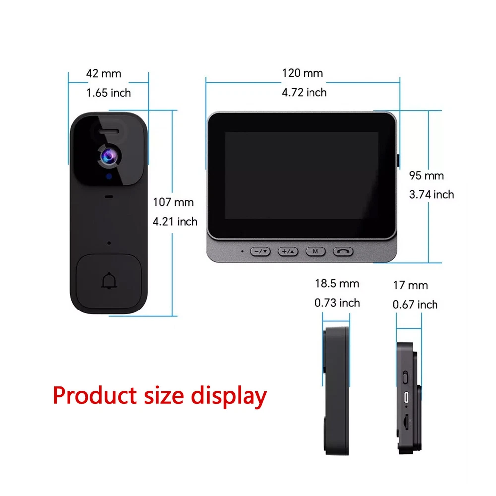 Description Features: *4.3-inch Large Screen: Easily view the situation outside the door with a clear glance, no need to fix it behind the door, allowing freedom of movement. *Long Battery Life: Built-in large-capacity lithium battery, ultra-long battery life. It is recommended to use the screen with power plugged in, and the continuous use time of the screen without power plugging in is: 2H. *High Definition Video: Utilizing 300,000 high-definition pixels, it provides clear and detailed recordings of visitors' faces and items at the door. *Wireless Two-Way Intercom: With a 2.4G wireless signal, the doorbell and display screen can communicate in real-time, eliminating the need for wiring or WiFi. *Easy Installation: The device can be easily installed without the need for drilling holes and supports both and punching installation methods. Specifications: *Product Name:Smart video doorbell *Material:ABS *Size:Doorbell: 107*42mm, Display: 120*95mm *Color:black *Battery capacity: doorbell 800mAh, display 400mAh *Charging method: TYPE-C charging *Power supply voltage: 5V 1A *Display: 4.3 inches Package Content: 1 x Doorbell 1 x Display 1 x Charging cable 1 x Mounting sticker 1 x Screw 1 x Instruction manual Note: 1. The real color of the item may be slightly different from the pictures shown on website caused by many factors such as brightness of your monitor and light brightness. 2. Please allow slight manual measurement deviation for the data. Friendly Tips: 1.Due to the light and screen difference, the item's color maybe slightly different from the pictures. Please understand. 2.Please allow 1-2cm differences because of the manual measurement. Payment 1. We only accept payment through Payoneer. 2. Please make sure you have a valid account prior bidding. 3. Please pay for your item within 7 days after you order. Shipping 1. Buyer take responsibility in import / tax cost (not included in item price) 2. Pls contact with us to confirm extra cost if you need to upgrade the shipping option 3. If there's any concern about shipping, pls contact with us for further confirmation Return Policy 1. Refund or Replacement request is available within 30 days after parcel received and returning the item as the same condition as received. Please contact us to request a return authorization. Your name, auction number, and reason for return should be included in the message. 2. All items returned must contain all original packaging materials. Please repack the item carefully. Items returned will be tested and a new replacement will be shipping to buyer punctually. 3. In the event that a suitable replacement is not available then a refund will be issued. Shipping, handling and insurance fees are non-refundable. 4.If the item was found non-defective, the item will be sent back to buyer at buyer's expense. Items returned without authorization will be refused and returned to sender/buyer. 5. Buyer pay the shipping cost if the item damaged artificially, or buyer say "not like it", "size/color was different per they imaginary", etc. Contact us Please contact us via ebay message any time, all questions will be replied within 12 working hours. Customer Support Online : 9:00am - 22:00pm (GMT +8) Everyday