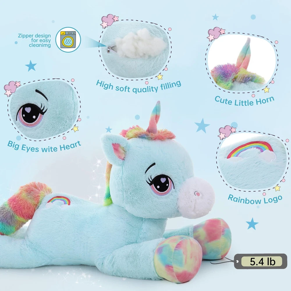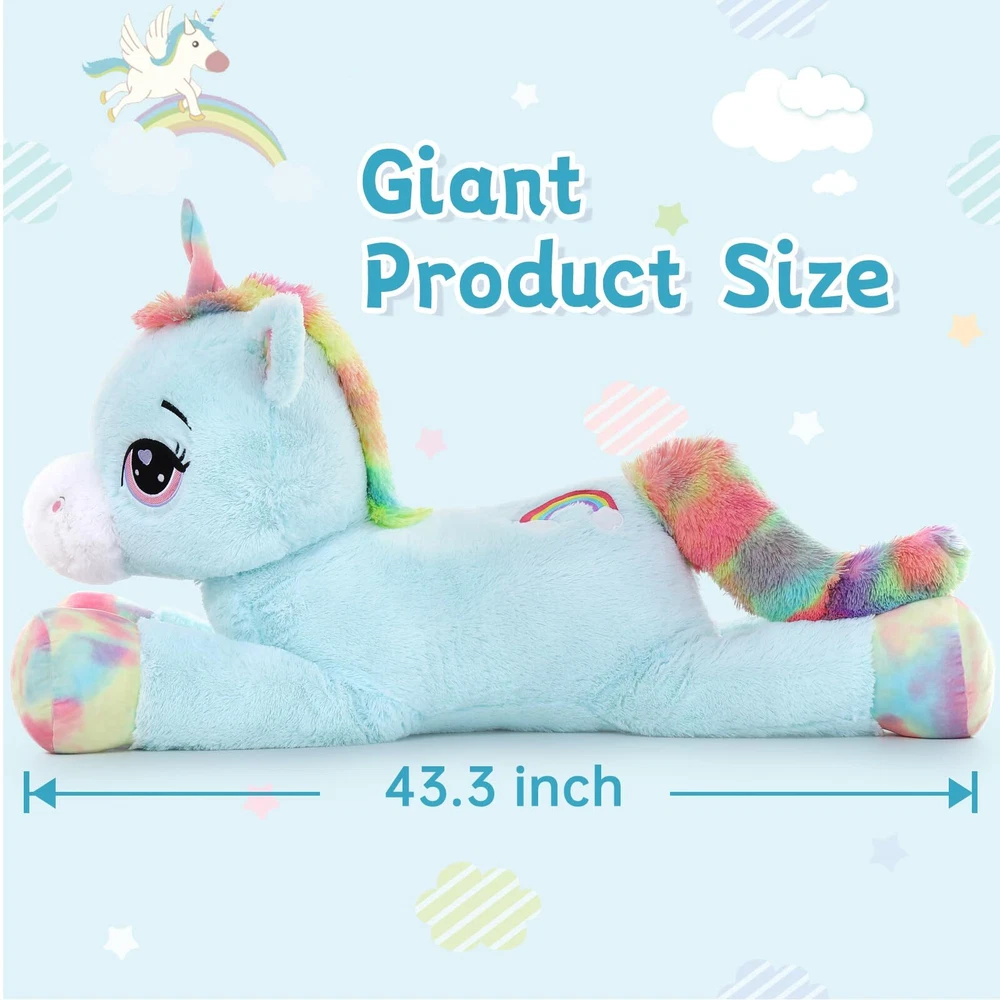 Welcome to , has been committed to creating the most comfortable, softest, and safest plush toy. Whether it's a or an adult, choose Tezituor, choose the best gift for your loved . Large unicorn's message: “Hello, nice to meet you and thank you bring me home. I don't know if I am your most special stuffed animal but you are special to me. I want you to treat me not only as a gift so many on special occasions such as birthdays, Valentine’s Day, Christmas or just as an unexpected gift for cheering a loved , but also to be your loyal friends, whether you are sad or happy, I can accompany you. I love you." Big unicorn identity registration: Type: Plush blue unicorn from the Tezituor family. Color: Blue Size: 43inch Material: Smooth plush fabric, PP cotton. Safety is our top concern Lock-washer eyes are beads that are secured by a facet from the inside, so the eyes cannot be chewed or picked off easily from young children, which ensures safety and durability. It is safe enough as there are no small parts to detach. More functions! This adorable stuffed animal is the best choice for decorating your house or playroom. And is a great gift for any occasion, such as Thanksgiving Day, Valentine's Day, Christmas, Birthday, or any anniversaries. Our large stuffed unicorn is always ready for naptime, playtime, and any time in between. Large Size Unicorn: Our blue unicorn stuffed animal has a total length of 43.3 inches. The interior of the unicorn plush pillow is filled with 5.4 pounds of cotton, and its heavy weight meets the expectations of a hug, giving you the warmest hug. Soft Friendly Material: Our cute stuffed unicorn plush toy with super soft fabric is made of plush and PP cotton, the material is very soft. The belly of the unicorn plush pillow comes with a zipper for easy cleaning. Perfect Gift for Unicorn Lovers: The giant unicorn plush pillow is a great gift idea for children's birthdays, Valentine's Day, Christmas, Thanksgiving, Easter. It can also be used to decorate your party, house, sofa.You can also put her in bedroom or playroom as unicorn theme decoration. Home Decoration: The cute giant unicorn stuffed animals not only a toy for children but also a very good pillow. When you are resting, sleeping, watching TV, quietly accompany you, very comfortable. It can be placed on the sofa, bed, children's room and so on. Good Service: Compressed packaging. When it is first opened, there may be a lack of filling at the joints, product wizened, and messy fur. Simply tap and adjust the position of the filling, and let it bask in the sun for a while to quickly restore its cute shape. If you have any other questions, feel free to us at any time.