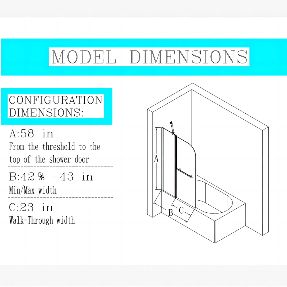 >> 【 Product Specification 】 【 Item Code 】 : P173134 【 Product Name 】 : 43 in. W * 58 in. H Frameless Folding Shower Doors for Bathtub, 1/4" (6mm) Thick SGCC Tempered Glass Door, Bathroom Pivot Tub Glass Door, Matte Black 【 Main Color 】 : Matte Black 【 Main Material 】 : Glass+Metal 【 Glass Details 】 : 1/4" (6mm) Thick SGCC Tempered Glass 【 Frame Details 】 : Thickened upgraded aluminum 【 Product Dimensions Assembled 】 : Length 42.60 '', Width 58 '', Thickness 0.24 '' 【 Item Weight 】 : 53.24 lbs 【 Package Size 】 : 62.01’’ L x 27.56’’ W x 2.76’’ H 【 Package Weight 】 : 62.04 lbs >> 【 Installation measurements 】 From the threshold to the top of the shower door: 58 in Min/Max width: 42 5/8-43 in Walk-Through width: 23 in >> 【 Product Features 】 · BATHTUB SHOWER DOOR DESIGN: 43 inch in width * 58 inch in height bathtub shower door panel, Matte Black finish design. The shower door comes with a sturdy metals profile to fix against the wall which creates a barrier and prevents water from leaking and floor getting wet. The design is simple and practical, does not occupy too much position, and improves the space utilization rate of the bathroom. · FRAMELESS PIVOTING SYSTEM: This shower tub door is installed to the wall , it has a fixed glass and a movable glass, the movable glass panel itself can be opened in 180 Degree, enabling the glass doors can be spin inward or outward and allows a wide range of access without taking up too much space. As well as, this bathtub door can be installed with left side opening or right side opening based on customer's preferenceflexible and comfortable. · SAFETY TEMPERED GLASS: This sliding shower door is made up of the 1/4" (6mm) ANSI-certified tempered glass to holds strong against damage, improve the impact resistance and safety of the glass. This clear tempered glass panel is easy to clean and maintain, there will convenient for Keeping the look clean and tidy. · CLASSIC AND HIGH-QUALITY MATERIALS: The shower door's main structure is made of lightweight and durable aluminum alloy with stunning and sophisticated chrome finish, which offers excellent corrosion and oxidation resistance, ensuring the stability and durability of the shower door without deformation over time. · EASY INSTALLATION: The complete packaging of the shower door includes all necessary components, ensuring a smooth and unobstructed installation process. And the packaging comes with an easy to understand installation guide that covers component preparation and step-by-step installation. --------------------------------------------------- Do Read before You Buy : Refund& Return -Returns are accepted within a certain period. Any problems, please feel free to contact us by ebay message first, let's figure problems out together,your email will be replied within 1 business day. -We provide a free return service, but return shipping costs will be on you in the following circumstances. 1. Changed your mind or do not need/want the item or other personal reasons. 2.Items may slightly differ from photos in terms of color and lighting differences & on different monitor’s display. 3. Manual measurement has been used, there may be some reasonable error range. 4. Choosing the wrong size , type or color causes unfitting problem. Or didn't read specifications and descriptions, causes real item is different with own imagination or expectation. 5. The buyer did not know how to install or use the item 6.Find a better price elsewhere. -Returns for free/free replacement/free parts only happen in the case of product issues/arriving broken/wrong item or missing parts. -For quality issues ,defective photos must be attached to messages/when returning. Shipment Warning : if we ship out the item and the buyer wants to cancel the order or change the address,buyer need to pay possible shipping cost. Please cancel the order or change the address before we ship out. After sales Service -we are responsible for accessories missing. Please contact us first,and attach a photo of what you've received. -we are responsible for all losses caused by product quality issues.Resend or Refund, please also attach defective photos.