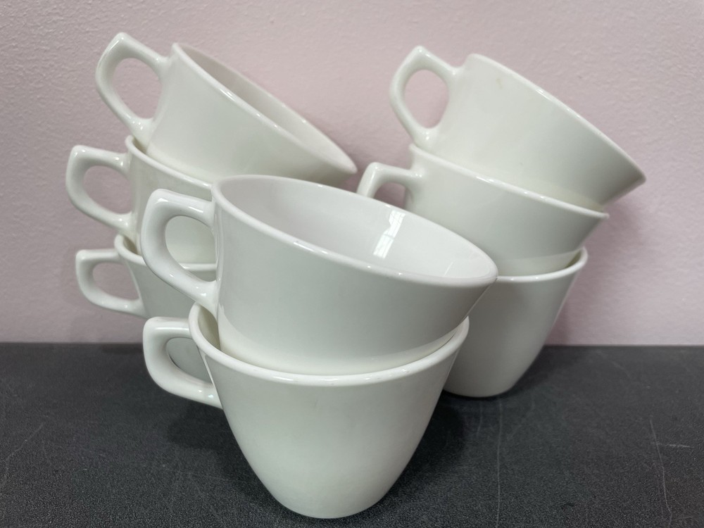 This is for 8 Corning stoneware solid all white cups mugs. They measure 2 3/4" tall, 3 1/2" across the openings, and 4 3/8" across with the handles. Excellent. No chips, cracks, or scratches. Some light stains on the inside of one. 285E