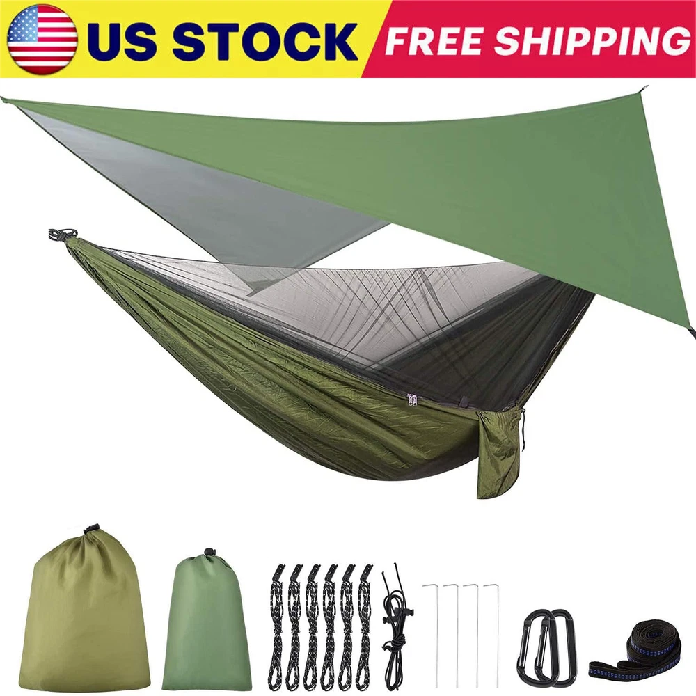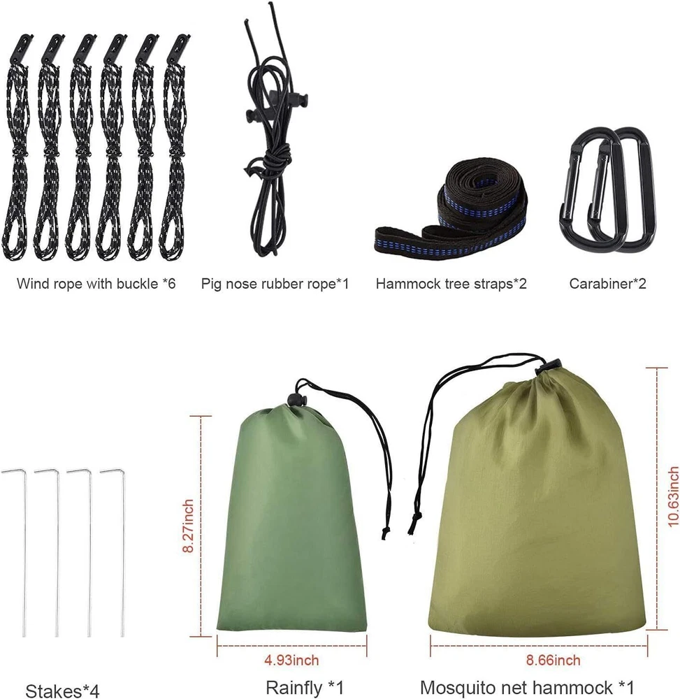 MPN: Does Not Apply Features: Double, Insect Net, Portable, Machine Washable, With Mosquito Net, Air Swing Chair, Foldable, Waterproof gtin13: Does not apply Modified Item: No UPC: Does not apply Type: Camping Hammock Seating Capacity: 2 Tent Tarp Size: 90.5 x 82.7 inch Brand: Unbranded Function: Swing, Anti-mosquito, Place food on the lawn Model: Camping Hammock with Mosquito Net Color: Green Set Includes: Rain Fly Hammock Cover, Hammock With Mosquito Net, Wind rope with buckle, Metal Carabiners, Tree Straps, Stakes, Storage Bag Insect Repellent Treated: No Weight Capacity: Two-person Characteristics: Protect trees Applicable scene: Garden,Lawn,Outdoor,Camping,Hiking,Travel Material: 210T Nylon + Mesh Tree Strap Length: About 102 inch Load bearing: 440 lbs Expand Size: 114 x 55 inch Water Pressure of Rain Fly: 1500MM