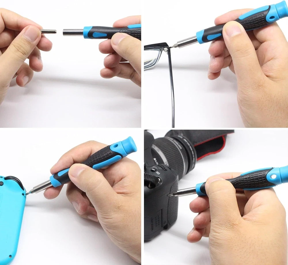 characteristic: It is designed with sockets, screwdriver bits and precision drills of most popular sizes, and is suitable for home, garage, apartment, dormitory, back to school, electronic equipment, glasses and jewelry repair projects. The drill bit and casing are made of High-quality materials, which has durability, extraordinary hardness and excellent toughness and can withstand greater torque. Non- grip and comfortable driver provide users with lasting strength. Three-way ratchet batch handle quickly locks the rotation direction of batch head. This gear is used to tighten the ratchet and center it. This gear is used to manually operate the ratchet to the right. This gear is used to loosen it. All tools are contained in a sturdy transparent cover injection-molded plastic box, which is convenient for storing and identifying tools, keeping tools safe or in the garage, and has good portability. Versatile and reliable, it is very suitable for DIY or professional use. Whether you are engaged maintenance, car maintenance or other projects, this comprehensive package can meet your needs. describe Name: Ratchet screwdriver bit sleeve set Material: Steel+Plastic colour: Blue+Silver Package Contents: 1 x Ratchet screwdriver bit sleeve set Only the above package content, other products are not included. Note: Light reflection and different displays may cause the color of the item in the picture a little different from the real thing. The measurement allowed error is +/- 1-3cm. All tools are contained in a sturdy transparent cover injection-molded plastic box, which is convenient for storing and identifying tools, keeping tools safe or in the garage, and has good portability. The drill bit and casing are made of High-quality materials, which has durability, extraordinary hardness and excellent toughness and can withstand greater torque. Non-slip grip and comfortable driver provide users with lasting strength. Three-way ratchet batch handle quickly locks the rotation direction of batch . This gear is used to tighten the ratchet and center it. This gear is used to manually operate the ratchet to the right. This gear is used to loosen it. characteristic: It is designed with sockets, screwdriver bits and precision drills of most popular sizes, and is suitable for home, garage, apartment, dormitory, back to school, electronic equipment, glasses and jewelry repair projects. Versatile and reliable, it is very suitable for DIY or professional use. Whether you are engaged in home maintenance, car maintenance or other projects, this comprehensive package can meet your needs.