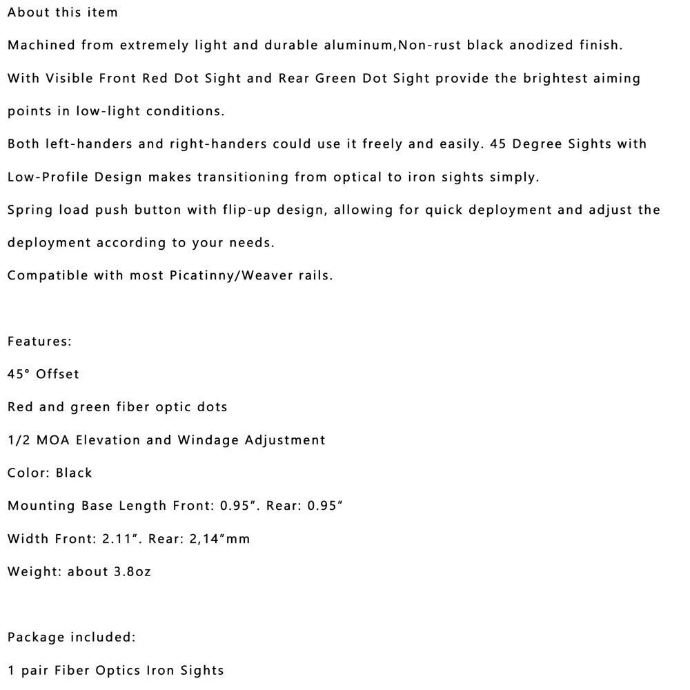 You may also like Folding Flip Up Iron Sight Back Up Sights Set 20MM Front Rear Picatinny Rail 20.85 USD Free shipping .22 to .50 Laser'Calibrator Laser Calibration Pen Red Laser Pointer Bore Sighter 17.85 USD Free shipping Rifle Scope Sunshade Protective Caps Honeycomb Mesh Scope Protector 44/50/56MM 14.85 USD Free shipping 177-12GA multi caliber Bore Sighter Collimator Red Green Laser Bore Sight Kit 26.85 USD Free shipping Tactical Fast Red Dot Riser Mount Fit 20mm Picatinny Rail 24.85 USD Free shipping Tactical Pistol Handgun Scope Mount Weaver Rails For Red Green Dot Laser 15.85 USD Free shipping Tactical Fixed Front Rear Iron Sight Set For DD Rapid Backup Black 21.85 USD Free shipping 1×Low Profile Tactical 45 Degree Offset Angle Mount Picatinny Weaver Rail 12.85 USD Free shipping Telescope Vertical Corrector Tool Set Optic Leveler Combo Mount for Rifle Scope! 14.85 USD Free shipping G17 Pistol Picatinny Rail Red dot Scope Sight Polymer Base Mount For Hunting USA 13.85 USD Free shipping .177 to .50 Caliber precision Laser Calibrator laser zero locator target setter 17.85 USD Free shipping Fiber Optic Front Sight Rear Combat Red Dot Fiber Sight for Standard Glock 14.85 USD Free shipping About this item Machined from extremely light and durable aluminum,Non-rust black anodized finish. With Visible Front Red Dot Sight and Rear Green Dot Sight provide the brightest aiming points in low-light conditions. Both left-handers and right-handers could use it freely and easily. 45 Degree Sights with Low-Profile Design makes transitioning from optical to iron sights simply. Spring load push button with flip-up design, allowing for quick deployment and adjust the deployment according to your needs. Compatible with most Picatinny/Weaver rails. Features: 45° Offset Red and green fiber optic dots 1/2 MOA Elevation and Windage Adjustment Color: Black Mounting Base Length Front: 0.95”. Rear: 0.95” Width Front: 2.11”. Rear: 2,14”mm Weight: about 3.8oz Package included: 1 pair Fiber Optics Iron Sights -About US Founded in 2012, VIPJQ have professional development and sales, and are involved in various products, providing customers with various high-quality products. Since its establishment, VIPJQ has always adhered to the service concept of "customer first" and the management concept of "pursuit of quality", and is committed to providing customers with high-quality original designs. We commit to provide you the best innovative, quality products & professional services with competitive prices. We value every customer, and we look forward to providing solutions for your business needs to help your business achieve its goals, please contact us immediately! We are all about you! We are a Japanese seller,but with large warehouse in USA. We are profesional on Auto Parts,Car Parts,Motorcycle Parts,3C,other hot sale items and so on. We aim to provide to customers high quality product and best service. -About Shipment&Returns The item usually will be dispatched within 3 days after you ordered.All are free shipping. And it usually takes 3-10 working days to delivery depends on buyers' address or other majeure on the way. If you are not satisfied with the items and want to return the item,we hope you could message us first,we will give you the return details, we think we could give you the best service to save your time and money.Thank you. -About Feedback&Customer Service If you are enjoy your shopping here,not only enjoy the items but also the service,we are appreciate you could give us a 5-star feedback. If you are not satisfied with the item,before you give us the negative feedback,we hope we could give you the best solution through our commutication. We think we could do it if you give us the chance.Thank you.