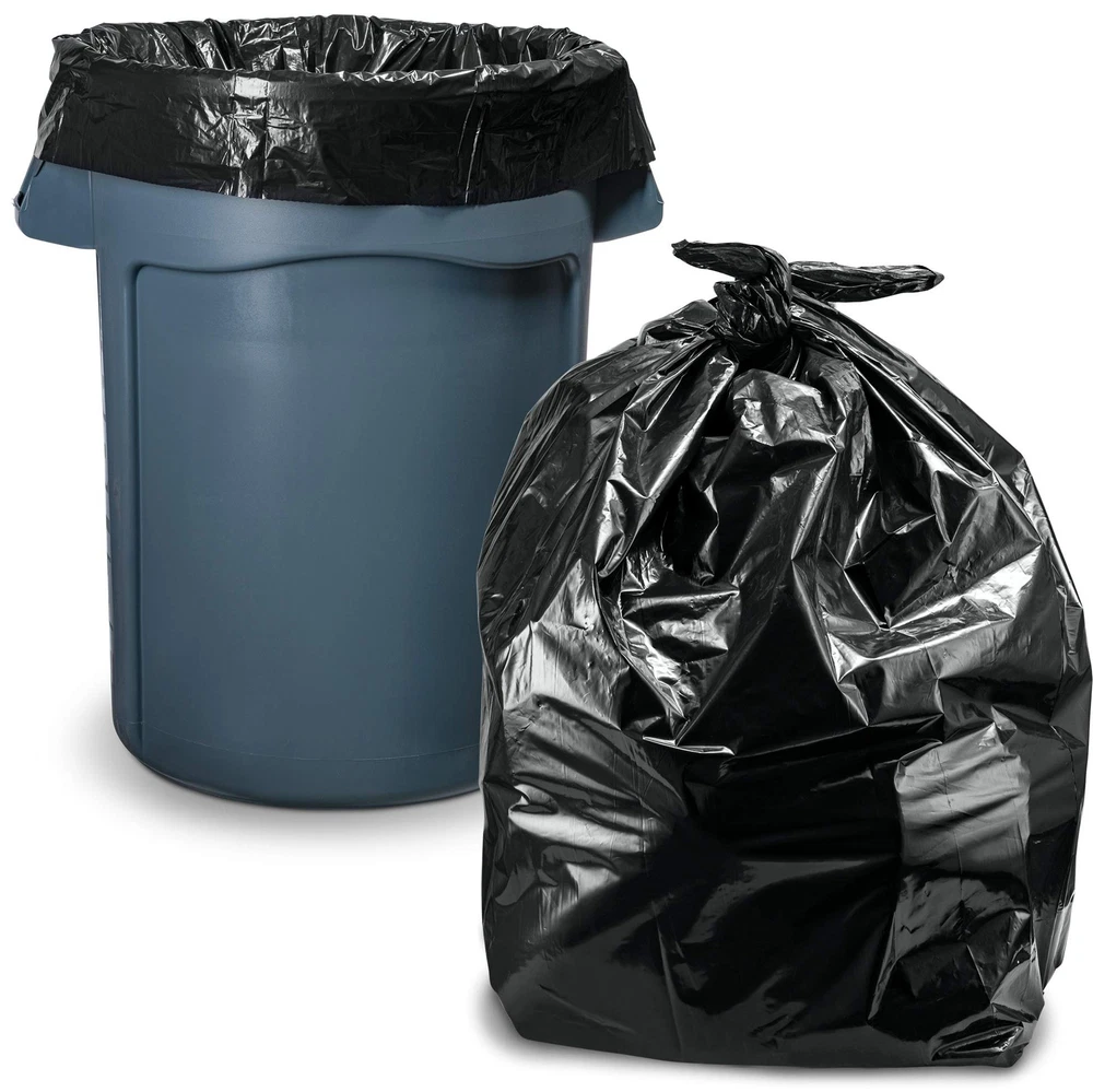These heavy-duty bags are 100% all-American made, and guaranteed to satisfy. Engineered to a durable identical to 1.5 Mil strength thickness of low-density polythene, no job is too big, too bulky or too smelly for these quality black garbage bags. Dimensions Bag size 38"W x 46"H. Precision designed to fit the 40 - 45 gallon commercial trash cans, they are ideal for your kitchen or workshop. You can buy these bags in the confidence that they?ll hold whatever you throw at them: lumber, trimmings, wood, metal, food, ceramics and even sharp glass, all without tearing. This is a great bag for both indoor and outdoor applications, and the folded and reinforced gusset seal adds protection against leaks.Proudly Made In The U.S.A Made in the USA from low-density plastic of the highest quality, they are identical 1.5 mil strength thick, and finished with a gusset seal. They are puncture resistant, flexible, and strong enough for outside use. The equivalent of 1.5 mil strength thickness can hold up to sharp items very well.products offers a on all of their bags and products. Any issues whatsoever is fully backed by our , money back guaranteed! 45 gallon Trash Bags Designed to fit the commercial trash cans. It's a perfect fit. Low-density resins are both strong and flexible, and at this thickness bags can cope with anything from nails to jagged glass or splintered framing. 45 Gallon Large Trash Bags - Fits great on These heavy duty drum liners are puncture resistant, flexible, and strong enough for indoor and outside use. Heavy duty capacity, These heavy duty trash bags are designed to hold more garbage and accommodate large volumes of waste, which means less bags used and fewer trips to the dumpster. Contractor bags perfect for job sites, construction, and yard waste bags. These heavy duty trash bags are designed to hold more garbage and accommodate large volumes of waste, which means less bags used and fewer trips to the dumpster. Contractor bags perfect for job sites, construction, and yard waste bags. black garbage bags size 40"Wx46"H No job is too big, too bulky or too smelly for these quality large black garbage bags.