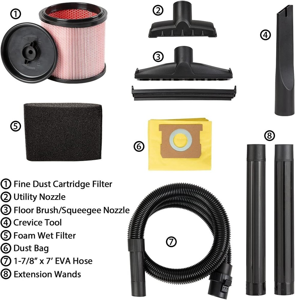 Compact 4.5 Peak HP Wet/Dry Vacuum with On-Board Accessories for All Floors ‹ › ‹ › ‹ › ‹ › ‹ › ‹ › ‹ › ‹ › Compact 4.5 Peak HP Wet/Dry Vacuum Perfect for All Floors Key Features: Powerful Performance: With 4.5 Peak HP, this vacuum delivers exceptional suction power for efficient cleaning. Generous Capacity: Equipped with a 6-gallon* polypropylene tank, designed for both wet and dry messes. Versatile Functionality: Easily converts into a blower, making it ideal for cleaning your workspace or yard. User Actuated Filter Cleaning System: Maintain optimal airflow and suction with a simple filter cleaning process, ensuring uninterrupted cleaning tasks. Organized Storage: On-board storage for hose, cord, and accessories keeps everything orderly and at your fingertips. Included Accessories: (1) 1-7/8-inch x 7-foot EVA Hose (2) Extension Wands (1) Floor Brush/Squeegee Nozzle (1) Utility Nozzle (1) Crevice Tool (1) Dust Bag (1) Fine Dust Cartridge Filter (1) Foam Wet Filter Why Choose Our Wet/Dry Vacuum? Transform your cleaning experience with our Compact 4.5 Peak HP Wet/Dry Vacuum. Designed to tackle the toughest tasks with ease, this powerful vacuum adapts seamlessly from jobsites to household cleaning. Its user-friendly filter cleaning system means you can maintain peak performance without interruptions. The handy organization of accessories ensures you are always prepared. Perfect for a variety of surfaces, it's your ultimate cleaning companion! Elevate your cleaning routine and order your Compact Wet/Dry Vacuum today! Shipping Free & Fast Shipping - We offer free shipping to most of the USA with a normal delivery time of 3-7 days. However, due to the current situation, additional delivery time (up to 3 weeks) may be required for some items. Alternative Carriers - We may use alternative carriers (e.g. USPS, FedEx, UPS, etc.) to ensure your package arrives safely and on time. Due to the use of multiple carriers, we are unable to provide a tracking number automatically. Handling Time - Orders are processed and shipped within 1-2 business days of receiving cleared payment. Shipping Restrictions - Shipping to Alaska, Hawaii, Puerto Rico, Guam, and other US territories may incur shipping charges or delivery restrictions. Please contact us before ordering, or your order can be refunded/cancelled. State Restrictions - There may be restrictions based on your state of purchase. For example, certain items may not be shipped to California due to state regulations. Contact for Tracking Updates - If you require tracking updates or have any concerns about the delivery of your order, please feel free to contact us, and we will be happy to assist you. Return Please see our eBay Return Policy. Thank you. Payment We accept all major credit cards, PayPal, and Apple Pay for your convenience. Your payment information is secure and encrypted to ensure a safe and seamless transaction. Please complete your payment within 3 days of purchase to avoid any delays in shipping. Feedback Your feedback is extremely important to us. We strive to provide the best products and customer service possible. If you are satisfied with your purchase, please take a moment to leave us a positive review. If you have any concerns or issues with your order, please contact us before leaving negative feedback. We are committed to resolving any problems and ensuring your satisfaction. Contact Us If you have any questions or concerns, please feel free to reach out to our customer support team. You can contact us through the eBay messaging system. We are available Monday to Friday, 9:00 am to 5:00 pm EST, and we will do our best to respond to your inquiry within 24 hours. Thank you for supporting our small family business! UPC: Not Set Unit Quantity: 6 gallon Features: Portable,Wet/Dry,On-Board Storage,Compact Design,Powerful Motor Included Accessories: Crevice Tool,Extension Wand,EVA Hose,Floor Brush/Squeegee Nozzle,Utility Nozzle,Dust Bag,Fine Dust Cartridge Filter,Foam Wet Filter,1-7/8-inch x 7-foot EVA Hose,2 Extension Wands,1 Floor Brush/Squeegee Nozzle,1 Utility Nozzle,1 Crevice Tool,1 Dust Bag,1 Fine Dust Cartridge Filter,1 Foam Wet Filter Brand: Unbranded Type: Canister/Cylinder Model: Wet Dry Vacuum Smart Home Protocol: Not Set Runtime: Not Set Smart Home Compatibility: Not Set Charge Time: Not Set MPN: Not Set Color: Black Power: 1320 W Filters: Cartridge Voltage: 120 V Country/Region of Manufacture: Not Set Capacity: 6 gallons Protection Plan: No Coverage Manufacturer Warranty: Not Set Item Weight: 20.1 lb Unit Type: Unit Cord Type: Not Set Bagged/Bagless: Not Set