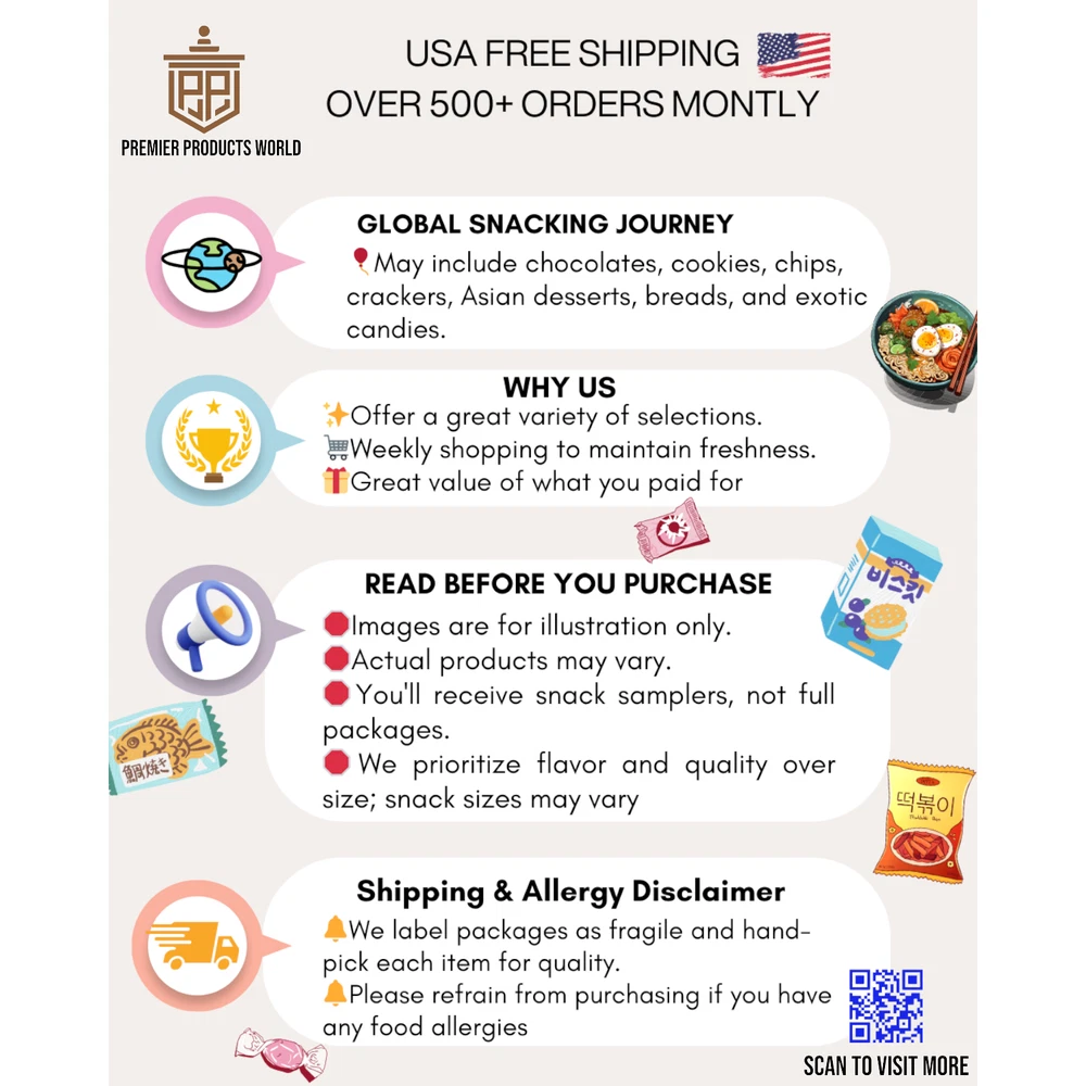 PLEASE READ BEFORE YOU PURCHASE Contains rotates weekly, pic is always for references only We change contains often to bring freshness for our customers! 🧡💛Free shipping across the USA with extra pieces included in every package. Over 3 years of experience selling on other platforms!🧡💛 🎊Explore a World of Snacks🎊 Delightful assortment of Asian treats that may include chocolates, cookies, chips, crackers, traditional Asian desserts, breads, and exotic candies. ✨Why Us? We offer the broadest selection on the platform due to regular trips to Asia. We shop three times a week to maintain freshness, ensuring our snacks rotate quickly. Each bag provides a unique mix for a varied experience, and of course, ALWAYS getting more pieces than what you bought ! 📌Important Details:📌 ❗ Manufacturing Dates: Some products may display manufacturing dates for freshness. ❗ Illustrative Purposes: Images shown are for illustration only. Actual products may vary due to our rotating stock. ❗Variety: Photos are examples of what may be included as some snacks in our rotation may change. ❗Size Variation: Please note that snack sizes vary. While some snacks are small yet premium (like many Japanese snacks), others may be larger. We focus on flavor and quality over size. ❗You will get a mix of sweet & savory snacks/ candies, if you have preference, please contact me! Also please note there will be repeat items. ❗❗You will receive snack samplers individually packed for freshness, not full packages of snacks. Our selection prioritizes flavor and quality over size. If you prefer large, budget-friendly snacks, we suggest exploring alternatives like cotton candy. 🎈🎇🎈🎇Seller's Note🎈🎇🎈🎇 Please respect diverse cultural foods; personal taste varies widely. Let's appreciate cultural diversity and understand that taste is subjective. Please avoid low ratings based solely on personal preference. My goal is to offer affordable opportunities for everyone to explore different cultures and foods. Again, please DO NOT purchase if you have low tolerance of different flavors and having trouble being respect to other cultures. No food is "nasty", people grew up and live with these foods, so please behave like a cultured and educated person, you don't like it doesn't mean it is nasty, other people like it. 🛑Shipping Disclaimer🛑 Please note that while we label all packages as fragile and hand-pick each item for quality, occasional mishandling by shipping carriers may result in damaged or open snacks. If you encounter any issues, please contact your local postal service for assistance. Feel free to reach out to us directly as well, and we'll work to find a solution for you CLICK ME FOR MORE BUNDLES Disclaimer Product packaging, specifications, and prices are subject to change without notice. All information about the products is provided for information purposes only. Please always read labels, warnings, and directions provided with the product before use. Shipping We will ship all orders within 2 business days of payment, we provide free upgrade USPS shipping service up to 2-DAY Priority if Urgent Contact We can be contacted at any time through eBay messages if you have any questions, comments or product requests. We will respond to you within 24 hours and do our best to help you out! Further details CONTAINS MILK, SOY, WHEAT, CASHEW. MAY CONTAIN TRACES OF EGG, PEANUT, ALMOND. PLEASE DO NOT PURCHASE IF YOU HAVE ANY FOOD ALLERGY