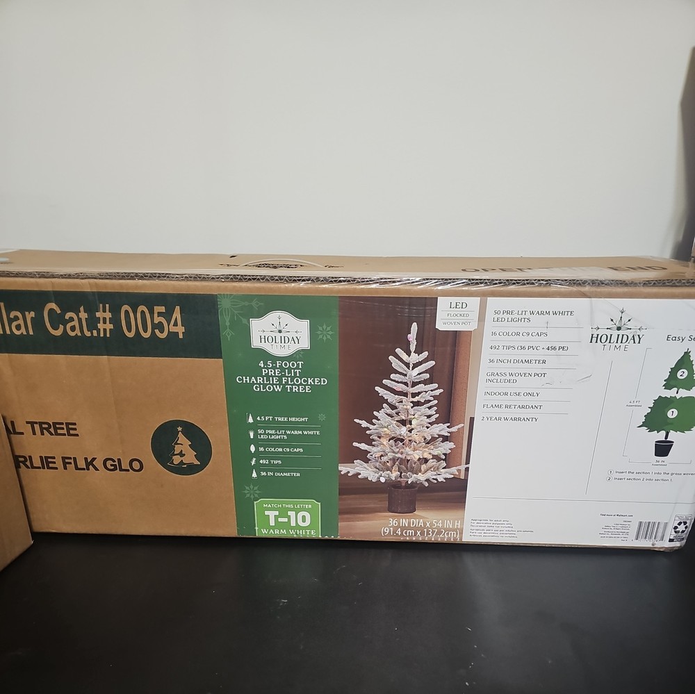 The 4.5 foot Artificial Christmas Tree Pre-lit Charlie Flocked Glow Tree that includes a Christmas tree,. This modern style tree features a green and white color scheme, with realistic winter forest features. It is designed for indoor use and requires assembly. The tree weighs 11.3 lbs and is from the brand Holiday Time, known for its quality holiday decor. Perfect for adding a festive touch to your home during the Christmas season. T10
