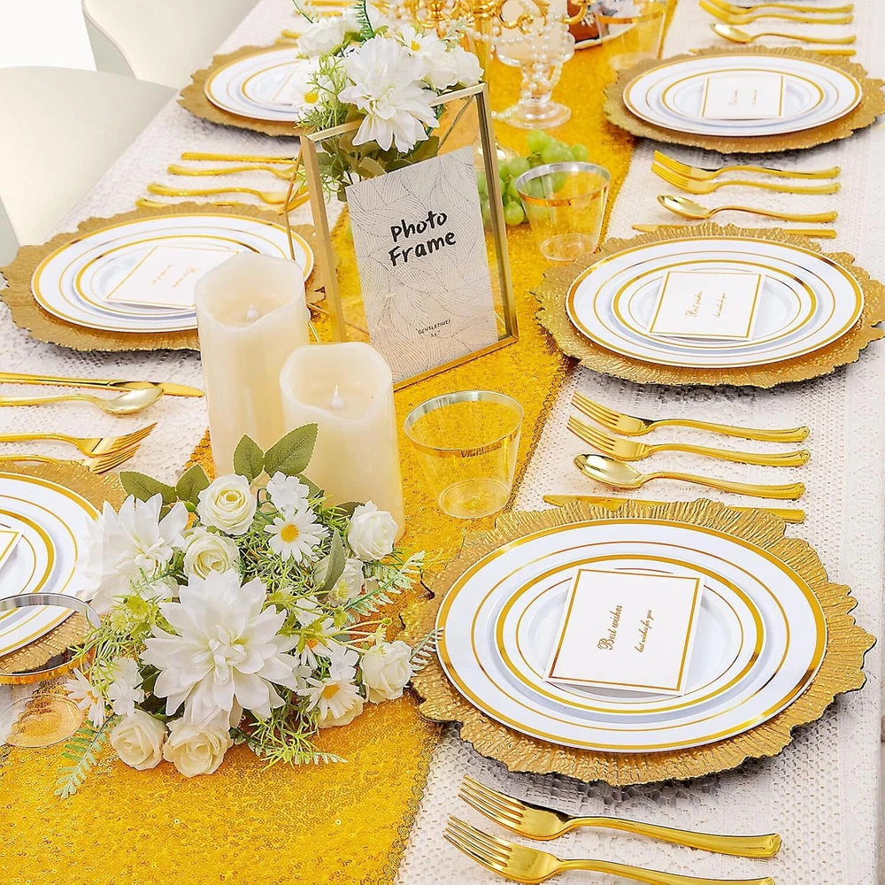 Pattern NO Collection Name Dinnerware set for 75 guests Finish Type Sealed Material Plastic Occasion All Occasions Shape Round Is Dishwasher Safe No About this item Premium Quality and Food-Grade: These disposable dinnerware set is crafted from premium, food-grade, BPA-free plastic, ensuring it is safe, non-toxic, and highly durable. The robust construction prevents cracking, bending, and breaking, even with heavy use Elegant Design for Every Occasion: These party plates with a gold rim scheme adds a touch of elegance and luxury to any event, making your gathering look sophisticated and stylish. The gold-rimmed design gives them a premium appearance, similar to fine porcelain Disposable and Hassle-Free: With these 75 guests plastic dinnerware set of gold plastic plates, cups, knives, forks, and spoons, you can host a party without the worry of cleanup. Simply dispose of the used items after the event, eliminating the need for time-consuming washing Versatile for Any Event: Whether it's a wedding, birthday party, company event, or a simple family meal, this elegant set of plastic plates and plastic silverware will add a touch of class to any occasion. Designed to be equally effective and attractive in both indoor and outdoor settings, it is a versatile choice for any type of gathering Ideal Choice for Party Decoration: WELLIFE heavy-duty party gold plates set add a unique, modern decorative style to your table, meeting the aesthetic requirements of all guests. The gold and white plates are perfect for weddings, parties, dinners, reunions, birthdays, engagements, Valentine's Day, Mother’s Day, and other special anniversaries. Additionally, the gold-rimmed plastic plates are ideal for Thanksgiving, Halloween, and Christmas dinners, elevating any celebration with their luxurious and refined look Pattern NO Collection Name Dinnerware set for 75 guests Finish Type Sealed Product Care Instructions Hand Wash Only, disposable
