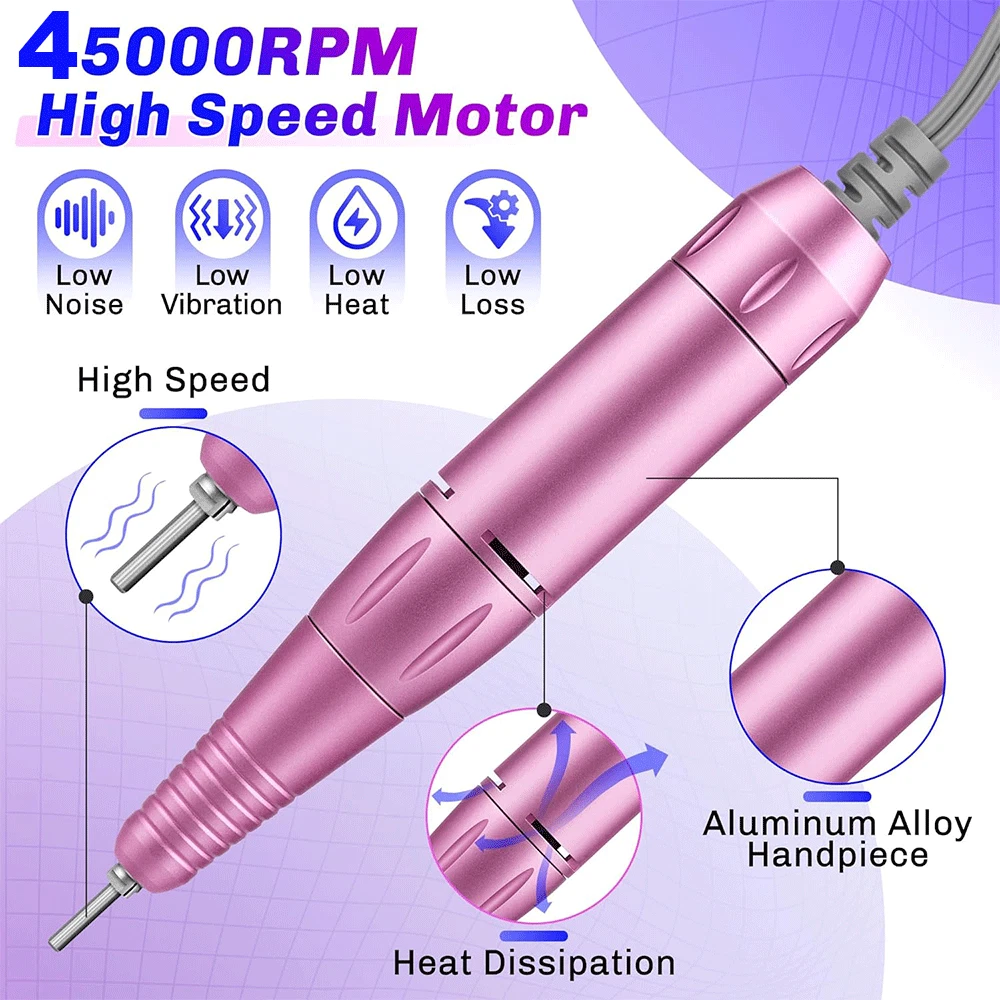 Specifications: Item: Rechargeable 45000 RPM Electric Nail File Nail Gel Polisher Nail Drill Machine Material: Aluminium Alloy+ABS Rechargeable Adaptor Input: 110/220-240V 50~60Hz Speed(RPM): 0~45000RPM Battery Capacity: 4000mA Power: 35W Nail Drill Charging Time: 40 Mins Use Time: 8 H Charging Port: USB Recharge Grinder Type : Suitable for 3/32 "drill bits Grinding Head: 6 types of grinding heads Product Size: about 5.6 x 4 x 9.5 Inch( Include Line) Item Weight: Approx 480g Package Includes : 1 x Portable Nail Drill Machine 1 x Handpiece 1 x USB Charger 6 x Drill Bits 6 x Sanding bands 1 x User Manual Feature : Powerful and adjustable speed/direction, 6 different metal drill bits, high speed up to 45000 RPM.Low heat, low noise, ultra-low vibration.Powerful smoothing for natural acrylic nails, gel polish dip powder nails, and exfoliation of dead skin and calluses. Professional home and salon use, carving, carving, routing, grinding, sanding, sanding, cutting, polishing, drilling, great for nail polish. High-definition LCD display, long battery life & power bank, large-capacity battery with brush less motor, prolonging more use time, this electronic nail machine can last for 8 hours after being fully charged for 40 min . Once charged, you can also use it as a power bank when your phone needs to be turned off. The high-definition LCD display on the rig shows the speed and remaining battery power, which is convenient for you to adjust the speed and reminds you to charge. Portable and lightweight design, you can easily take it in your bag. The rig comes with a hook so you can hang it on your clothing, or put it in your pocket or bag. The rig also has a pen holder for easy working in different environments. All-aluminum pen, easy to use, high-quality aluminum alloy long-life handle design, matte design can avoid all fingerprints, low noise, low vibration, low temperature operation, safe and reliable.Can be switched left or right, right or left handed. Variable speed control, suitable for different use requirements. Improved wireless smooth operation handle with flexible extension. Rotary lock blocks are used to secure the bit and quickly release the bit. The multi-functional manicure drill kit has a wide range of uses, DIY family salon gifts, convenient and elegant gift packaging, and stores various accessories. This is an excellent choice that you must have. Great for holiday gifts. Both professionals and amateurs. If you have any questions, please feel free to contact us, please do not leave any negative feedback, we will deal with it as soon as possible, thank you On Nov 10, 2024 at 20:23:42 PST, seller added the following information: