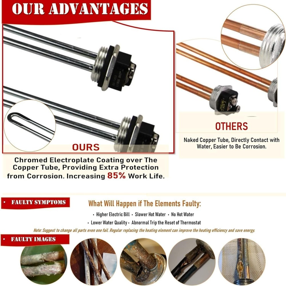 Water Heater Element, 4500W 240V, 2PCs Pack, Screw-in Type, High Watt Density... About this item! 2xPack 【CONTENTS】 - Screw-in HWD Universal Water Heater Element - Pack of 2, this thread watt density style heating element can be used in most replacement situations of the same power and voltage. Reduces lime scale build-up when used in areas with hard water. 【Power & Material】 4500W @ 240V, High Watt Density at 240V (W/sq. in. ): 208, Cold Resistance (ohm): 12.80, Outer sheath material: Copper Dimensions: Element Diameter 2.5cm, Element Length: Flange to Tip (in. ): 13-9/16", Mounting type: Threaded, Socket size: 1-1/2" 【Compatibility】 The Water Heater Element fits most models from American, AO Smith, Bradford White, Craftmaster (before 1991), GE, GS Wood (certain models), Kenmore, Lochinvar, Maytag, Mor-Flo, Reliance, Rheem, Richmond, Rudd, Sears, State, Whirlpool and hot water heaters manufactured after 1994.