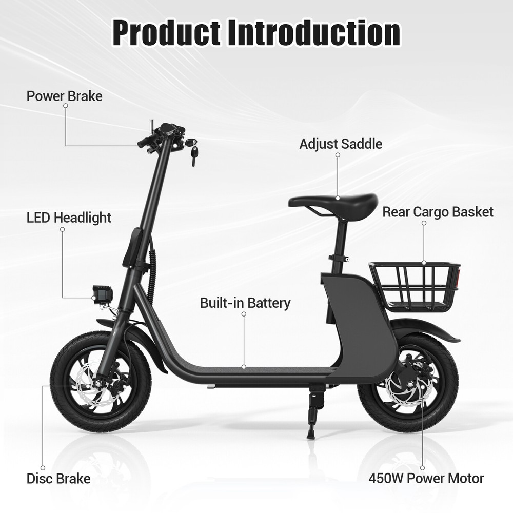 Upgrade 450W Adult Electric Scooter 36V Electric Moped Commuter w/Seat Foldable Feature: Powerful Motor & Long Range: The adult electric bike comes with a 450W powerful brushless motor and large 40 cells 10Ah Lithium-ion battery, enables a 20 miles range, and a max speed of 15.5 mph. Portable & Lightweight: The foldable electric bike can comfortably accommodate riders up to 265 lbs. This adult electric scooter can be easily folded and stored in the car trunk, which makes it perfect for commuters and students. Safe & Durable: With double braking systems, the front and back disc brake of the e-bike give you double safety. The 12" tires built for multi-terrain of daily use or outdoor activities. Smart Electric Scooter - The electric scooter comes with a smart LCD meter, which shows the speed, speed mode, battery life,lighting and etc. Safe Ridding at Night: Featuring LED headlights and taillights with left and right steering indicators, electric scooter is safe to ride even at night. Easy Assemble Required: The only assembly required is the seat and basket attachment. The handle bars are folded and just need to be erected. All tools are provided in the box. Sepcification: Bike Type Folding Bike, Electric Bike, Electric Scooter Age Range (Description) Adult Color BLACK Wheel Size 12 Inches Frame Material Aluminum Suspension Type Rear, Front Special Feature Portable, Lightweight, Foldable, Adjust Saddle Included Components Basket, Tool Kit Brake Style Dual Disc Brake Item Weight 36 Pounds Model Name R1 PRO Battery 36V 8AH Charging Time 5~6 Hours Max Speed 15.5 MPH Max Range 20miles Max Load 265 Lbs Package: 1 X E-Scooter wit Seat 1 X Charger 1 X User Manual 1 X Tool Kit The item is UL 2849 certified: https://productiq.ulprospector.com/en Delivery details Payment Terms of sales Feedback Contact us Delivery details 1. BUSINESS DAY MONDAY- FRIDAY FAST SHIPPING FROM USA. 2. All orders and payments received before 4PM EST (1PM PST) will be shipped the same business day. 3. No shipping on Saturday,Sunday or USA Public Holidays 4. No responsibility for any custom duty Payment We accept payment by PayPal only. Terms of sales 1. We offer a 60 day money back guarantee or exchange. 2. Buyer pays return shipping and we pay replacement shipping. 3. If you want to initiate a return,please contact us to get a returning address before sending the item back. Feedback 1. We strive to provide the best products and services. 2. Your positive feedback 5 stars DSR help us do better. 3. If anything about your transaction did not meet expectations, please CONTACT US and give us the opportunity to make things right. We are always here to help. Contact us Please do not hesitate to CONTACT US . You can message 24/7 on eBay for all questions and inquiries. We will get back to you within one business days at the latest from Monday- Friday.