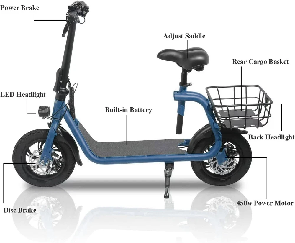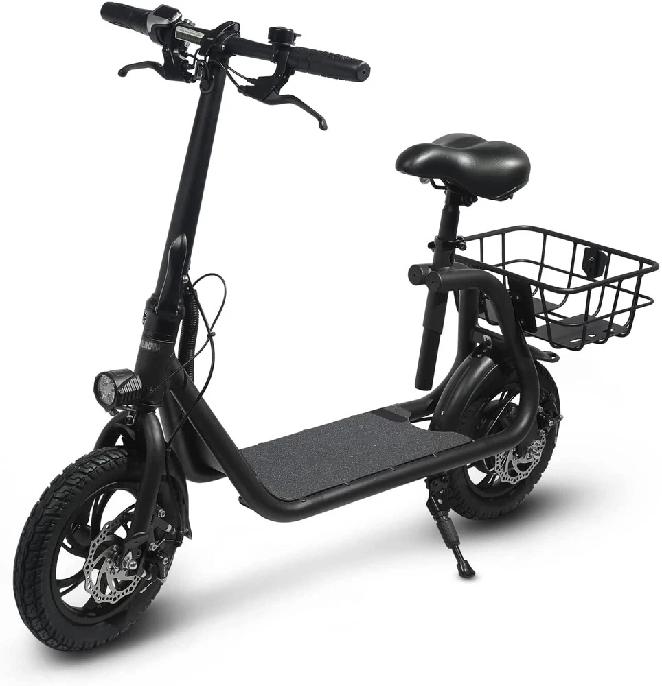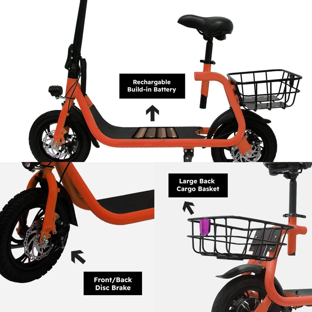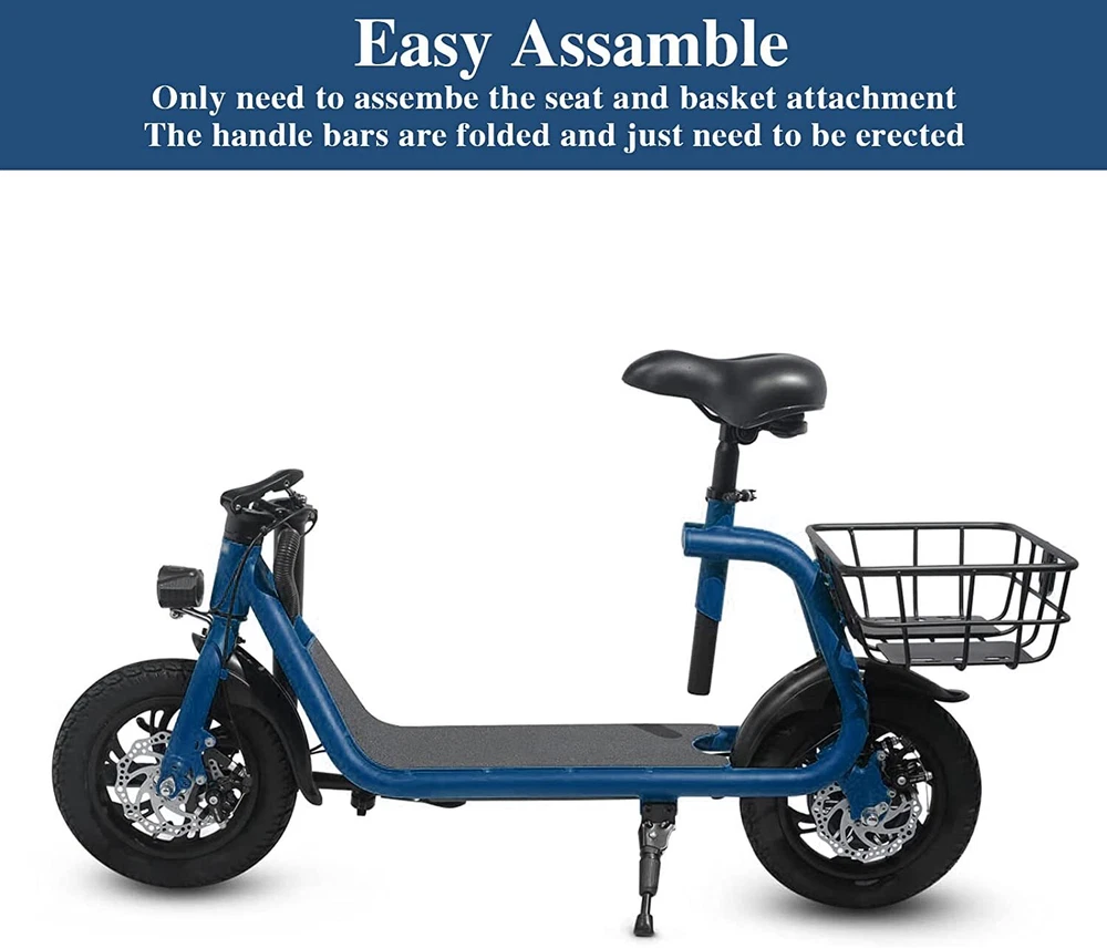 Folding 450W Sports Electric Scooter Adult with Seat Moped Commuter E-Scooter Product Features: Powerful Motor & Long Range: The adult electric bike comes with a 450W powerful brushless motor and large 40 cells 8.0Ah Lithium-ion battery, enables a 15-mile range, and a max speed of 15.5 mph. Portable & Lightweight: The foldable electric bike only weighs 42 lbs and can comfortably accommodate riders up to 265 lbs. This adult electric scooter can be easily folded and stored in the car trunk, which makes it perfect for commuters and students. Safe & Durable: With double braking systems, the front and back disc brake of the e-bike give you double safety. The 12" tires built for multi-terrain of daily use or outdoor activities. Detail Oriented Design: The E Scooter come with 13 x 11 inch rear carry basket and scooter deck, front LED light and rear reflectors for safety. Easy Assemble Required: The only assembly required is the seat and basket attachment. The handle bars are folded and just need to be erected. All tools are provided in the box. Product Specifications: Bike Type: Folding Bike, Electric Bike Age Range: Adult Wheel Size: 12 Inches Suspension Type: Rear, Front Included Components: Basket, Tool Kit Frame Material: Aluminum Brake Style: Disc Battery: Large 40 cells 8.0Ah Li Battery 36V Max Load: 265 lb Max Speed: 15.5 mph Max Range: 15 miles Package Listing: 1 x E Scooter 1 x Charger 1 x User Manual 1 x Tool Kit UL 2849 certified: https://productiq.ulprospector.com/en/profile/ Payment Shipping Return Feedback Question Payment We accept payment via Paypal ONLY. Immediate payment is required & Shipping will be arranged only your payment is cleared. Shipping Same business day dispatch if paid by 4 pm EST(1 pm PDT). No shipping on weekend or Public Holidays & No responsibility for any customs duty. Return We stand behind our products. Items can be returned for exchange or full refund within 60 days from the date you receive your item. Return shipping is the responsibility of buyer unless the return is a result of our mistake (i.e., your receive the wrong item or damaged item). We will pay for shipping replacement back to you if an exchange is requested. If you want to initiate a return, simply clicks "Return this item" next to the transaction in My eBay, chooses a reason, and prints a return shipping label and packing slip. We’re automatically notified. Feedback Please leave us a FIVE star and POSITIVE feedback if you are satisfied with our product and service. Neutral or negative feedback will not solve problems happily. We believe communication will fix problems and hope every customer can have a good purchasing experience. Question All ebay message will be responded within 1 business day or less, except weekends and holiday!
