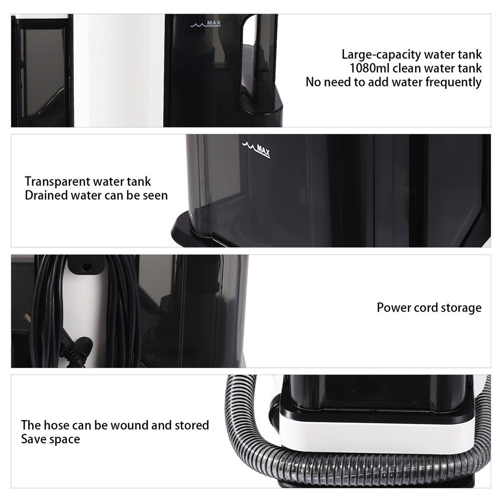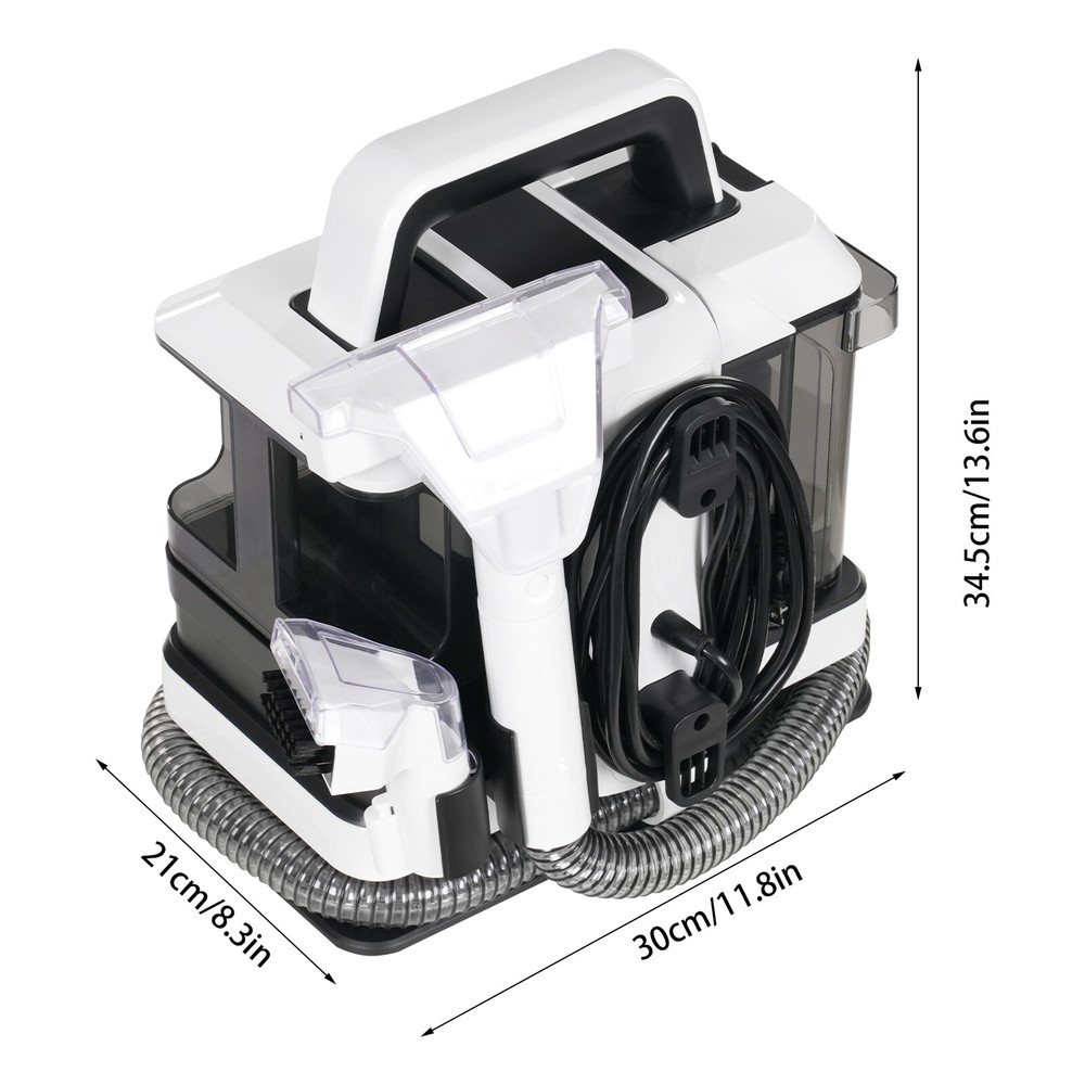 450W Portable Carpet Couch Deep Cleaner Waterproof Handheld Rug Cleaner 1080ML Description Do you want to give your home a new look? Then try our cleaner machine. With its high-quality material, powerful cleaning function, and equipped with 2 different cleaning brushes to meet your cleaning needs, it can clean every crevice to the maximum and give you an efficient cleaning experience, so it will be your ideal choice! Key Features Sturdy and Durable: It consists of high-quality plastic and iron with an injection molding process, which is durable, comfortable to use, and resistant to rust and corrode, so it can remain beautiful and practical for a long time. Cleaning Assistant: 2 cleaning brushes(big and small cleaning) allow you to install them on the product to clean different scenarios, which not only meets your cleaning needs but also gives you a clean home environment and provides health protection for your children and family. Powerful Function: It has a rated air intake power of 450W, a maximum suction power of up to 11Kpa, an airflow rate of up to 2.53Gal/s, a suction speed of up to 14.08oz/min for large brushes, and 13.02oz/min for small brushes, which provides you with efficient cleaning. Elaborate Design: Two tanks, one for clean water (38oz) and the other for dirty water after cleaning (29.92oz), effectively separate clean water from sewage for better cleaning results. The clear design also makes it easy for you to check the capacity and make adjustments promptly. Space-saving: The water hose can be wrapped around the storage slot of the product housing, together with its compact size (11.81*8.27*13.58 inches), it can be placed under a table or in a cabinet without taking up too much space. Easy to Clean: Thanks to its simple construction, smooth surface, detachable cleaning heads and deep self-cleaning function, you can easily clean this product at ease. Protective Package: We use reformed paper pulp for inner box packaging, designed to maximize the protection of the product from damage during transportation. Details Long Power Cord and Water Hose: The 3.94ft water hose and 16.4ft power cord provide a larger cleaning area and flexible operation. Convenient Handle: This ergonomic handle is not only comfortable to grip but also convenient for you to move the product. Handle Holder: It helps you to organize your cleaning heads more conveniently. Organizer Ports: Two ports for power cord wrap help to keep the power cord organized. Application It can be used in homes, hotels, clubs, restaurants, and so on to clean stains, debris, dirt, pet hair, etc. from sofas, carpets, curtains, beds, cushions, dolls, office chairs, cars, and more. Circumstances May the Carpet Cleaner Machine Leak 1. The water tank is not installed tightly. 2. The hose connection is not firmly installed. 3. The water tank is clogged. 4. The connection between the water tank and the machine is blocked. How to Deal with Leak 1. Pls install the water tank correctly. 2. Ensure that the buckle of the installation interface is firmly installed. 3. Clean the water tank in time to avoid accumulation of residues. 4. Clear the blockage in time of the interface of the water tank and machine. How to Clean and Prevent Bacterial 1. Press the self-cleaning button to clean the brush head and hose. 2. Clean the water tank promptly to ensure there are no blockages. How to Deal with Spots and Stains 1. Pour the cleaner directly onto the stain. 2. Turn on and spray water on the stain. 3. Turn off and scrub with a brush first. 4. Turn on the switch to suck away the dirty water. Specification Model: JCE002 Color: White and Black Material: Plastic and Iron Process: Injection Molding Style: Modern Type: Handheld Mount Type: Free Standing Power Source: Corded Electric Plug: US Standard Rated Voltage: 110V Rated Power: 450W Clean Water Tank Capacity: 1080ml/ 38oz Dirty Water Tank Capacity: 850mL/29.92oz Noise: About ≤80dB Max. Suction Force: 11KPA Maximum Air Flow: 11.5L/2.53Gal/s Suction Speed (Big Brush): 400ml/14.08oz/min Suction Speed (Small Brush): 370ml/13.02oz/min Number of Cleaning Brushes: 2 Waterproof Level : IPX4 Water Hose Length: 1.2m/3.94ft Power Cord Length: 5m/16.4ft Operating Radius: 6.2m/20.34ft Overall Size: 30*21*34.5cm/ 11.81*8.27*13.58in Package Size: 37*36.5*26cm/ 14.57*14.37*10.24in Gross Weight: 5.3kg/11.68lbs Net Weight: 4.8kg/10.58lbs Package Included 1* Cleaner Machine 1* English User Manual Notes Please note that this product should only be used wet. Please use a neutral cleaner (not included). Please read the English user manual and the labels on the product carefully and pay attention to the safety precautions inside. When you do not use the machine, please turn off the power promptly, and clean the machine after maintenance, if you have just received a new machine, we recommend that you let the machine stand at normal room temperature before using it. Please allow the slight color difference caused by the shooting light and 1-3 cm error due to manual measurement, and make sure you do not mind before ordering. Payment Delivery details Terms of sales About us Contact us Payment We accept ebay payment 。 Fees such as import duties, taxes are not included in the item price or shipping costs. These charges are the buyer's responsibility. Delivery details Shipping: 2-9 working days to: USA Terms of sales We maintain high standards of excellence and strive for hundred percent customer satisfaction. Feedback is very important to us. We hope that you contact us immediately before you give neutral or negative feedback, so that we can address your concerns. It is impossible to address issues if we do not know about them! About us Your satis faction is our ultimate goal. We work hard to earn your trust and future business. Our certified technicians have tested each item before shipping. The unit comes with 1 year limited warranty on all manufacturing defects. a) If you receive a defective item, you may return it or 