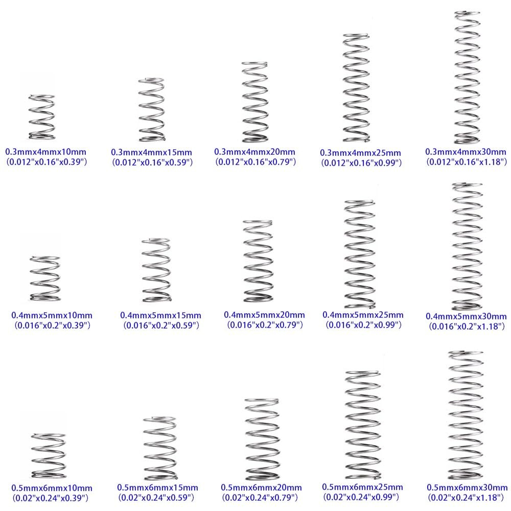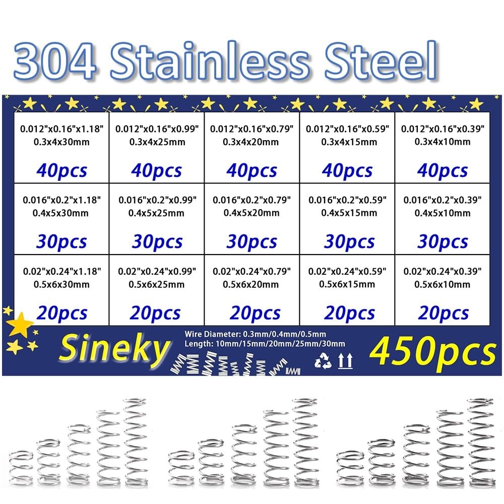 [Item] -- 304 Stainless Steel Compression Springs Assortment Kit [Description] -- 15 different sizes, totally 450 springs. [Size] -- Wire diameter * Outer diameter * Free length 0.3mm*4mm*30mm (0.012"x0.16"x1.18") -- 40pcs 0.3mm*4mm*25mm (0.012"x0.16"x0.99") -- 40pcs 0.3mm*4mm*20mm (0.012"x0.16"x0.79") -- 40pcs 0.3mm*4mm*15mm (0.012"x0.16"x0.59") -- 40pcs 0.3mm*4mm*10mm (0.012"x0.16"x0.39") -- 40pcs 0.4mm*5mm*30mm (0.016"x0.2"x1.18") -- 30pcs 0.4mm*5mm*25mm (0.016"x0.2"x0.99") -- 30pcs 0.4mm*5mm*20mm (0.016"x0.2"x0.79") -- 30pcs 0.4mm*5mm*15mm (0.016"x0.2"x0.59") -- 30pcs 0.4mm*5mm*10mm (0.016"x0.2"x0.39") -- 30pcs 0.5mm*6mm*30mm (0.02"x0.24"x1.18") -- 20pcs 0.5mm*6mm*25mm (0.02"x0.24"x0.99") -- 20pcs 0.5mm*6mm*20mm (0.02"x0.24"x0.79") -- 20pcs 0.5mm*6mm*15mm (0.02"x0.24"x0.59") -- 20pcs 0.5mm*6mm*10mm (0.02"x0.24"x0.39") -- 20pcs [Customer Service]- If you need any advice or product support, please contact our excellent customer service team who will happily respond to your question within 24 hours. [Anti-rust Material] --Our compression springs are made of 304 Stainless Steel, which is reliable and reusable. It is very resistant to oxidation, corrosion and rust for a long service time. [Package Include] -- 15 different sizes spring assorted in individual compartment, total 450 pieces in box. [Easy to Carry] -- Comes in a transparent box, which is light and small, easy to carry and store. 15 compartment storage with size label marked, you can pick up your target size easily and quickly. [Fit Most Use] -- 15 sizes would be completely enough for all your DIY project and Home repair, such as electrical equipment, 3D printer, piano, pens, toys, scissors, pliers, home tool, etc. [Size: A×B×C] -- A is Wire diameter, B is Outer diameter, C is Free length: [0.012"x0.16"x1.18"]; [0.012"x0.16"x0.99"]; [0.012"x0.16"x0.79"]; [0.012"x0.16"x0.59"]; [0.012"x0.16"x0.39"]; [0.016"x0.2"x1.18"]; [0.016"x0.2"x0.99"]; [0.016"x0.2"x0.79"]; [0.016"x0.2"x0.59"]; [0.016"x0.2"x0.39"]; [0.02"x0.24"x1.18"]; [0.02"x0.24"x0.99"]; [0.02"x0.24"x0.79"]; [0.02"x0.24"x0.59"]; [0.02"x0.24"x0.39"];