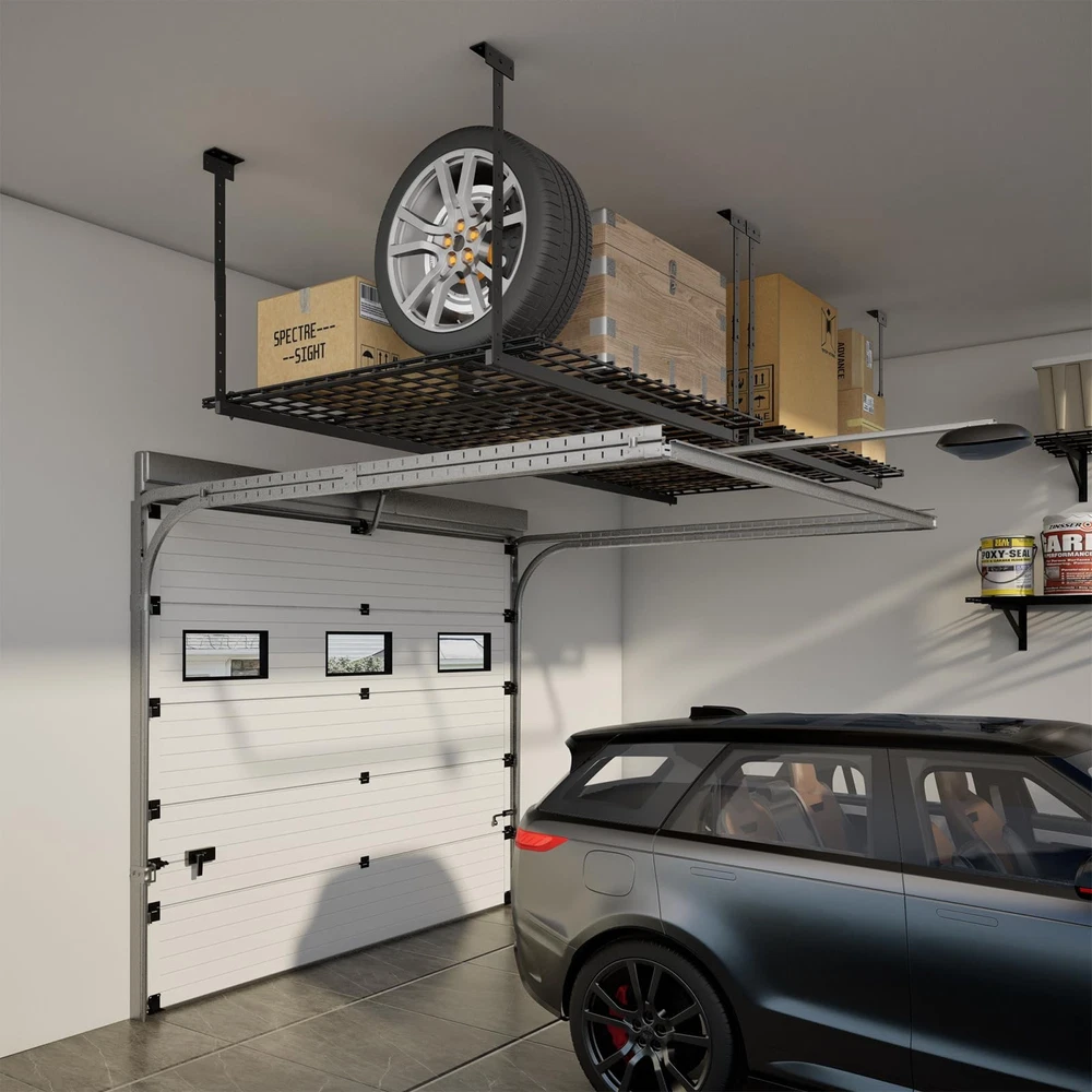 ceiling rack đŚă30+ Cubic Feet Organized Storageă- 45"x45" garage overhead storage creates massive 30+ cu.ft capacity â store 8-12 large plastic bins, luggage sets, camping coolers, or holiday decorations with smart vertical space management. đăHeavy-Duty 250 lbs Capacityă- Crafted with industrial-grade cold-rolled steel, our garage ceiling storage rack securely holds up to 250 lbs. Perfect for bulky seasonal items, toolboxes and outdoor gear. đ§ăQuick Installationă- On any Ceiling Joists â¤42". Pre-drilled universal mounting brackets work with all standard joist spacing. No complex measurements â install this overhead garage storage rack in under 1 hour using basic tools. đă17"-28" Height Adjustment ă- Customize your garage ceiling storage space with 11-inch vertical flexibility. Clear vehicles or shelves effortlessly while maximizing overhead storage efficiency. đĄď¸ăWorry-Free Supportă- Your satisfaction is our priority! overhead garage storage come with 24/7 customer service and a 1-year limited warranty. If any part fails, contact us for instant replacementsâguaranteed!