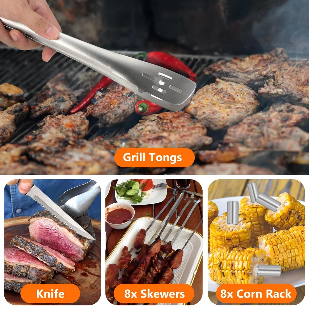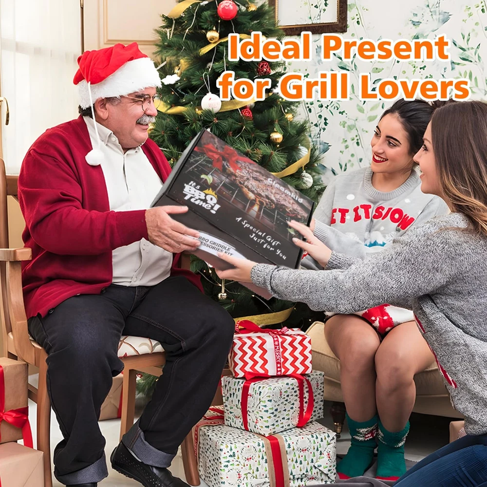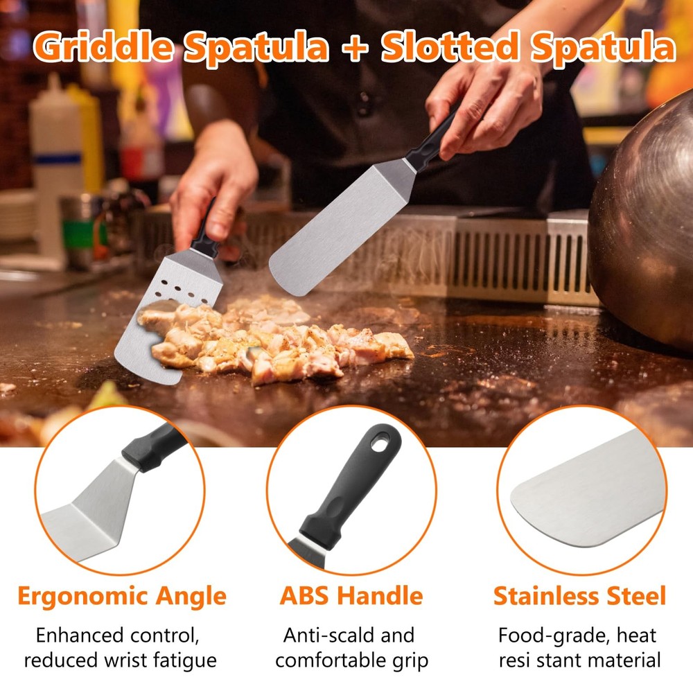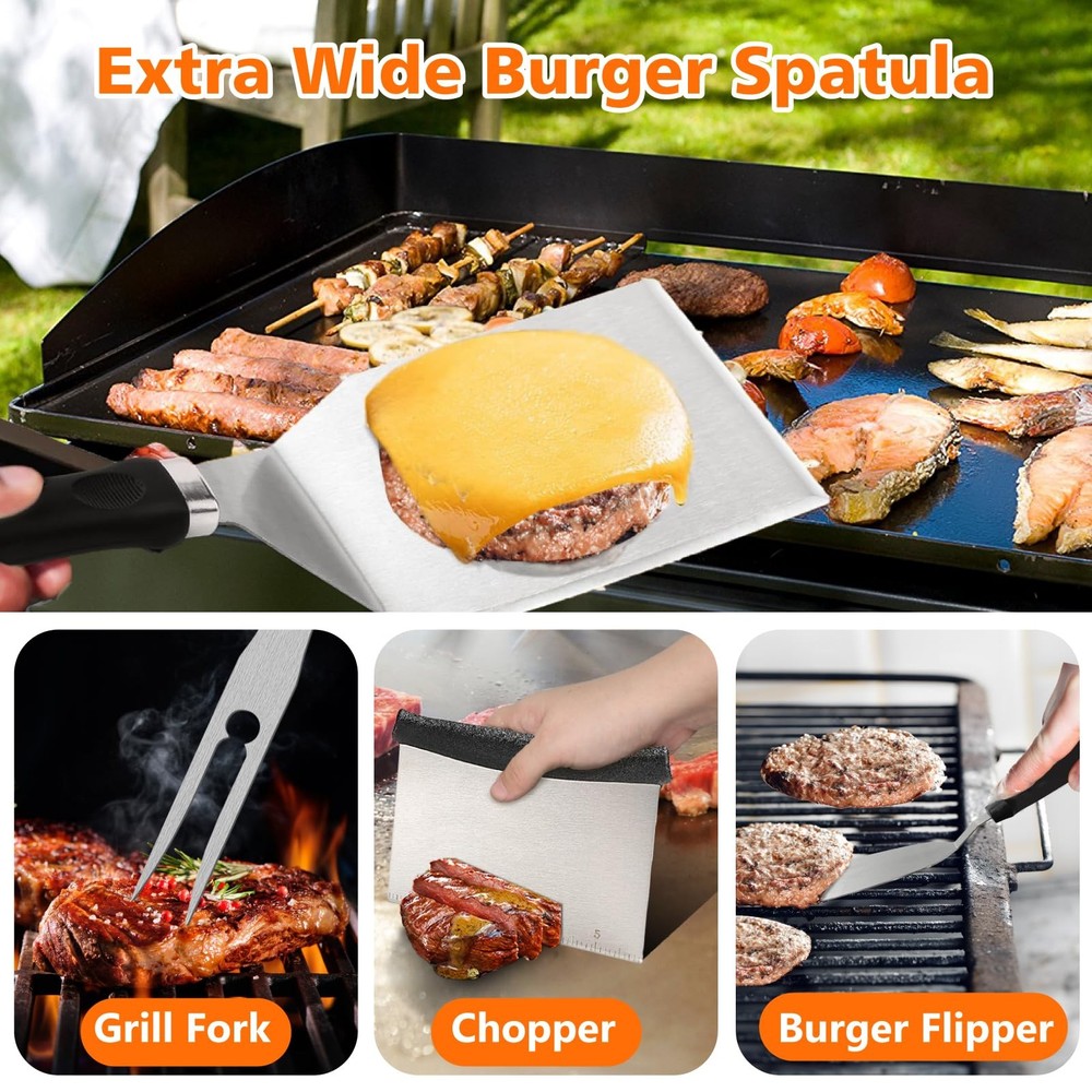 45-Piece for blackstone Griddle Accessories Kit Description: Enhance your outdoor cooking experience with our comprehensive 45-piece for blackstone Griddle Accessories Kit. This set includes essential tools for any camp chef, featuring a grill lid, burger press, spatulas, grill tongs, and much more—all conveniently packed in a carry bag. Ideal for professional hibachi-style cooking, this kit makes the perfect gift for men who love grilling. Included Items: Grill Lid: For even heat distribution and versatile cooking. Burger Press: Perfect for shaping uniform burgers. Long Spatula: Ideal for flipping and serving. Slotted Spatula: For draining excess grease. Large Burger Spatula: Specifically designed for flipping large patties. Small Spatula: For precise handling of smaller items. Dough Cutter: For cutting dough and other prep tasks. Grill Tongs: For secure flipping and handling of food. Grease Brush: For applying oils and sauces. Meat Fork: For turning and probing meats. Corkscrew: For opening wine bottles. 2 Squeeze Bottles: For dispensing sauces and oils. 4 Egg Rings: For perfect fried eggs. 2 Seasoning Bottles: For adding spices and seasonings. 6 Corn Holders: For holding corn on the cob. 8 Hooks: For hanging tools and accessories. 8 Meat Skewers: For grilling kabobs. Cleaning Brush: For maintaining your griddle surface. Carry Bag: For easy transport and storage. Instruction Manual: Detailed instructions for use. Color Box Packaging: Ready for gifting. Key Features: Comprehensive Set: Includes everything you need for professional-level grilling. High-Quality Tools: Made from durable materials to withstand rigorous use. Portable Design: Comes with a carry bag for easy transportation. Ideal Gift: Perfect for men who enjoy outdoor cooking and grilling. Easy Maintenance: Most items are dishwasher-safe; hand-wash the cast iron burger All-in-one BBQ Burger Grill Kit: This 45-piece griddle tool kit includes 12-inch melting dome,burger smasher, burger flipper, large burger spatula, griddle spatula, slotted spatula, chopper, knife, oil brush, grill tongs, BBQ fork, 8x BBQ skewers, 8x corn holders, 4x egg rings, cleaning brush, 8x hooks, and a convenient storage bag. All accessories for blackstone griddle you need is here. High-Quality Stainless Steel: Our grill accessories for blackstone are crafted from heavy-duty 304 stainless steel, ensuring compatibility for blackstone griddles. griddle accessories for blackstone are BPA-free, exceptionally sturdy, rust-resistant, heat-resistant, and built to last. Diverse and Essential black stone grilling accessories: Our grill set includes griddle spatulas for efficient turning, lifting, and frying; a burger smasher for creating evenly shaped, juicy patties; a burger flipper for effortless flipping and serving; a chopper for precise cutting and scraping; a 12-inch melting dome for even meat cooking; and various egg ring shapes for added culinary fun. Easy to Clean & Store: Our BBQ grill tools are non-stick and dishwasher-safe, making cleanup a breeze. Our griddle accessories kit includes 8 hooks for effortless hanging and organization. Plus, it comes with a spacious storage bag that fits all the items for easy carrying and storage. Professional grilling accessories for outdoor grill. Perfect Gift for Griddle Lovers: This BBQ grill burger accessories kit is a thoughtful present for those who love crafting delicious burgers on their griddle stones or Camp Chef griddle. An ideal Father's Day gifts, Thanksgiving gifts, Christmas gifts, and more. Perfect grilling gifts for men. Considerate birthday gift for dad.